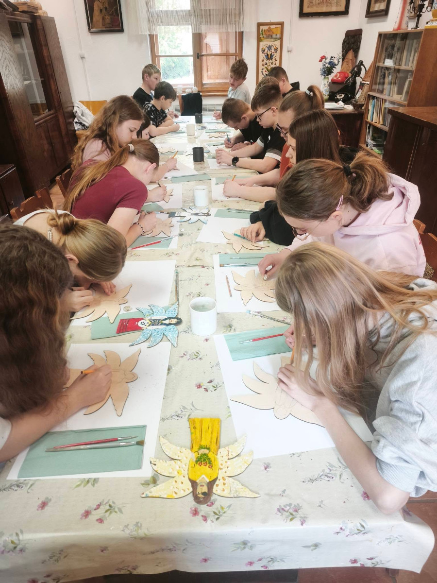 W części praktycznej uczniowie samodzielnie malowali drewniane anioły farbami akrylowymi, inspirując się stylem artysty. Na zakończenie każdy uczestnik otrzymał własnoręcznie wykonane dzieło jako pamiątkę twórczego spotkania z kulturą Kaszub.