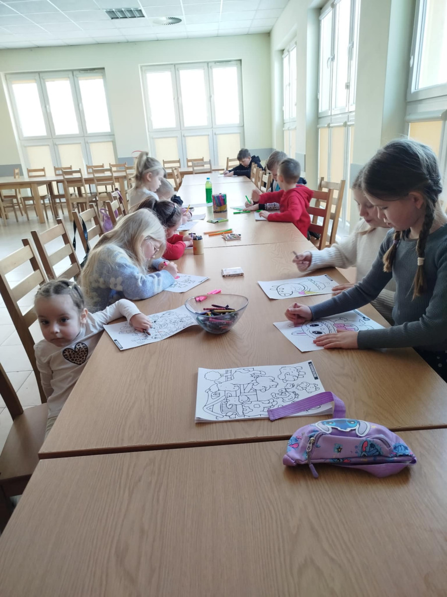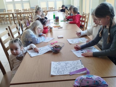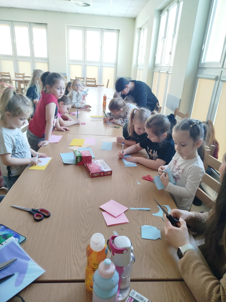 Wtorkowe spotkanie poświęcone było przygotowywaniu laurek dla Babć i Dziadków. Dzieci z dużym zaangażowaniem tworzyły piękne, kolorowe prace, a czas umilały im także różnorodne zabawy ruchowe.