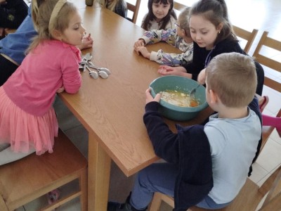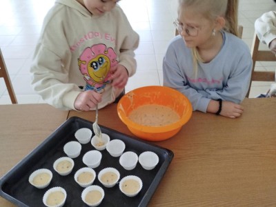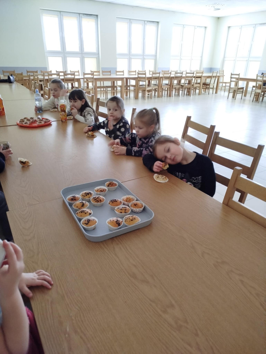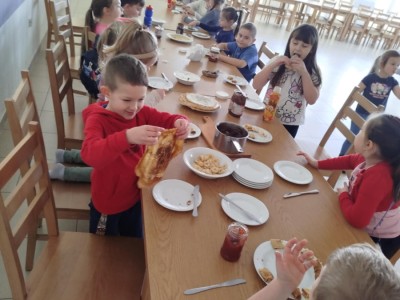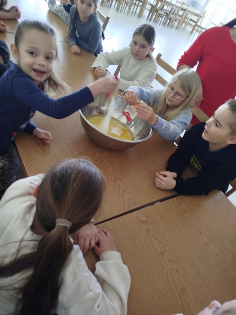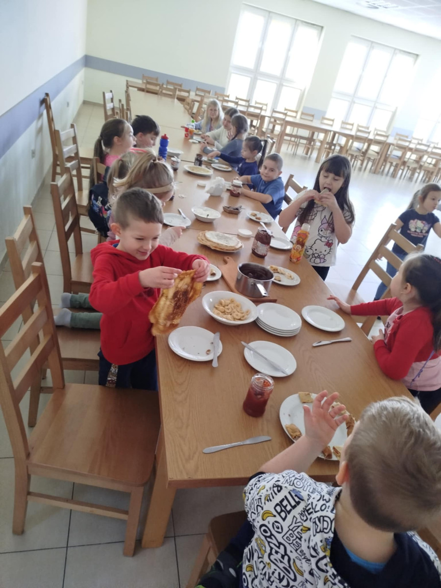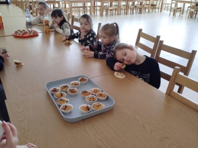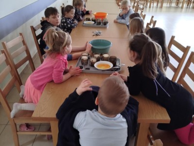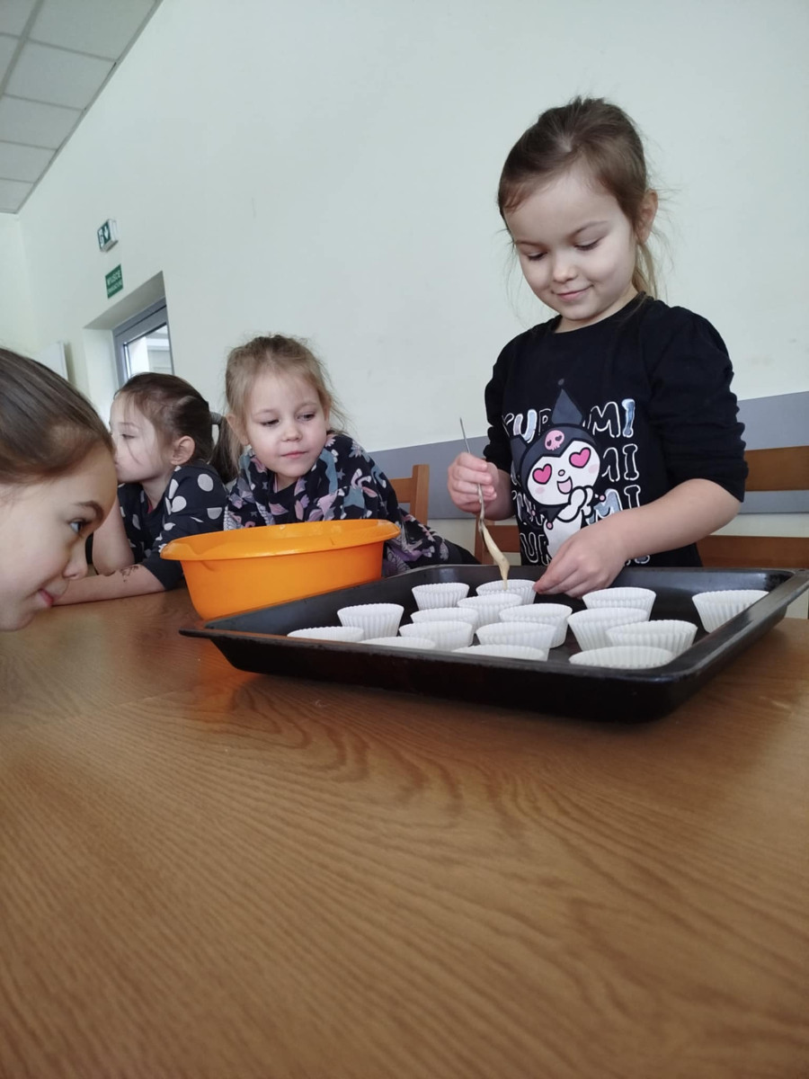 Czwartek i piątek były dniami pełnymi kuchennych słodkości. Przy niewielkiej pomocy dorosłych dzieci upiekły naleśniki oraz przygotowały babeczki, które z apetytem zjadły. Po słodkich przyjemnościach przyszedł czas na gry planszowe i zabawy ruchowe.