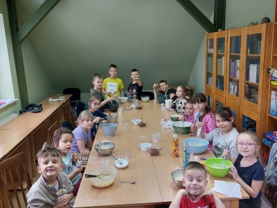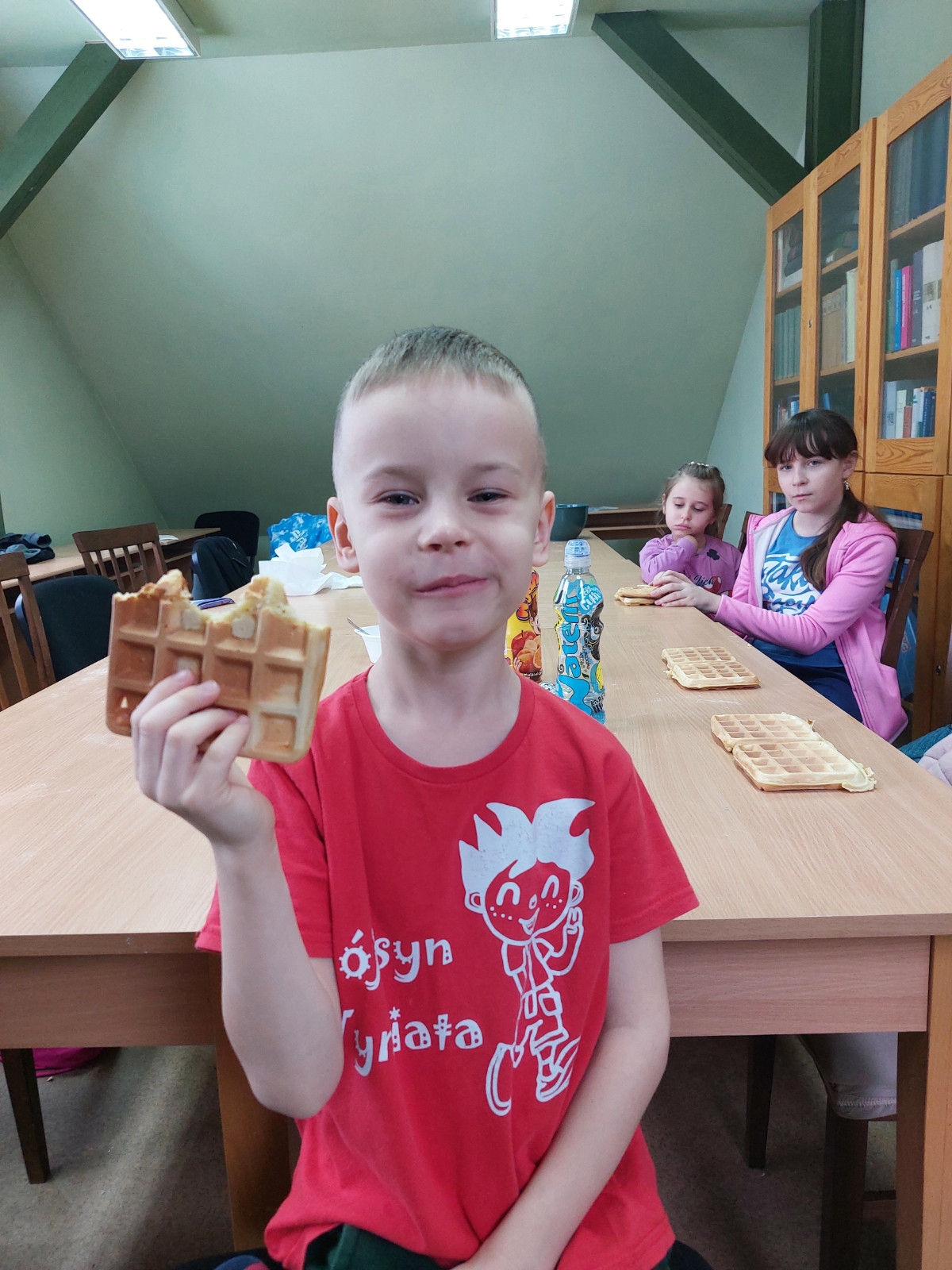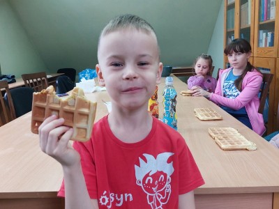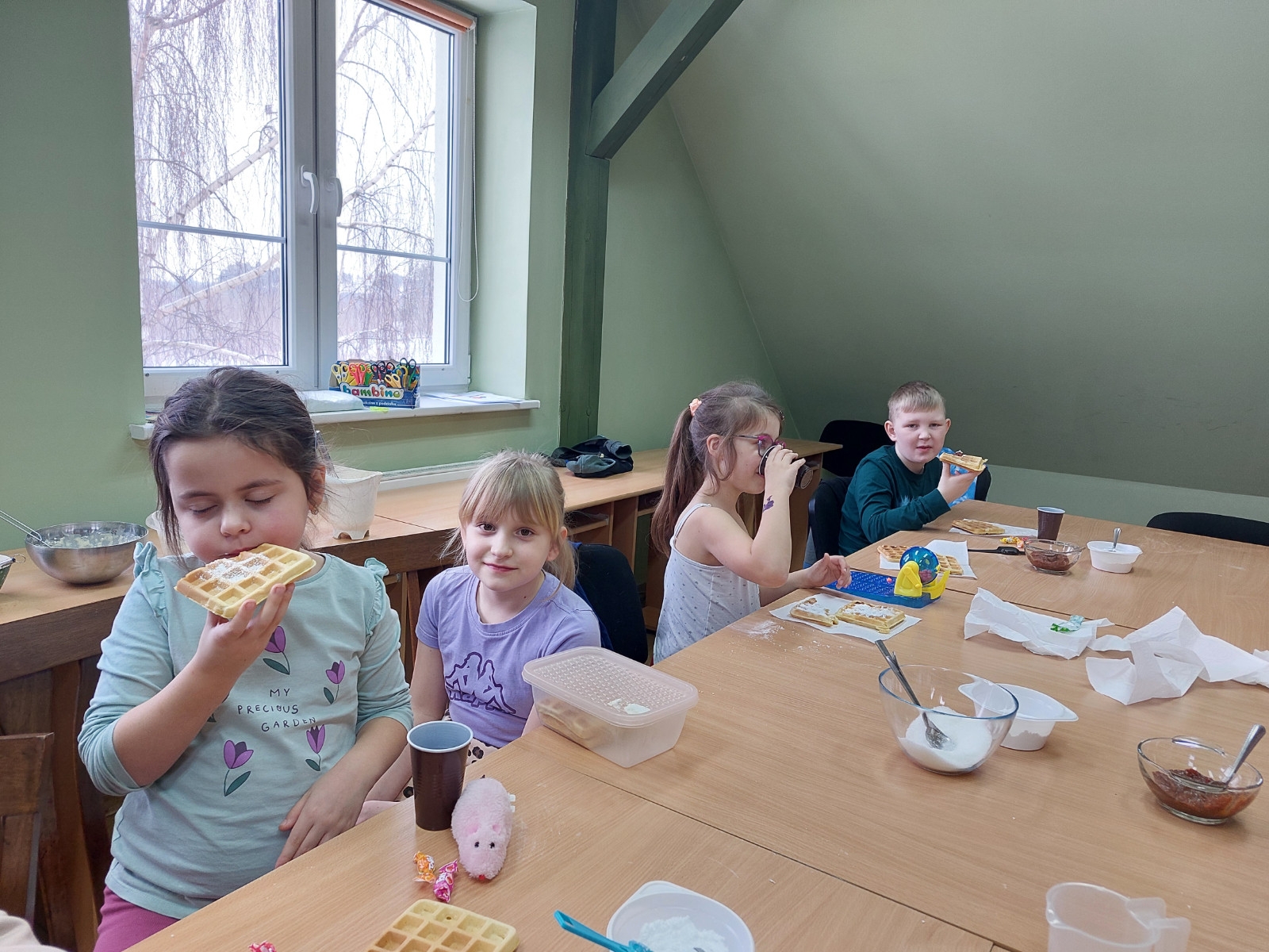Zwieńczeniem ferii był piątek, upływający pod znakiem kulinarnych pyszności. Ostatni dzień zajęć wypełnił zapach i smak świeżo pieczonych gofrów, które stały się ulubionym punktem programu wszystkich uczestników.