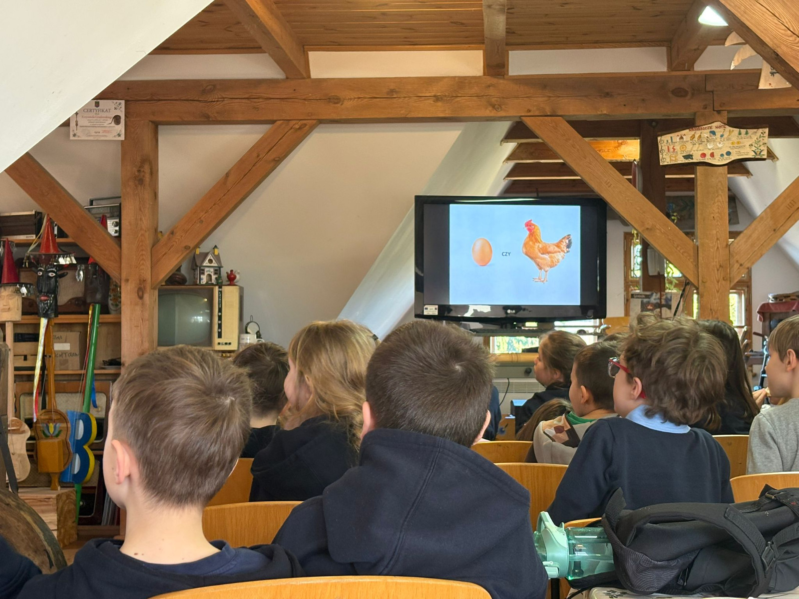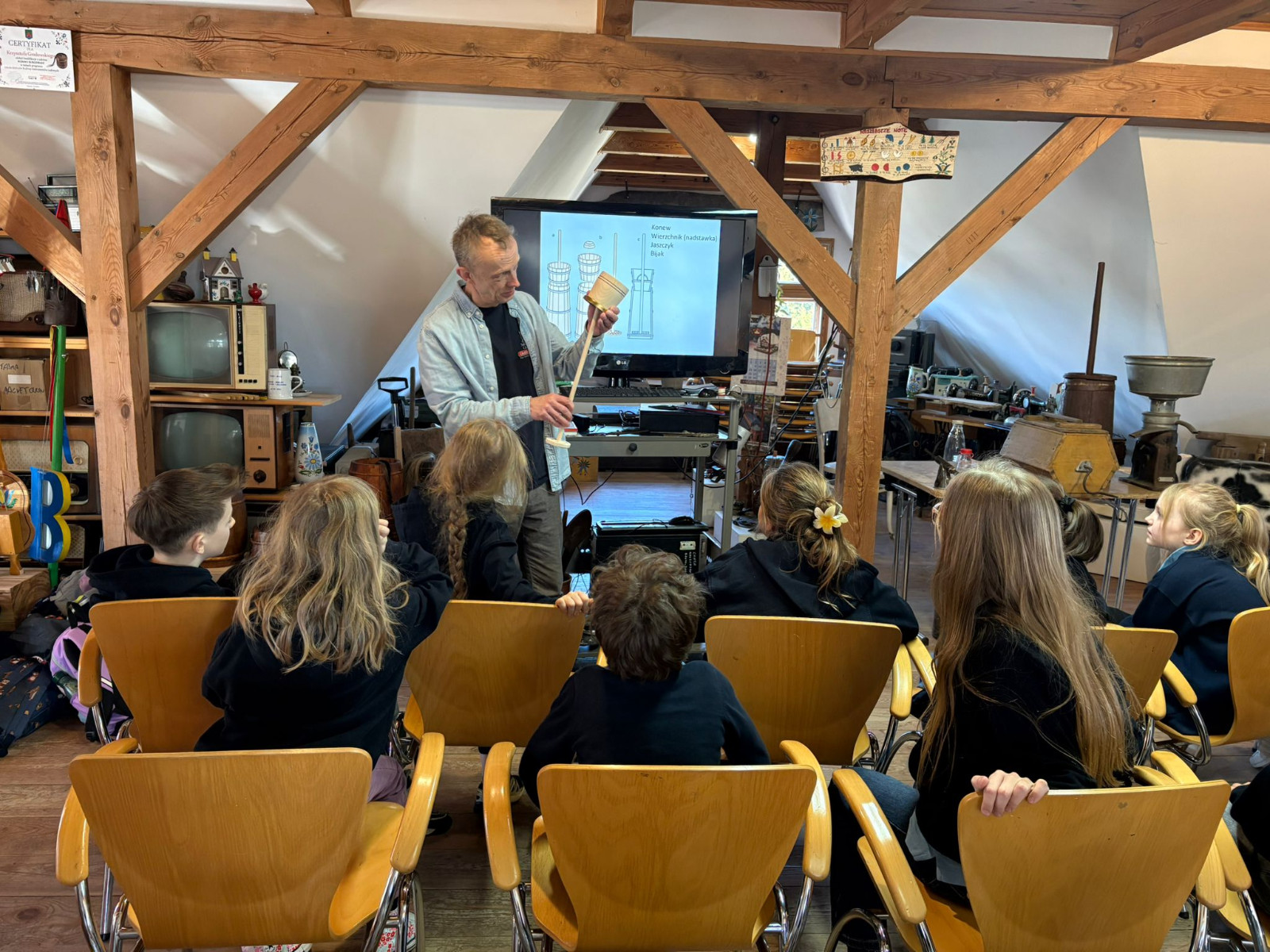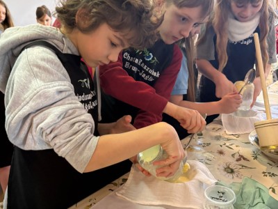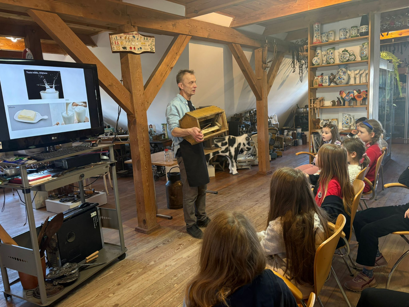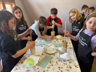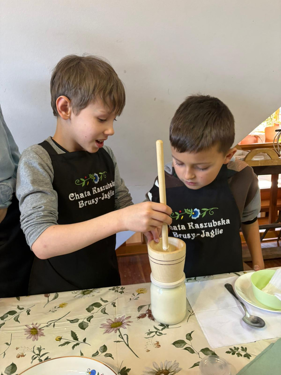 Podczas spotkania dzieci poznały dawny sposób wyrabiania masła – od ubijania śmietany aż po uzyskanie gotowego produktu. Uczniowie z dużym zaangażowaniem uczestniczyli w zajęciach, ucząc się poprzez działanie i wspólną zabawę.