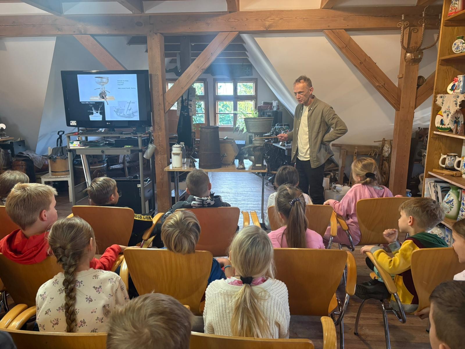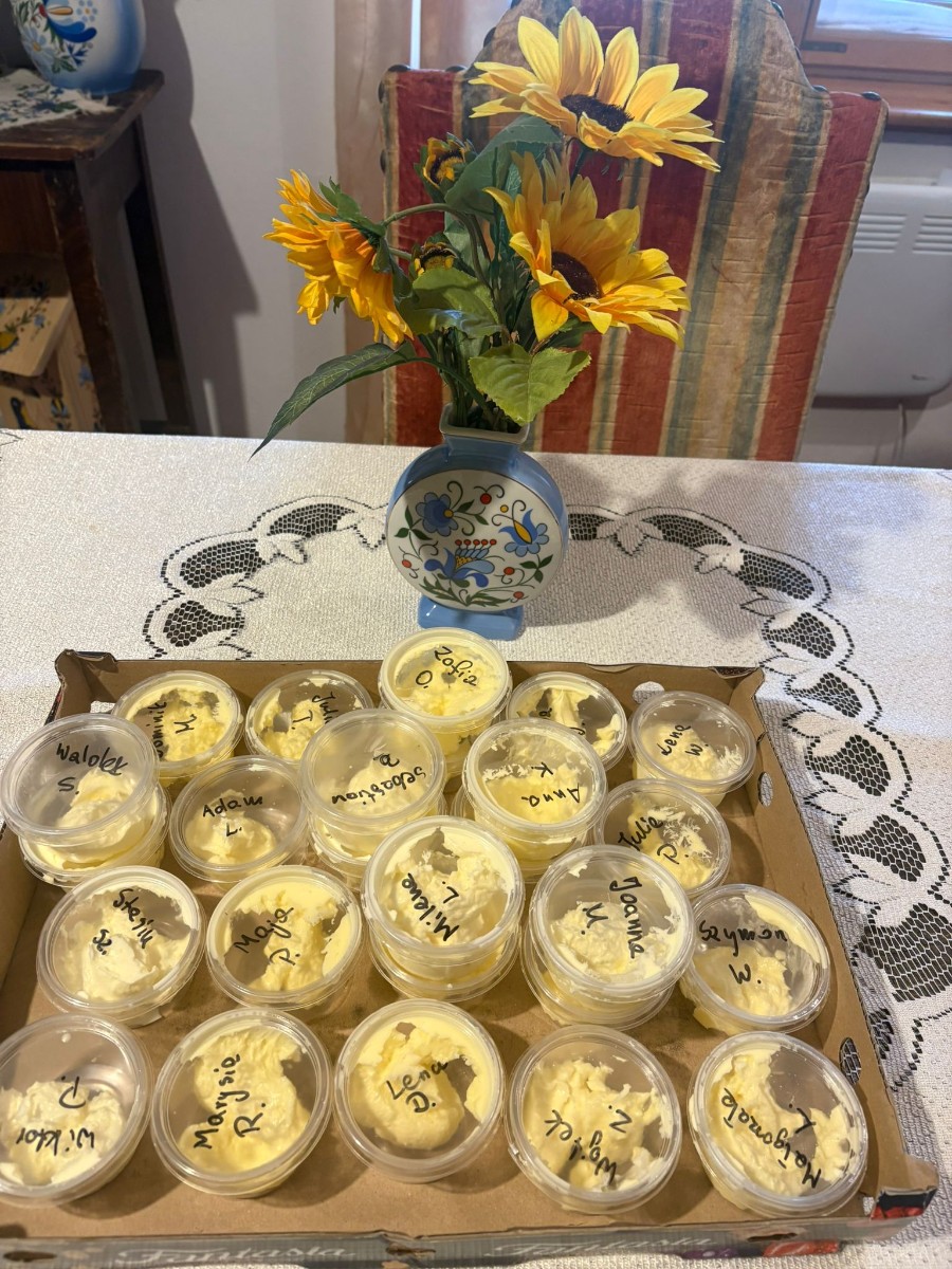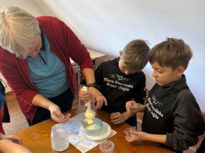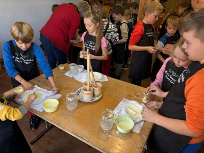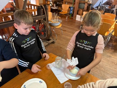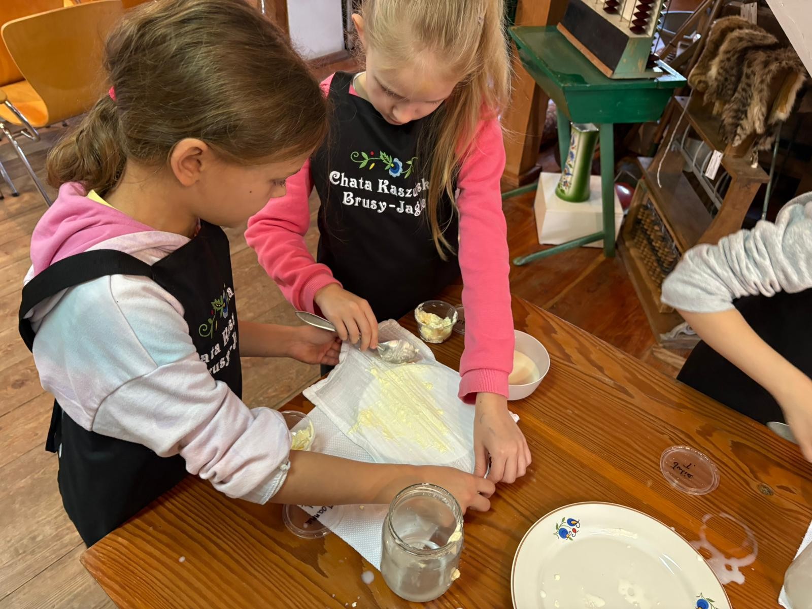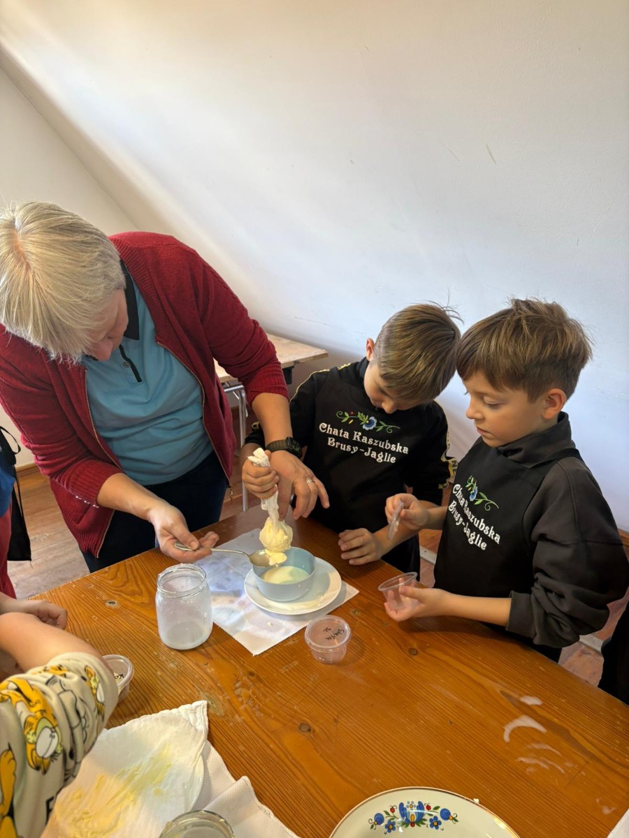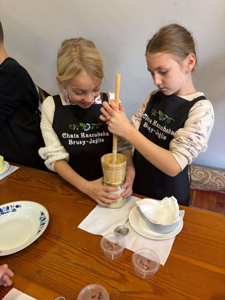 Podczas zajęć dzieci poznały tradycyjny sposób wyrabiania masła – od ubijania śmietany aż po powstanie gotowego produktu. Uczniowie z dużym zaangażowaniem uczestniczyli w każdym etapie pracy, a własnoręcznie przygotowane masło zabrali do domu.