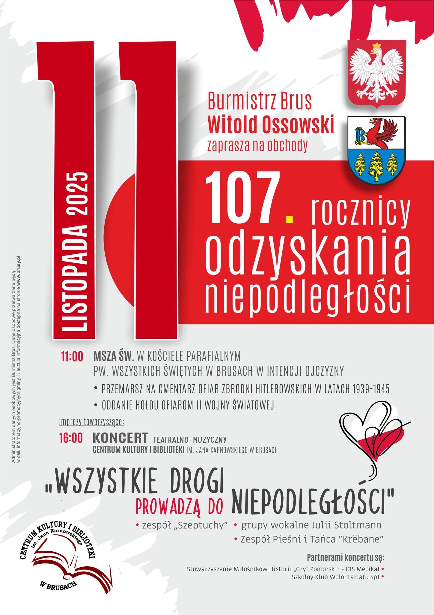 16:00 – Koncert teatralno-muzyczny w Centrum Kultury i Biblioteki im. Jana Karnowskiego w Brusach pt. „Wszystkie drogi prowadzą do niepodległości”. Wystąpią: 🎵 Zespół „Szeptuchy” 🎤 Grupy wokalne Julii Stoltmann 💃 Zespół Pieśni i Tańca „Krebane”