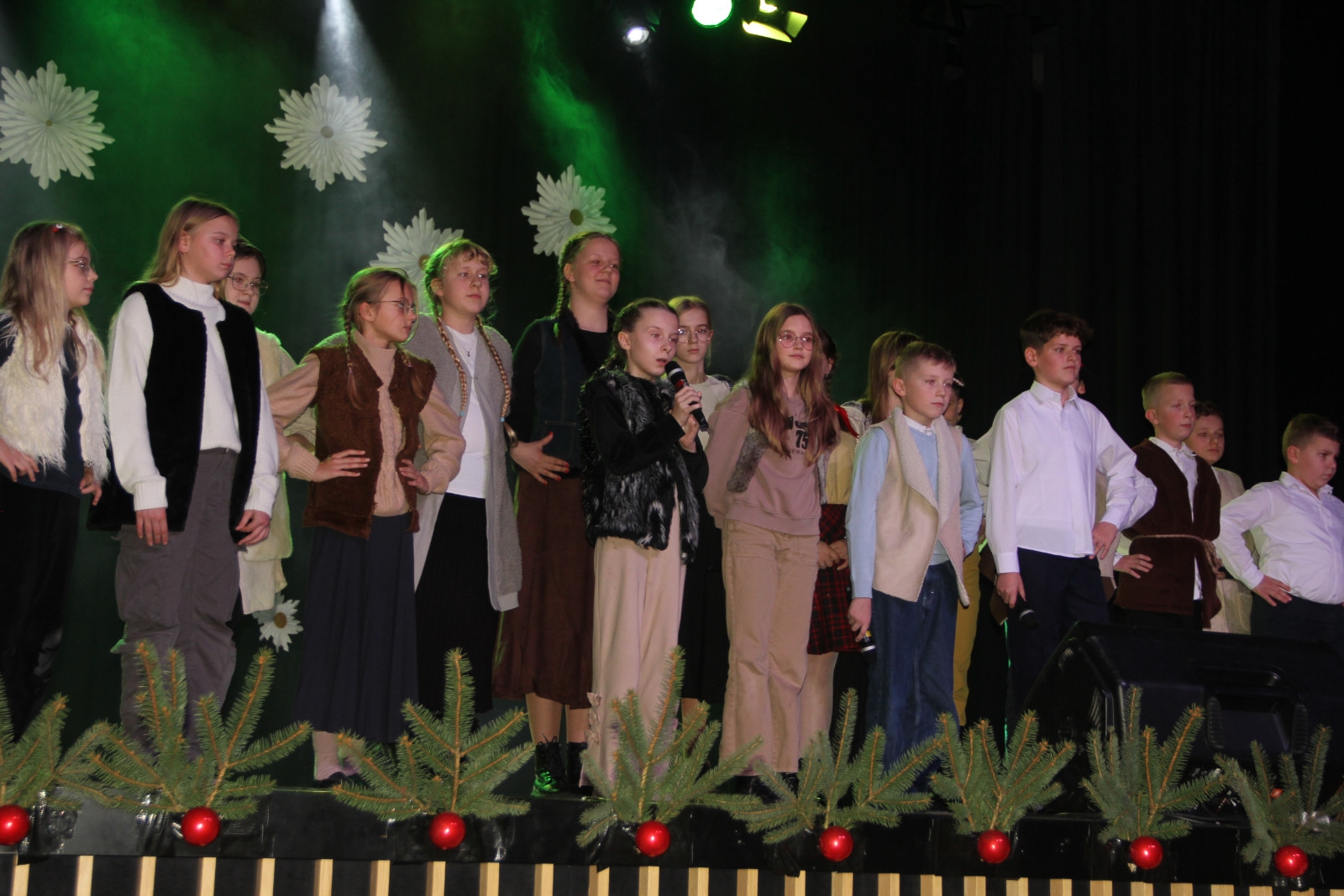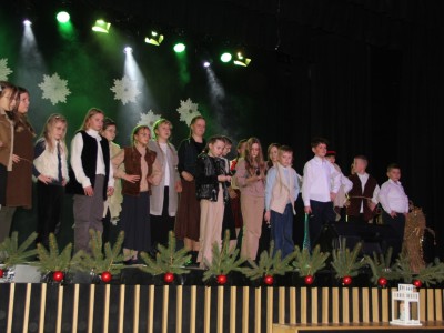 Scenariusz prowadził publiczność przez kolejne etapy tradycyjnego Adwentu – od andrzejek, poprzez roraty i mikołajki, aż po Wigilię, wspólne kolędowanie i pasterkę. Koncert wzbogacały scenki obyczajowe inspirowane dawnymi zwyczajami, pełne ciepła i humoru dialogi narratorów oraz wspomnienia tradycji przekazywanych z pokolenia na pokolenie. Integralną częścią były liczne utwory muzyczne i kolędy, które podkreślały kaszubskie dziedzictwo kulturowe oraz rodzinny charakter świąt. Całość tworzyła spójna opowieść o radości wspólnego przeżywania, bliskości i wzajemnej życzliwości a finał koncertu niósł uniwersalne przesłanie o miłości, wspólnocie i nadziei – wartościach, które w sposób szczególny ujawniają się w czasie Bożego Narodzenia i łączą wszystkich, niezależnie od wieku. Była to doskonała okazja, by na chwilę zwolnić tempo, spotkać się w gronie bliskich i wspólnie poczuć prawdziwego ducha nadchodzących świąt.