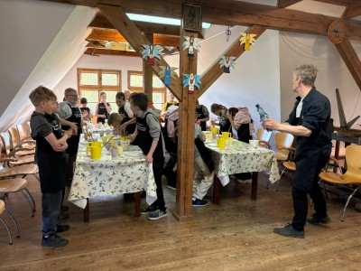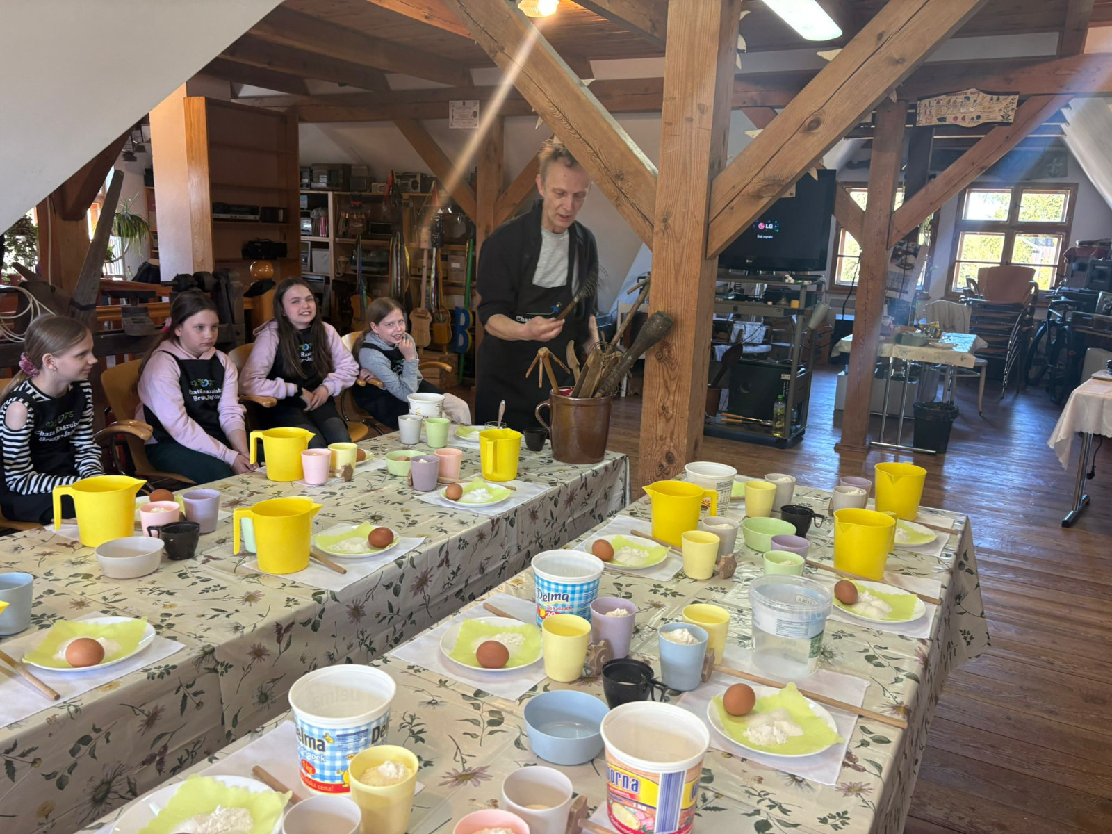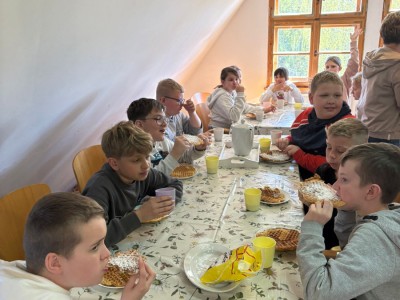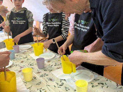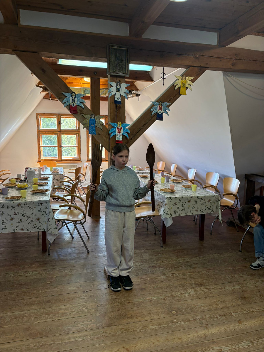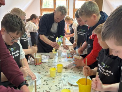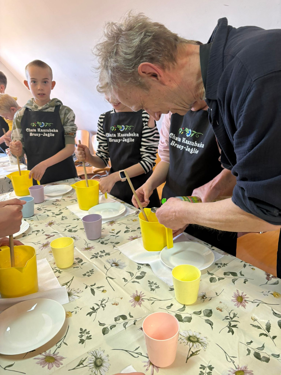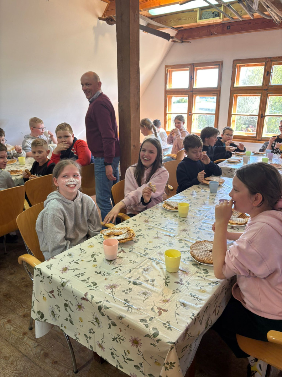 Podczas zajęć dzieci miały okazję poznać dawne zwyczaje kaszubskie oraz tradycyjne metody przygotowywania wafli nad ogniem. Z dużym zaangażowaniem brały udział w pokazie, a następnie samodzielnie próbowały swoich sił w wypieku. Warsztaty były interesującą lekcją regionalnej kultury i pozwoliły uczestnikom poczuć klimat dawnych czasów.