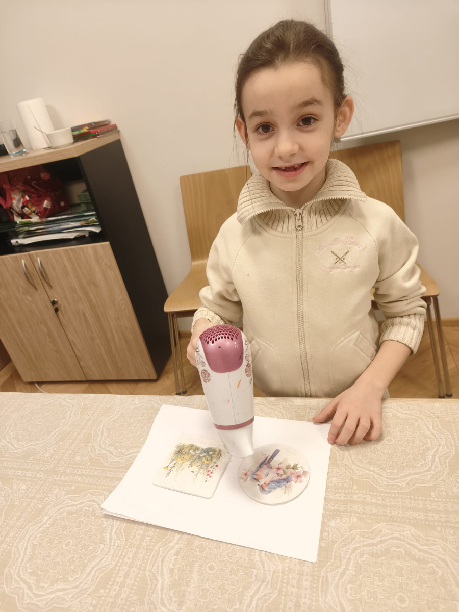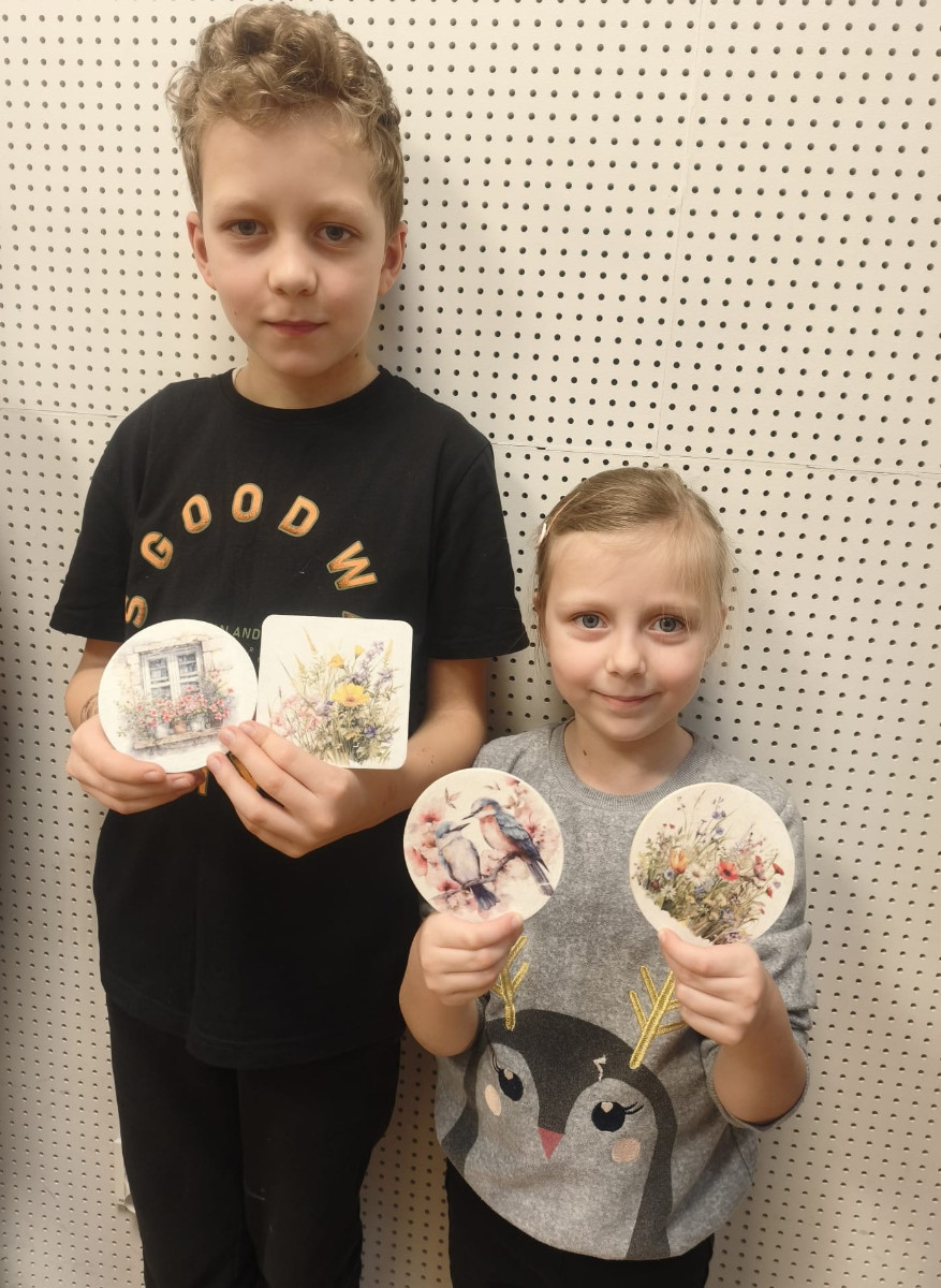 Podczas warsztatów uczestnicy dowiedzieli się, czym jest decoupage, jak przygotować powierzchnię do dekorowania oraz jak prawidłowo naklejać i zabezpieczać papierowe motywy. Pod czujnym okiem instruktorek Pani Renaty i Beaty, dzieci krok po kroku tworzyły własne prace, ucząc się przy tym cierpliwości, precyzji i rozwijając swoją kreatywność.