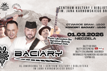1 marca 2026 (niedziela) Centrum Kultury i Biblioteki w Brusach Zespół BACIARY to jedna z największych i najbardziej rozpoznawalnych gwiazd góralskiego folku w Polsce. Artyś…