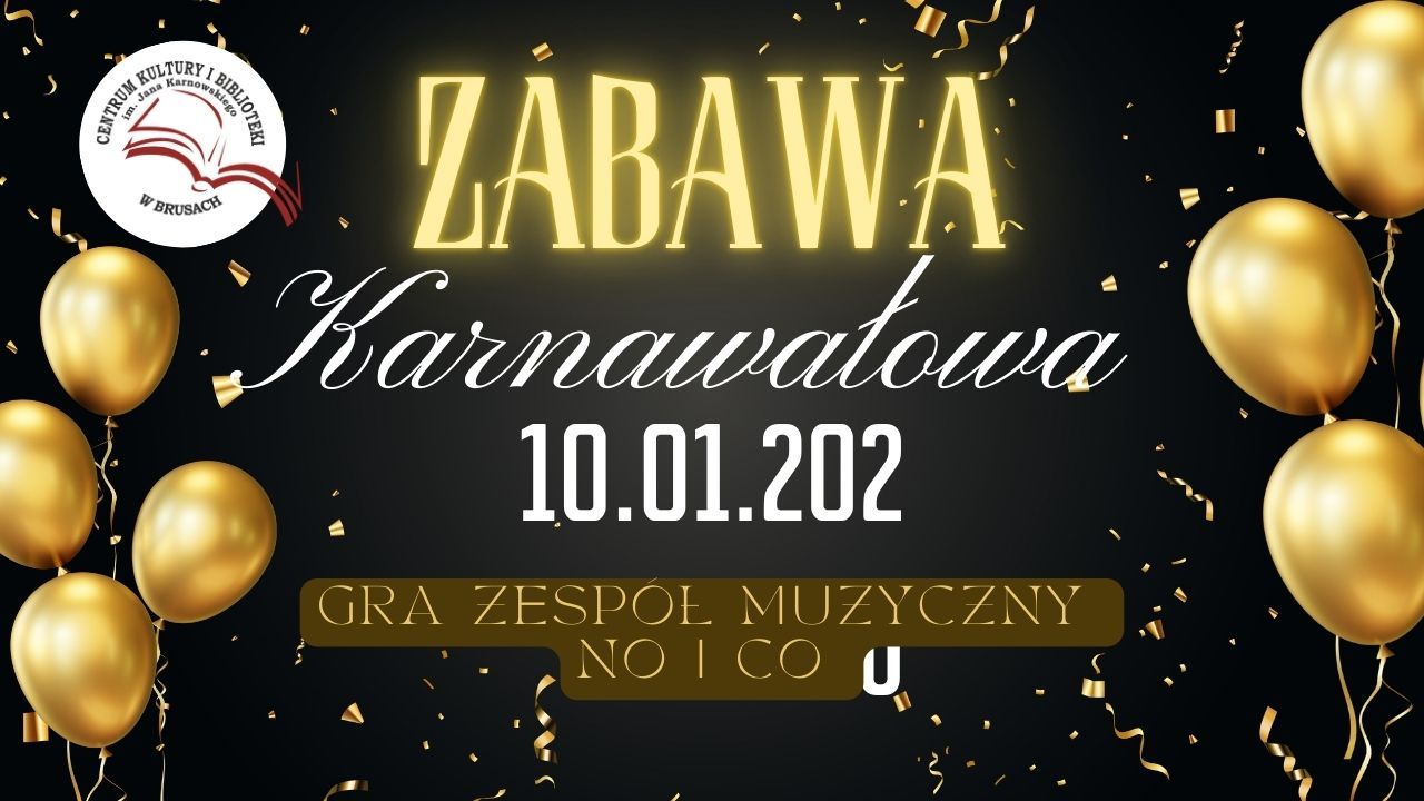 Centrum Kultury i Biblioteki im. Jana Karnowskiego w Brusach zaprasza na zabawę karnawałową! 📅 10 stycznia 2026 r. ⏰ Godz. 20:00 – 4:00 💸 Bilet: 80 zł/osoba