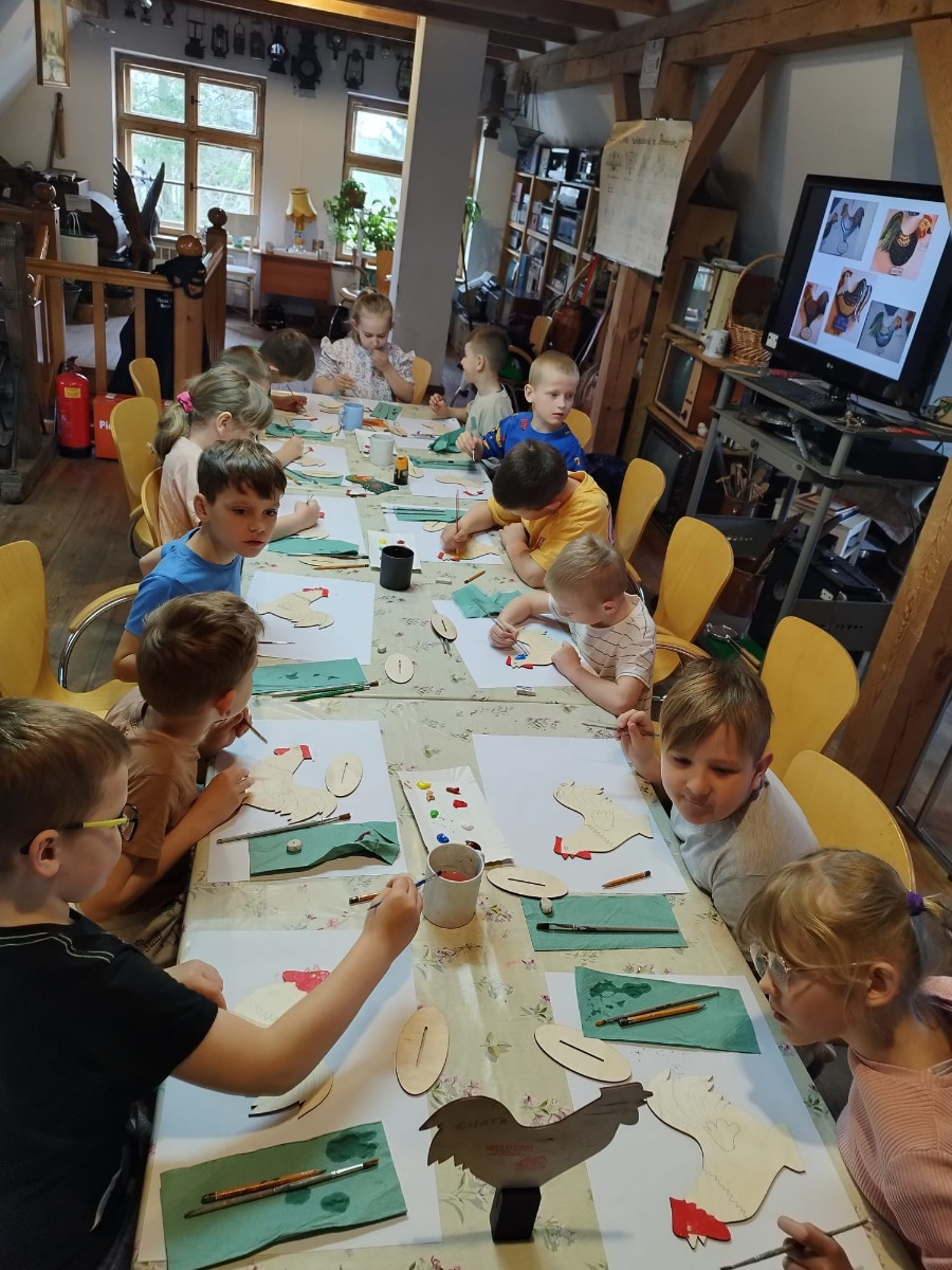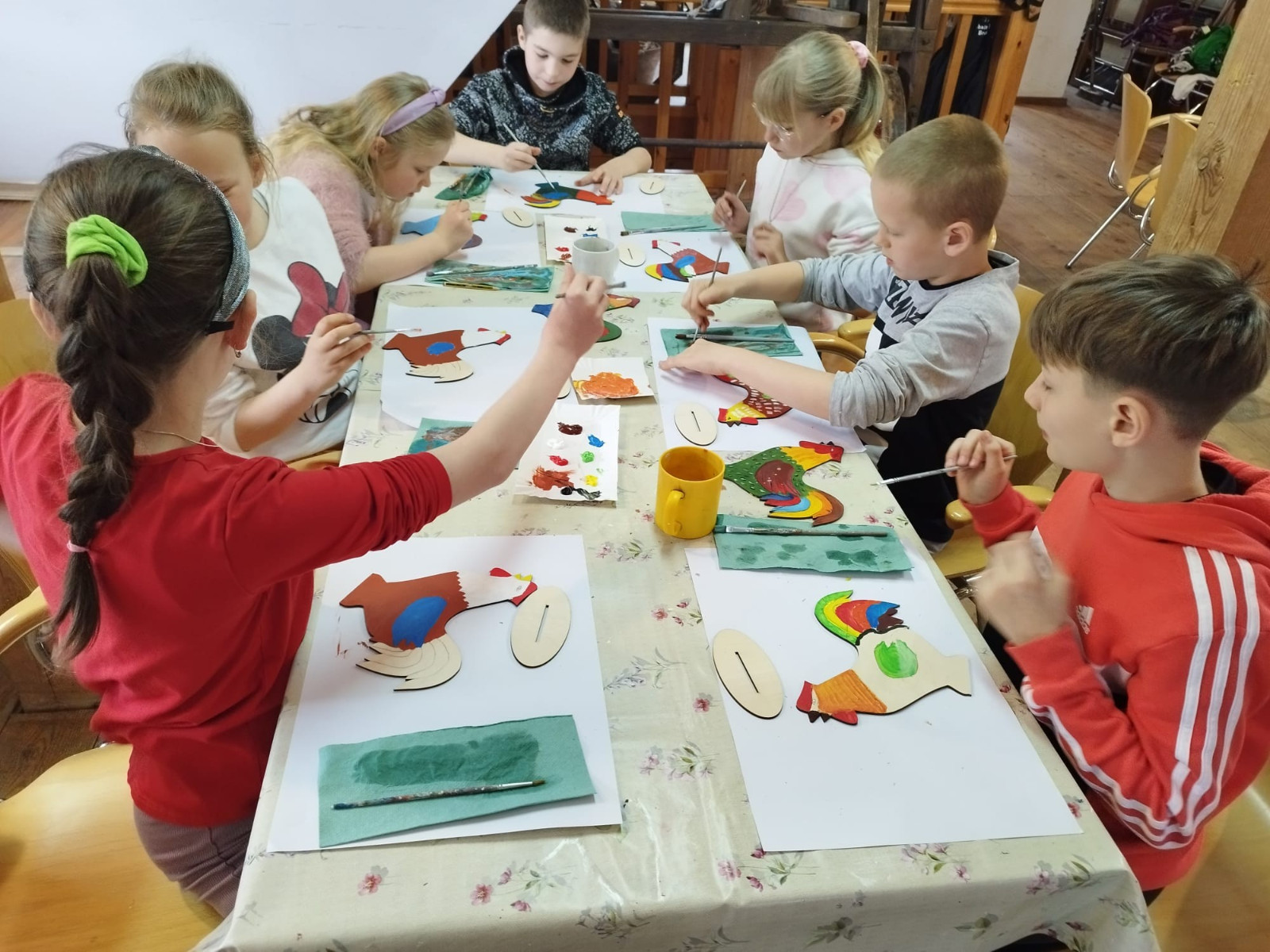 Warsztaty rozpoczęły się od krótkiej rozmowy na temat koguta – jego wyglądu, zwyczajów oraz roli, jaką odgrywa w wiejskim gospodarstwie i tradycji ludowej. Następnie dzieci z zapałem przystąpiły do części plastycznej, w której samodzielnie ozdabiały drewniane koguciki, używając kolorowych farb akrylowych.