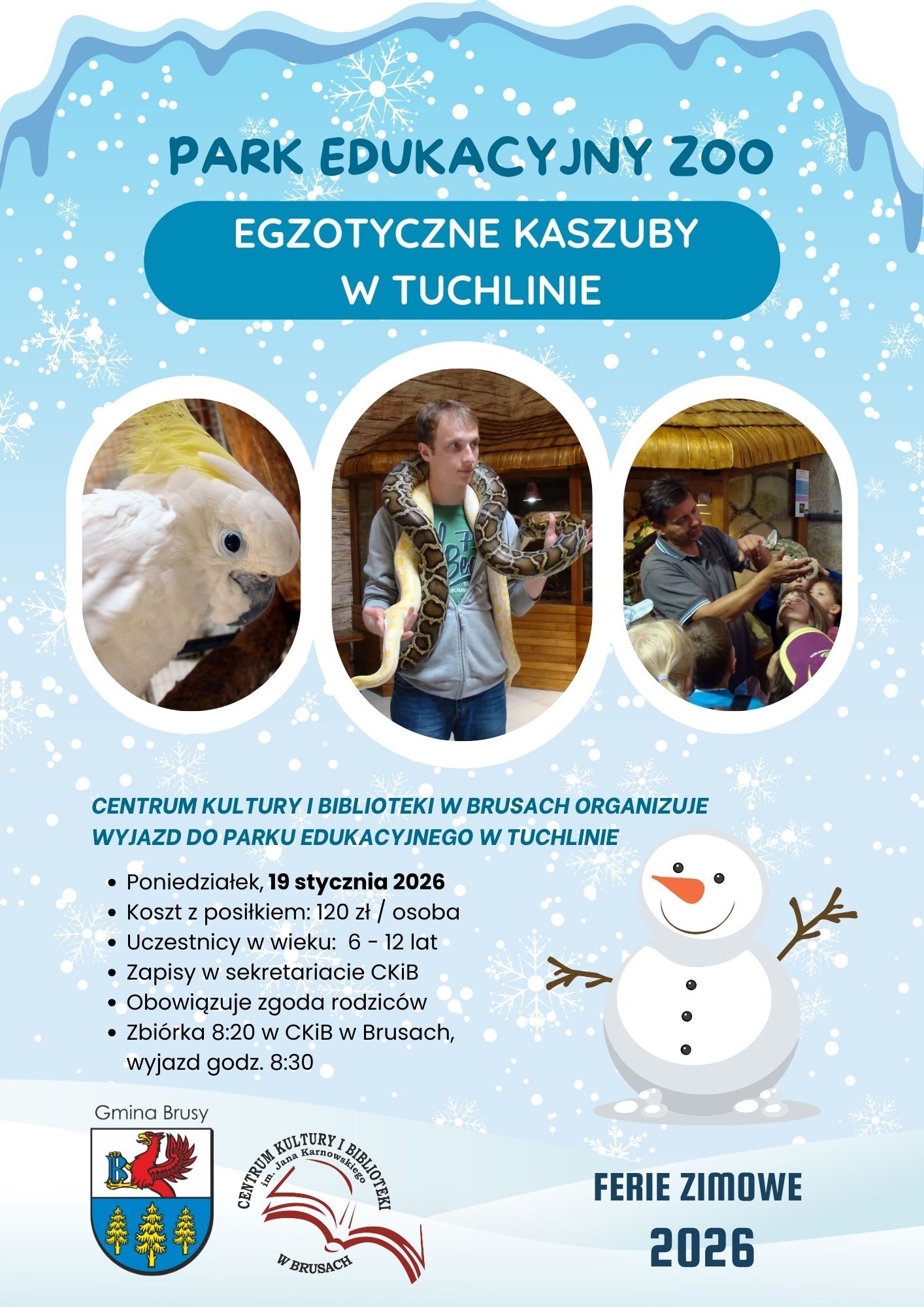 Centrum Kultury i Biblioteki im. Jana Karnowskiego w Brusach organizuje w czasie ferii zimowych wyjazd do Parku Edukacyjnego ZOO Egzotyczne Kaszuby w Tuchlinie.