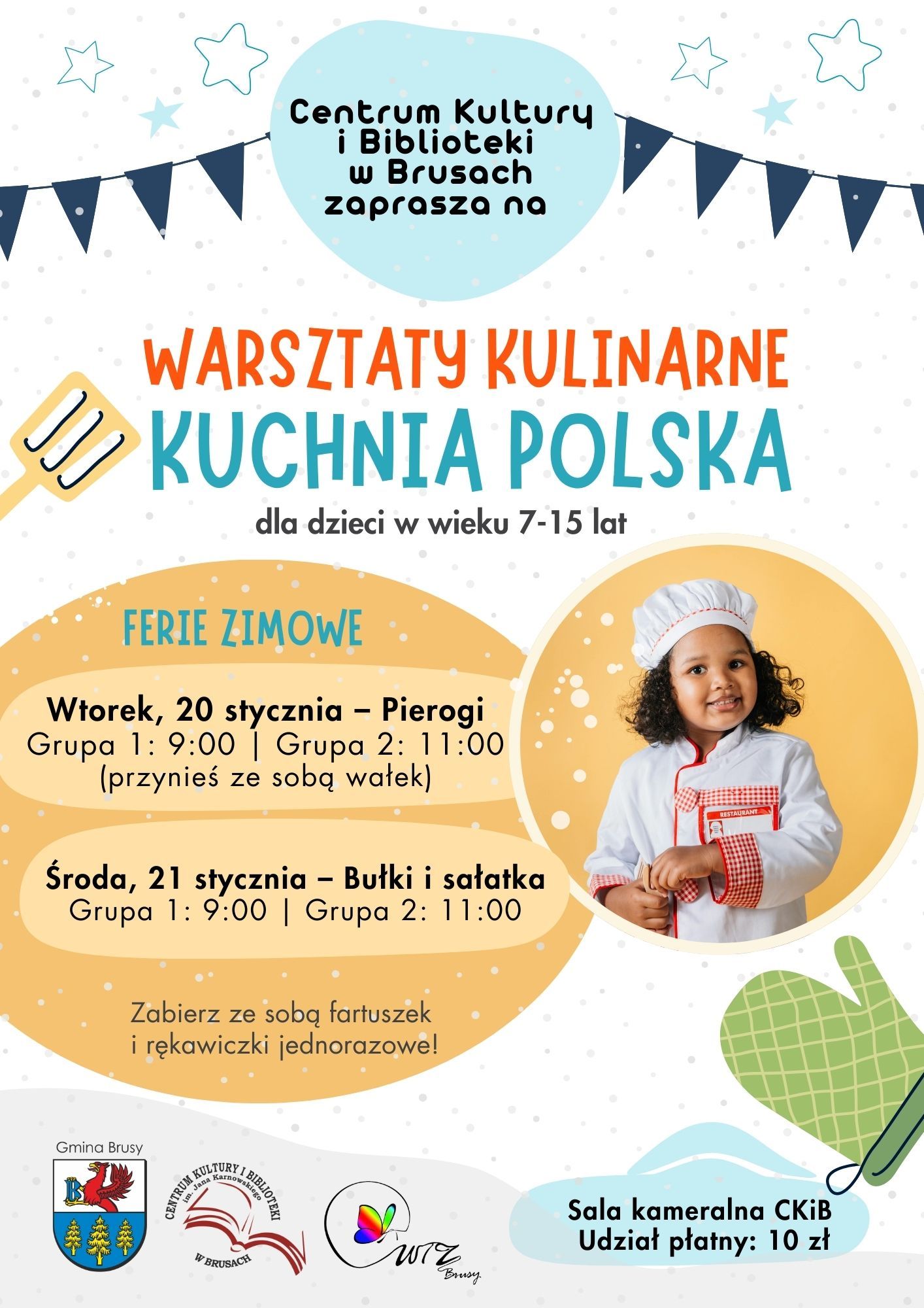 Centrum Kultury i Biblioteki oraz Warsztat Terapii Zajęciowej w Brusach zapraszają dzieci w wieku 7–15 lat na warsztaty kulinarne „Kuchnia Polska”, organizowane w ramach ferii zimowych.