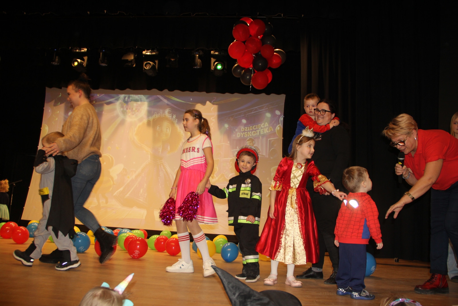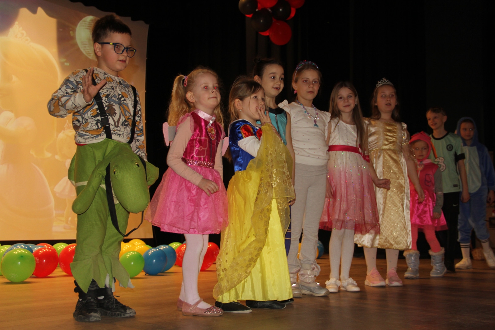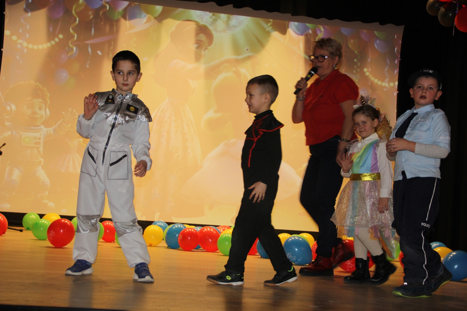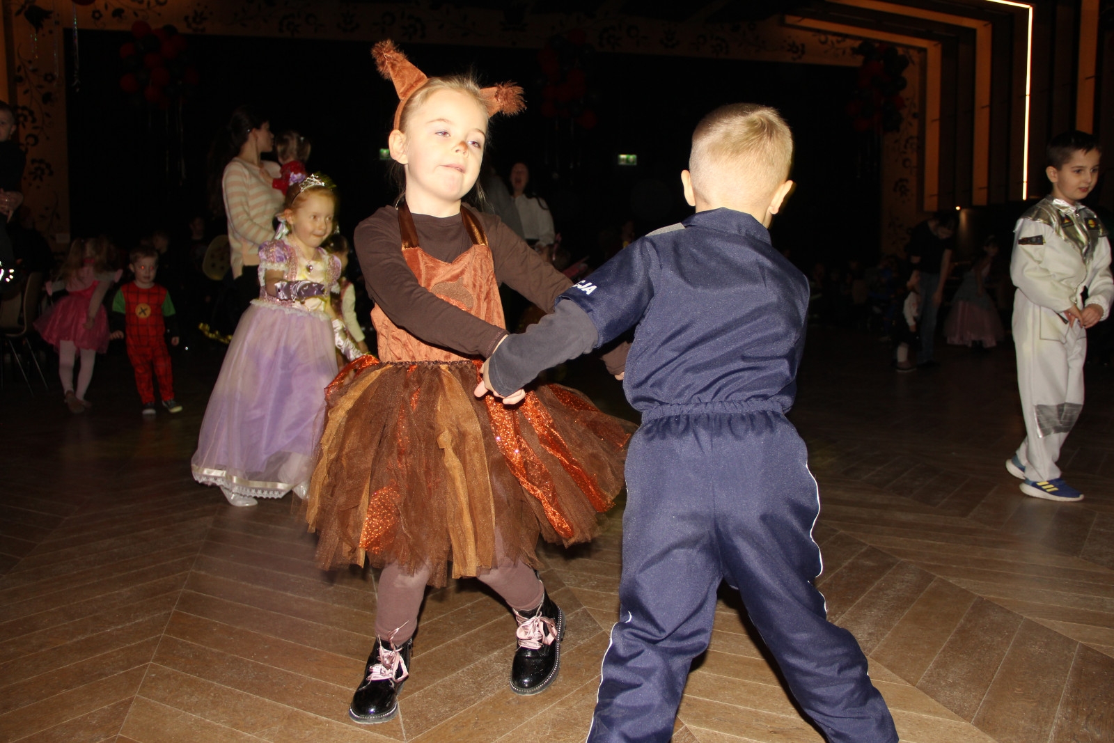 Podczas balu na dzieci czekało wiele atrakcji, zabaw i konkursów ruchowych. W programie znalazły się m.in. takie zabawy jak: „gorące krzesło”, „wędrujący prezent”, przechodzenie pod kijem, taniec z balonikami oraz liczne układy taneczne. Dzieci chętnie brały udział w tańcach takich jak „Zuzanna”, „Idą, idą moje nogi”, „Tańczymy la ba da”, a także w zabawach integracyjnych – wężu karnawałowym.