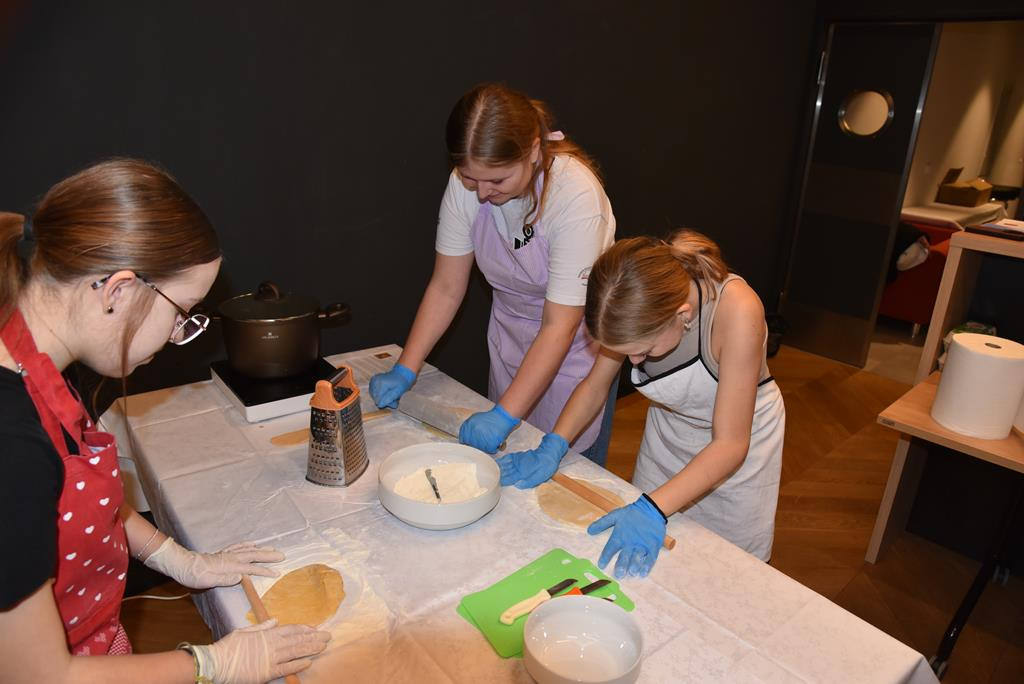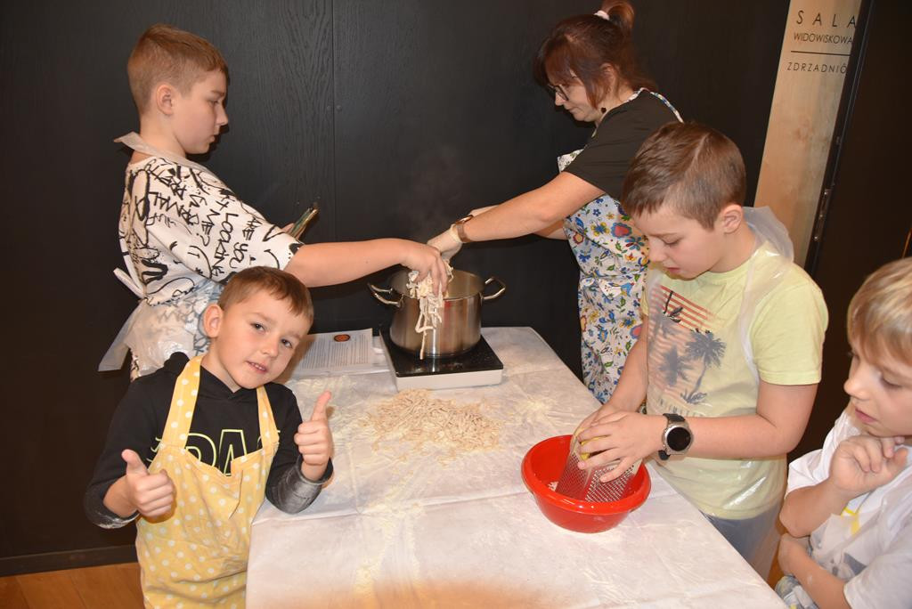 Jednak największą atrakcją warsztatów było samodzielne przygotowanie makaronu od podstaw. Uczestnicy z wielkim zaangażowaniem zagniatali ciasto, wałkowali je, a następnie kroili w paski. Dzięki temu mogli przekonać się, jak wielką różnicę robi świeży, własnoręcznie wykonany makaron w porównaniu do gotowego produktu ze sklepu.