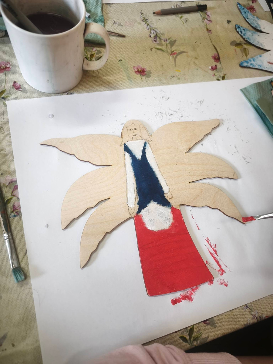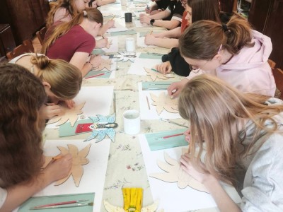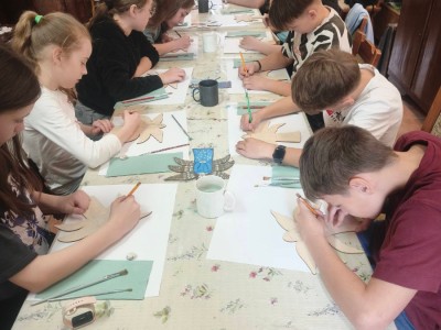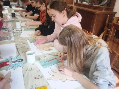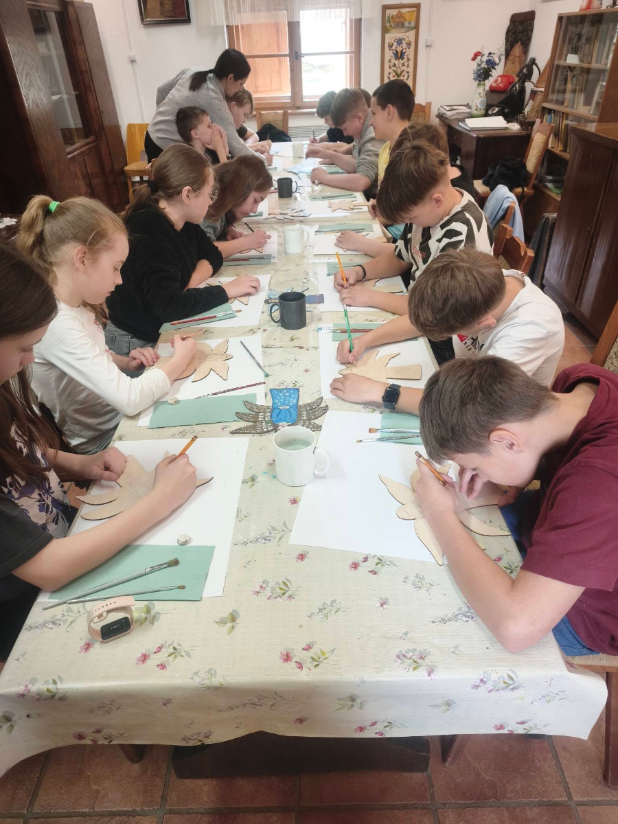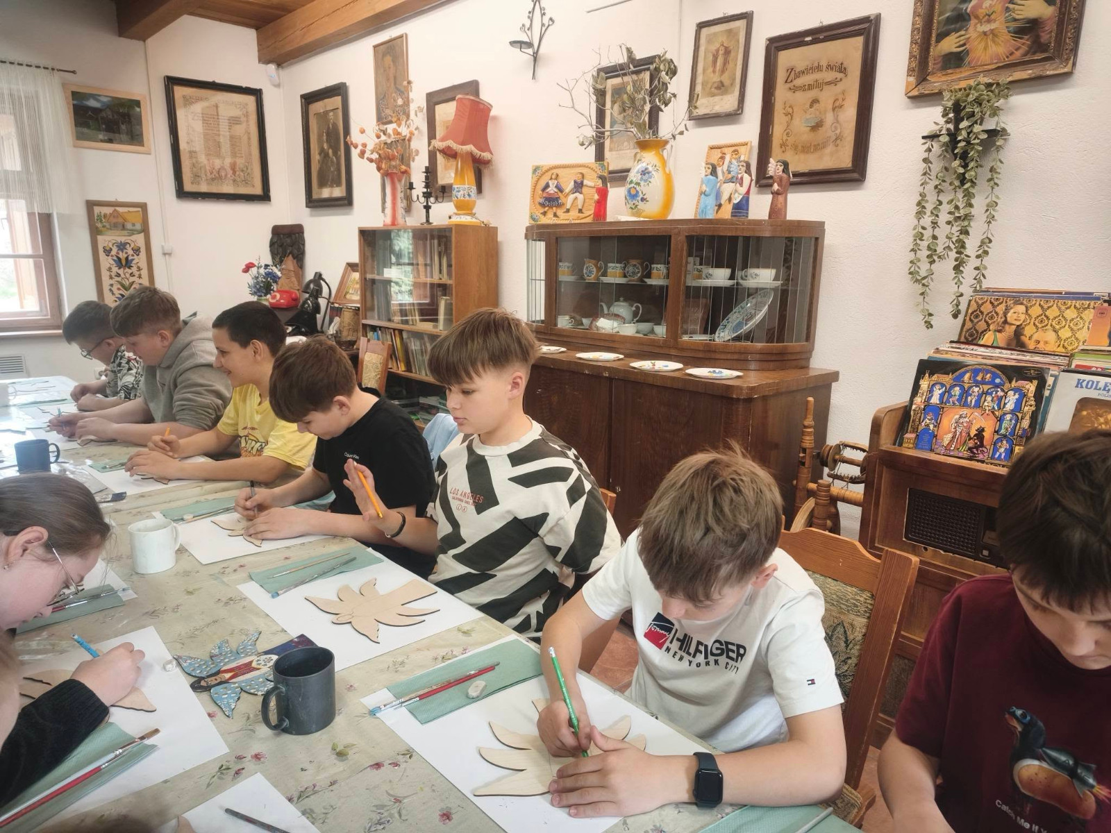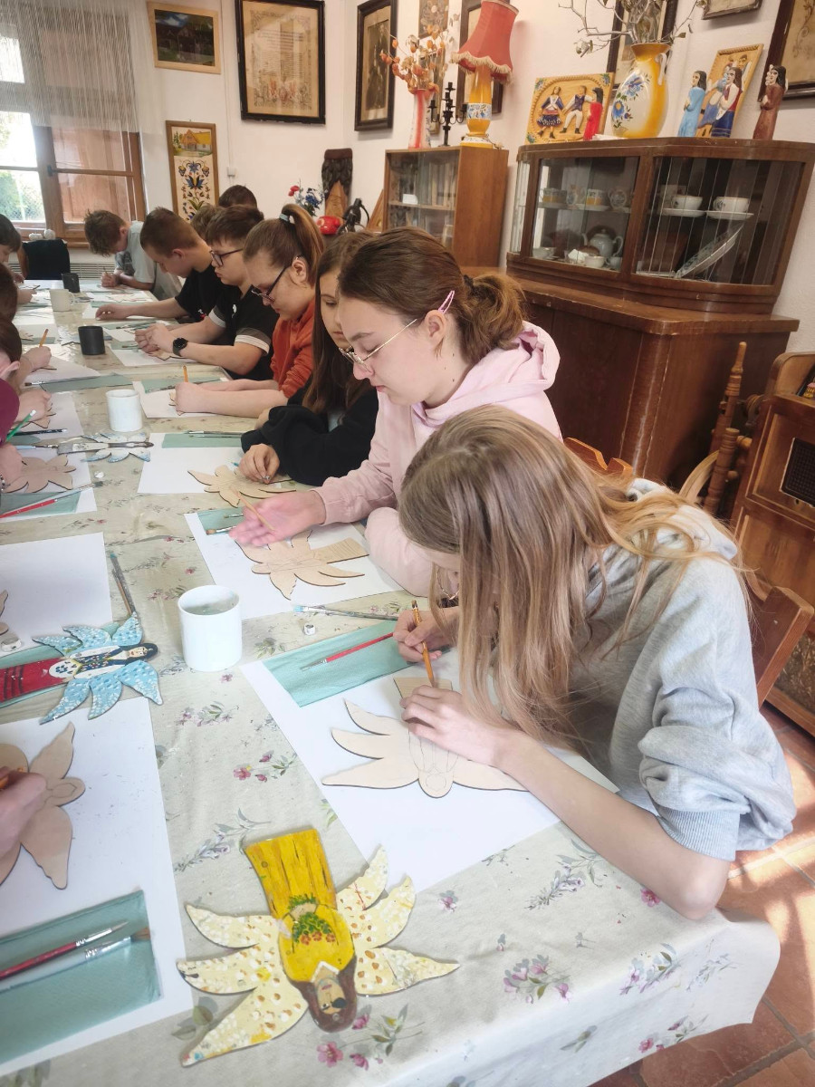 W części praktycznej uczniowie samodzielnie malowali drewniane anioły farbami akrylowymi, inspirując się stylem artysty. Na zakończenie każdy uczestnik otrzymał własnoręcznie wykonane dzieło jako pamiątkę twórczego spotkania z kulturą Kaszub.