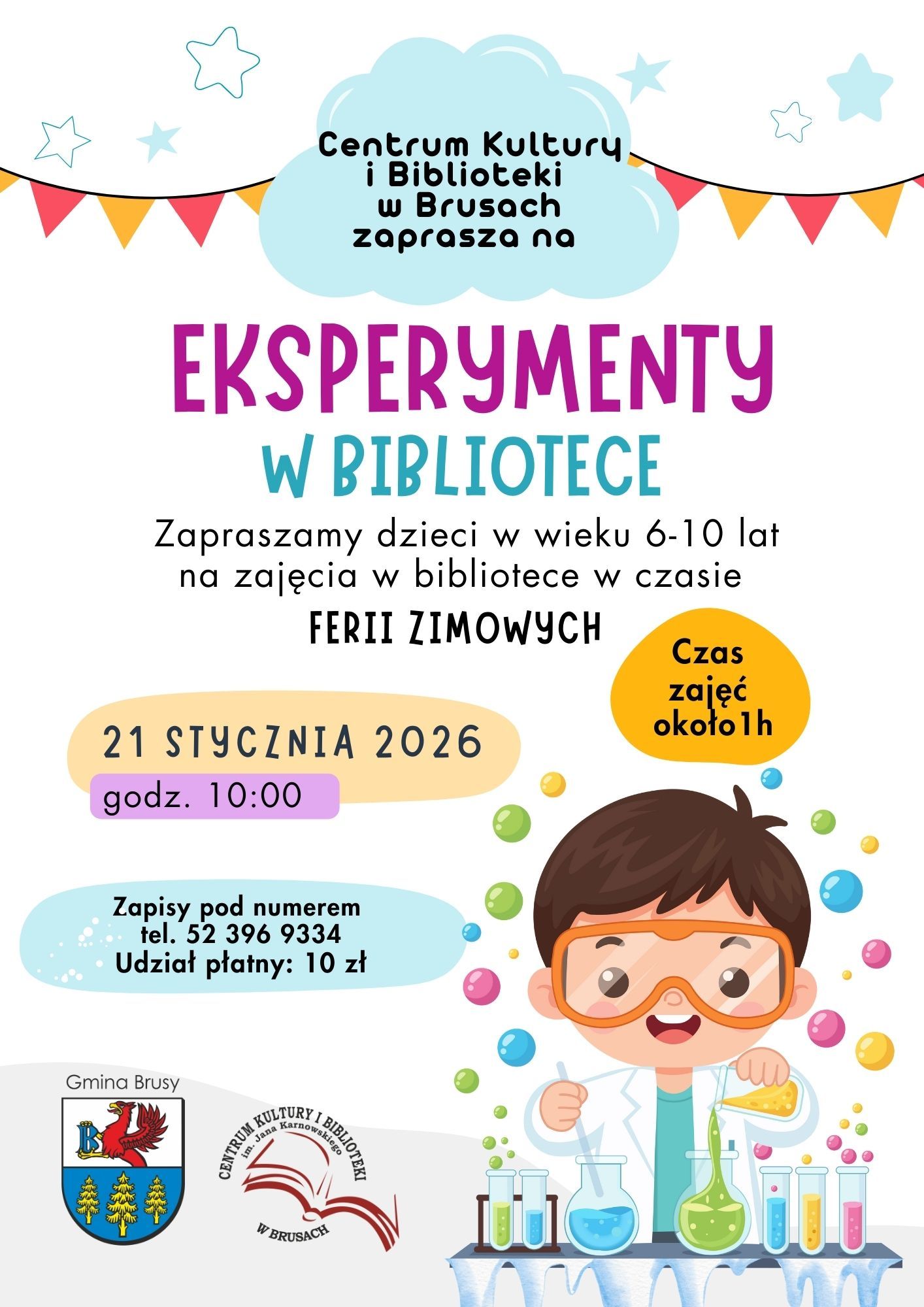 Centrum Kultury i Biblioteki w Brusach zaprasza dzieci w wieku 6–10 lat na zajęcia edukacyjne pod hasłem „Eksperymenty w bibliotece”, organizowane w czasie FERII ZIMOWYCH. To doskonała okazja, aby połączyć naukę z zabawą i w ciekawy sposób spędzić zimowy wolny czas.
