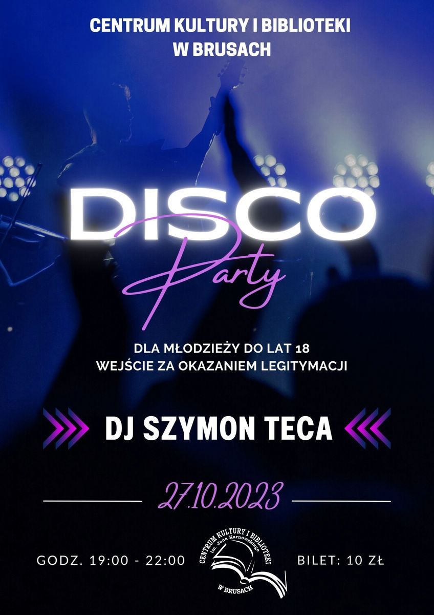 Centrum Kultury i Biblioteki im. Jana Karnowskiego w Brusach zaprasza młodzież do 18 lat na DISCO PARTY, które odbędzie się 27 października (piątek) w godzinach od 19.00 do 22.00. Prosimy o zapoznanie się z regulaminem udziału w dyskotece.