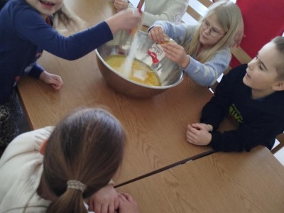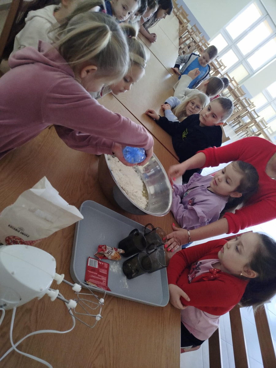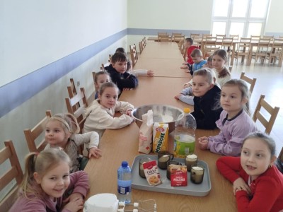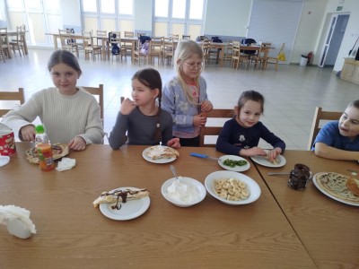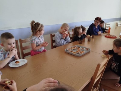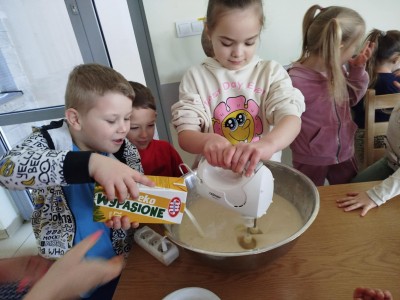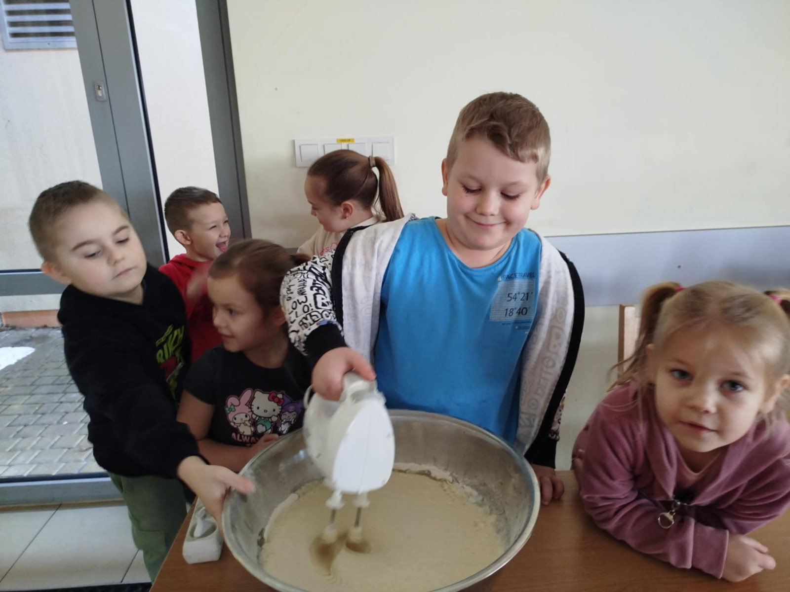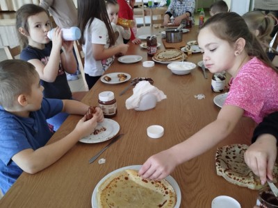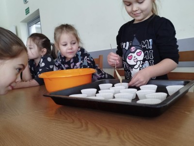 Czwartek i piątek były dniami pełnymi kuchennych słodkości. Przy niewielkiej pomocy dorosłych dzieci upiekły naleśniki oraz przygotowały babeczki, które z apetytem zjadły. Po słodkich przyjemnościach przyszedł czas na gry planszowe i zabawy ruchowe.