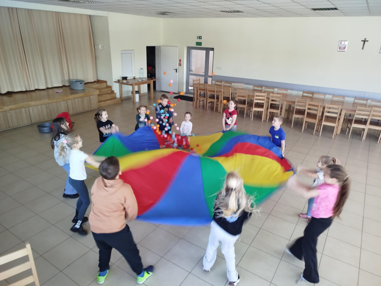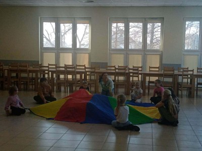 W poniedziałek uczestnicy spotkań słuchali czytanych książek, kolorowali swoje ulubione postacie z bajek oraz bawili się przy użyciu kolorowej chusty animacyjnej. Był to dzień pełen wyciszenia, uśmiechów i wspólnej zabawy.
