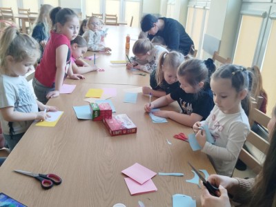 Wtorkowe spotkanie poświęcone było przygotowywaniu laurek dla Babć i Dziadków. Dzieci z dużym zaangażowaniem tworzyły piękne, kolorowe prace, a czas umilały im także różnorodne zabawy ruchowe.