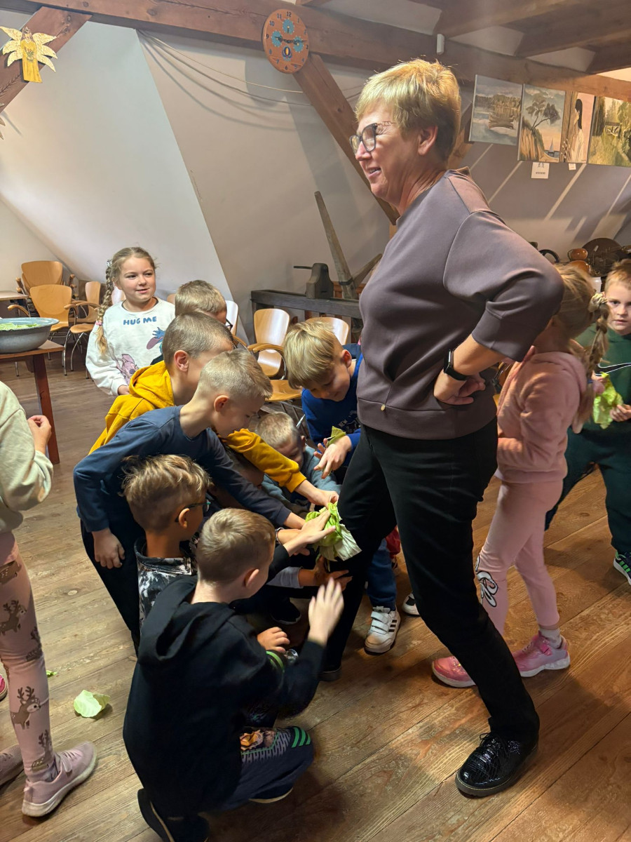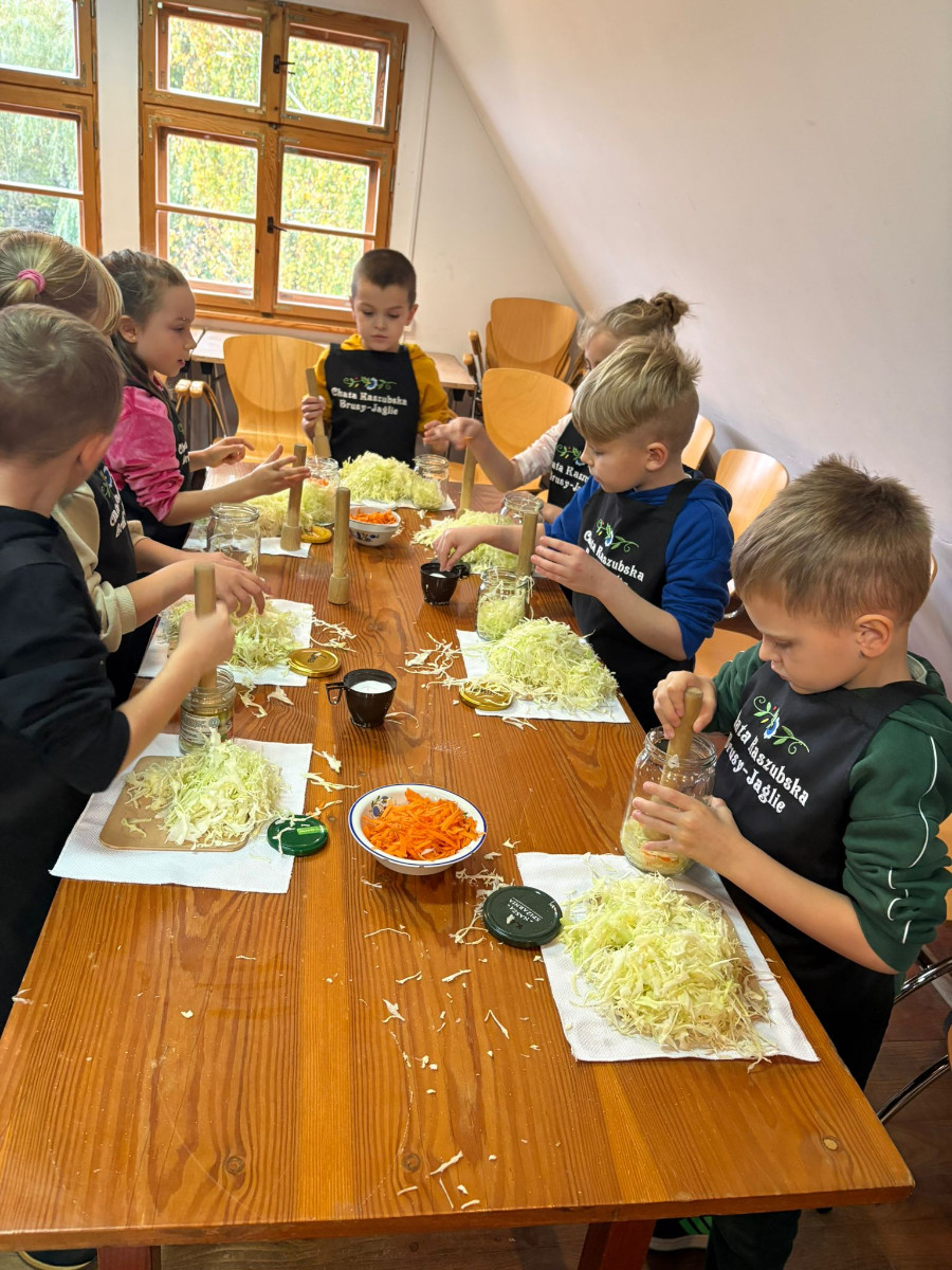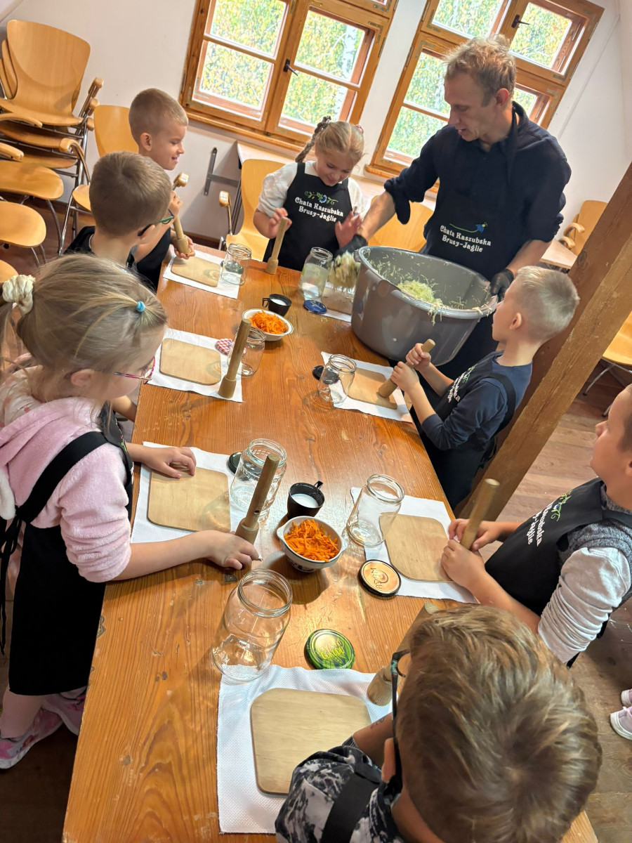 Podczas spotkania dzieci poznały tradycje związane z kiszeniem kapusty – jednym z najstarszych jesiennych zwyczajów na Kaszubach. Uczniowie mieli okazję zobaczyć dawne narzędzia używane do szatkowania i ugniatania kapusty, a następnie samodzielnie spróbowali swoich sił w przygotowaniu tego popularnego przetworu.