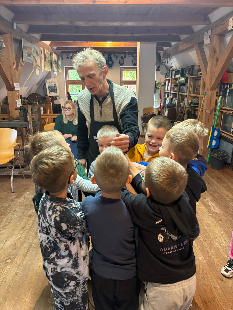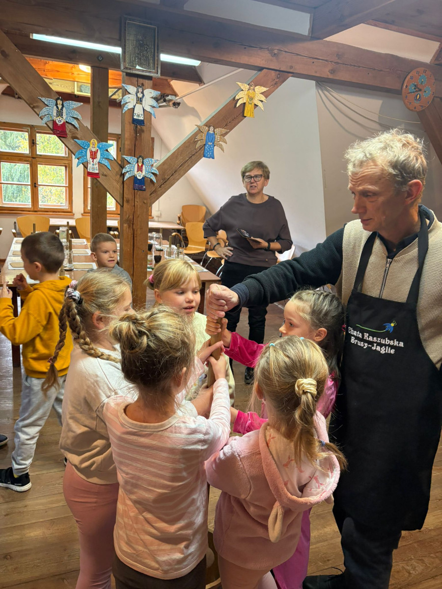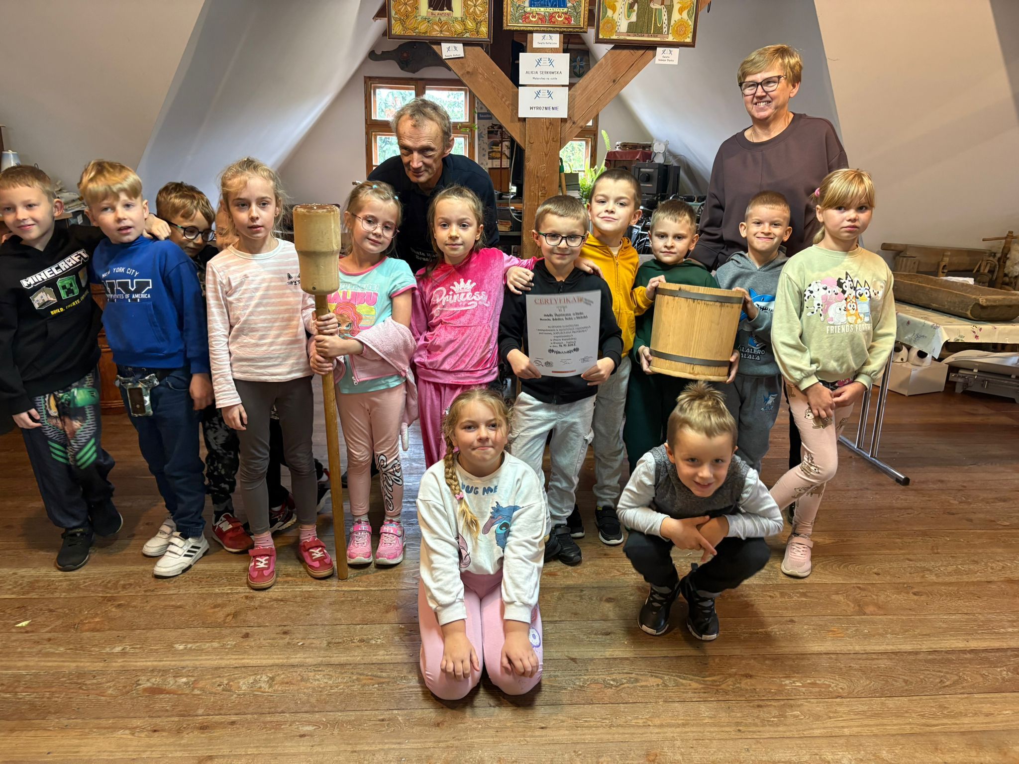 Podczas spotkania dzieci poznały tradycje związane z kiszeniem kapusty – jednym z najstarszych jesiennych zwyczajów na Kaszubach. Uczniowie mieli okazję zobaczyć dawne narzędzia używane do szatkowania i ugniatania kapusty, a następnie samodzielnie spróbowali swoich sił w przygotowaniu tego popularnego przetworu.
