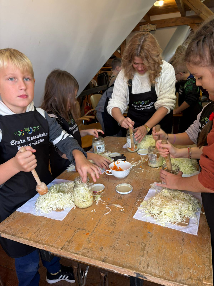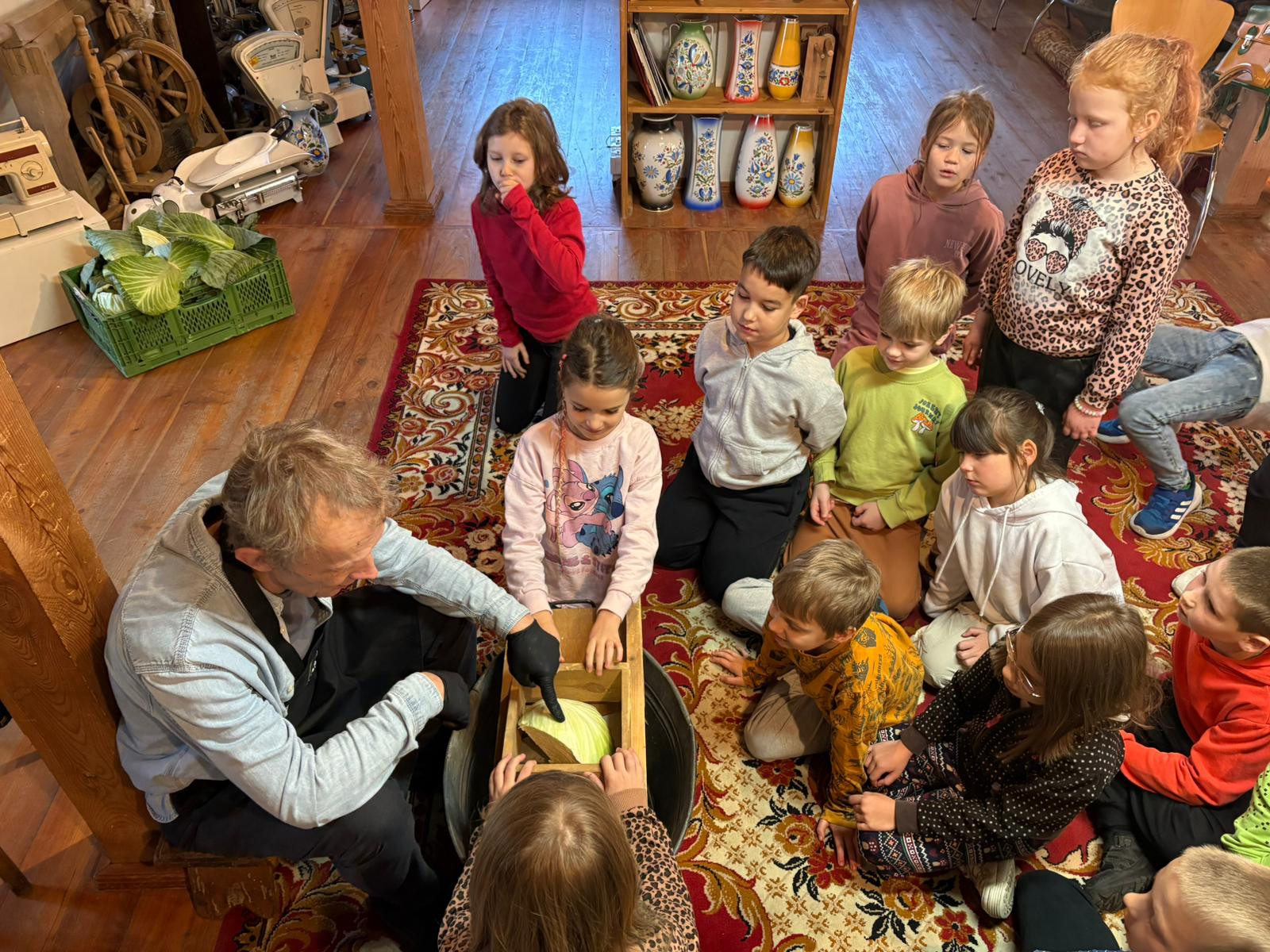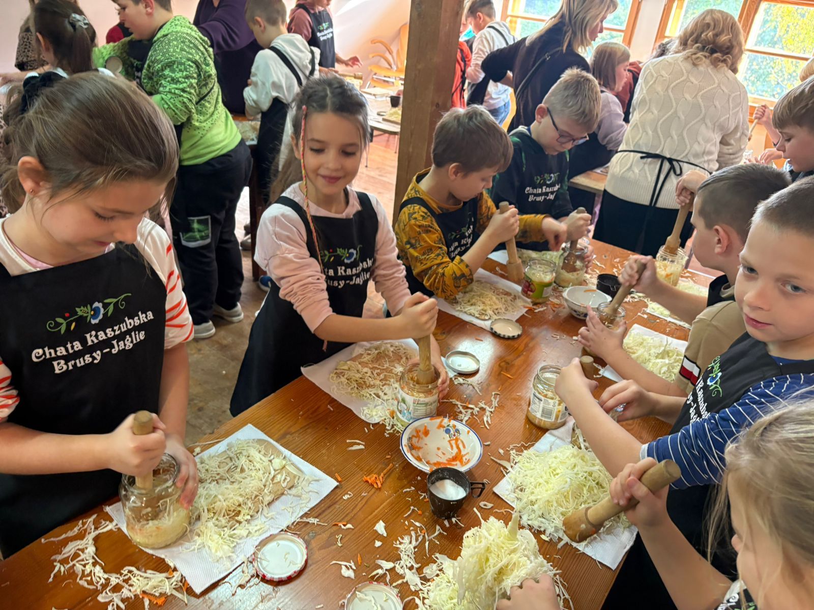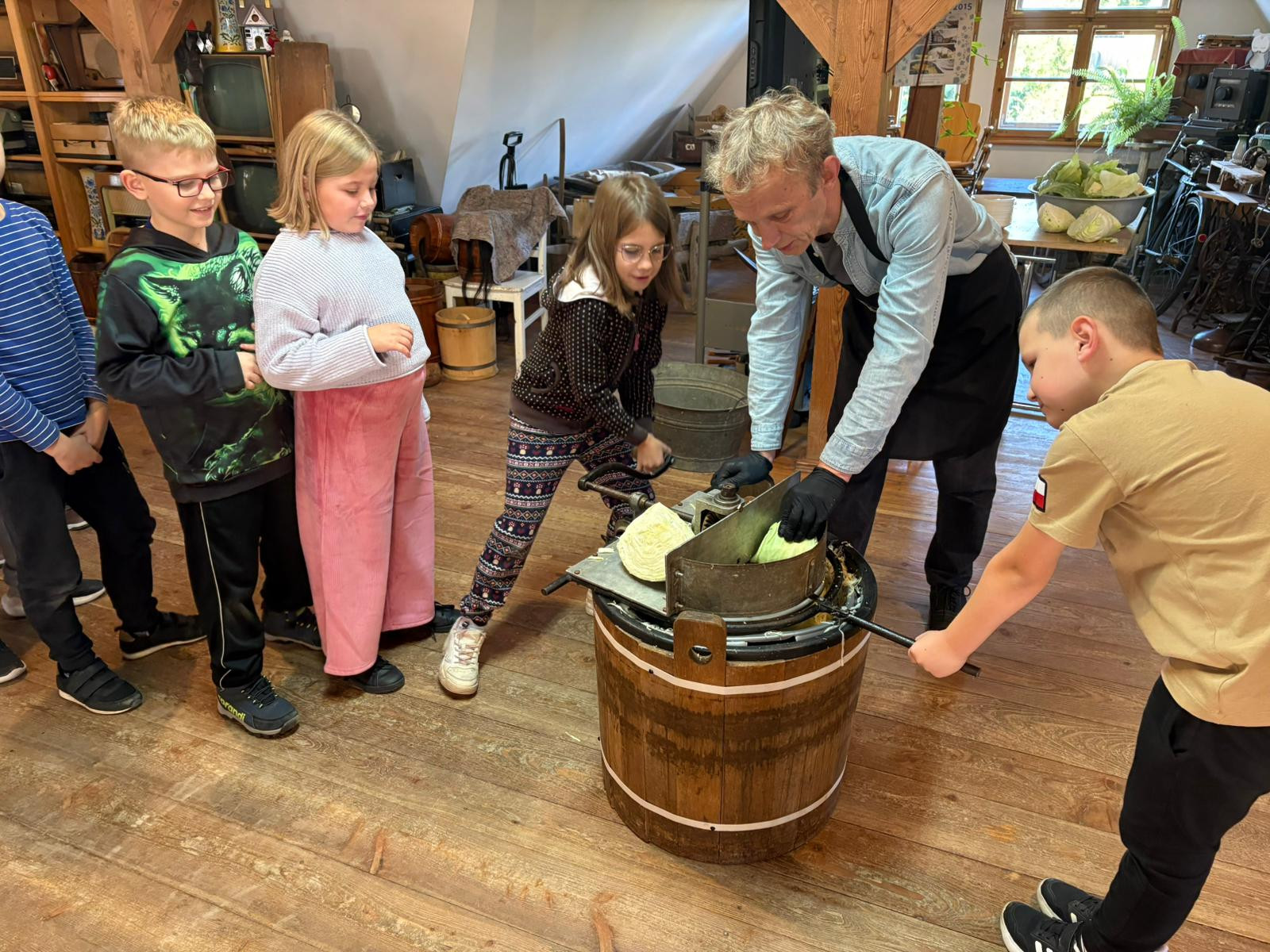 Podczas zajęć uczestnicy poznali tradycje związane z kiszeniem kapusty – jednym z najważniejszych jesiennych zwyczajów na Kaszubach. Dzieci mogły zobaczyć, jak dawniej przygotowywano kapustę na zimę, a także samodzielnie włączyć się w proces jej szatkowania i ugniatania.