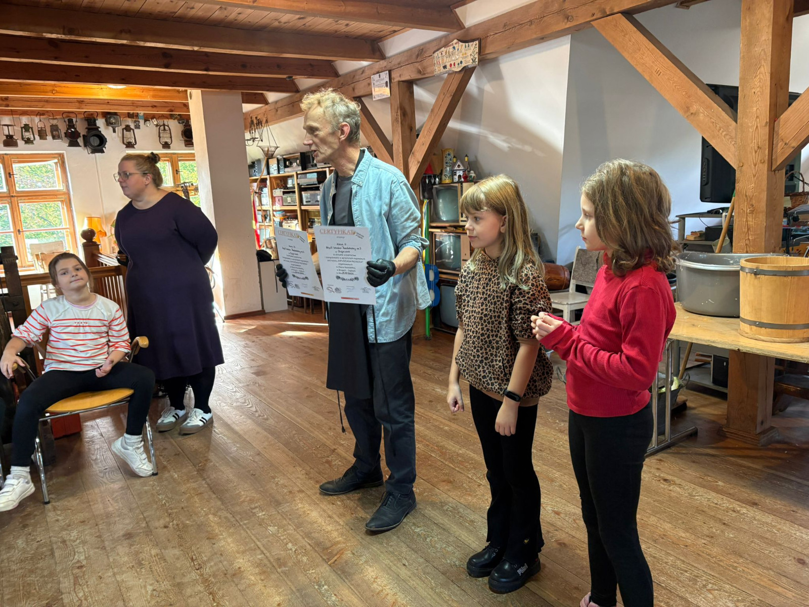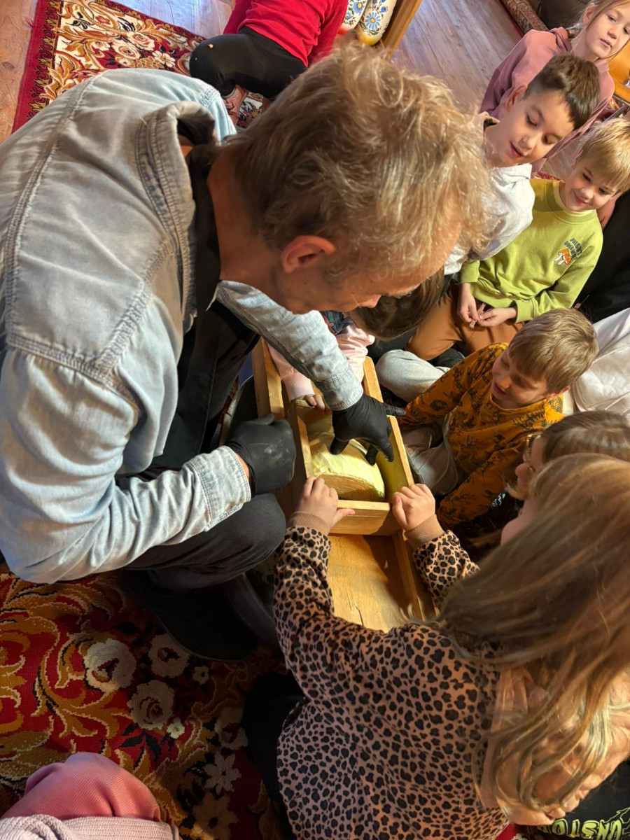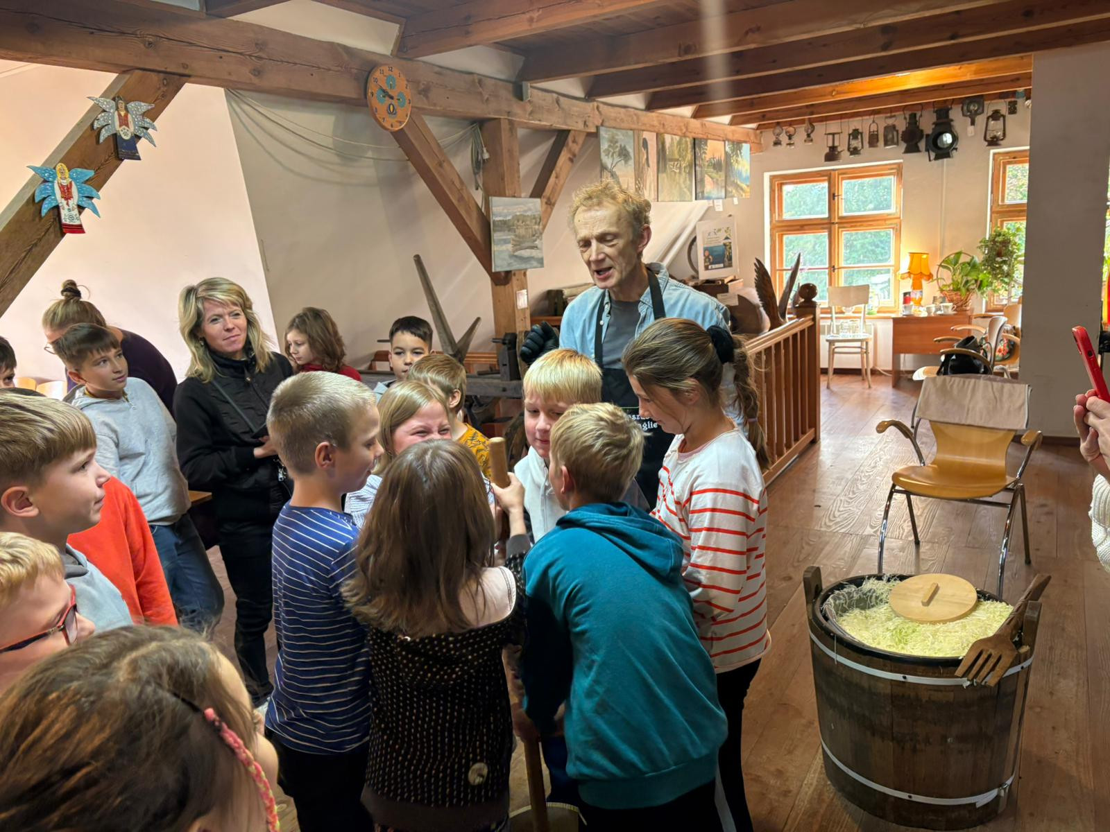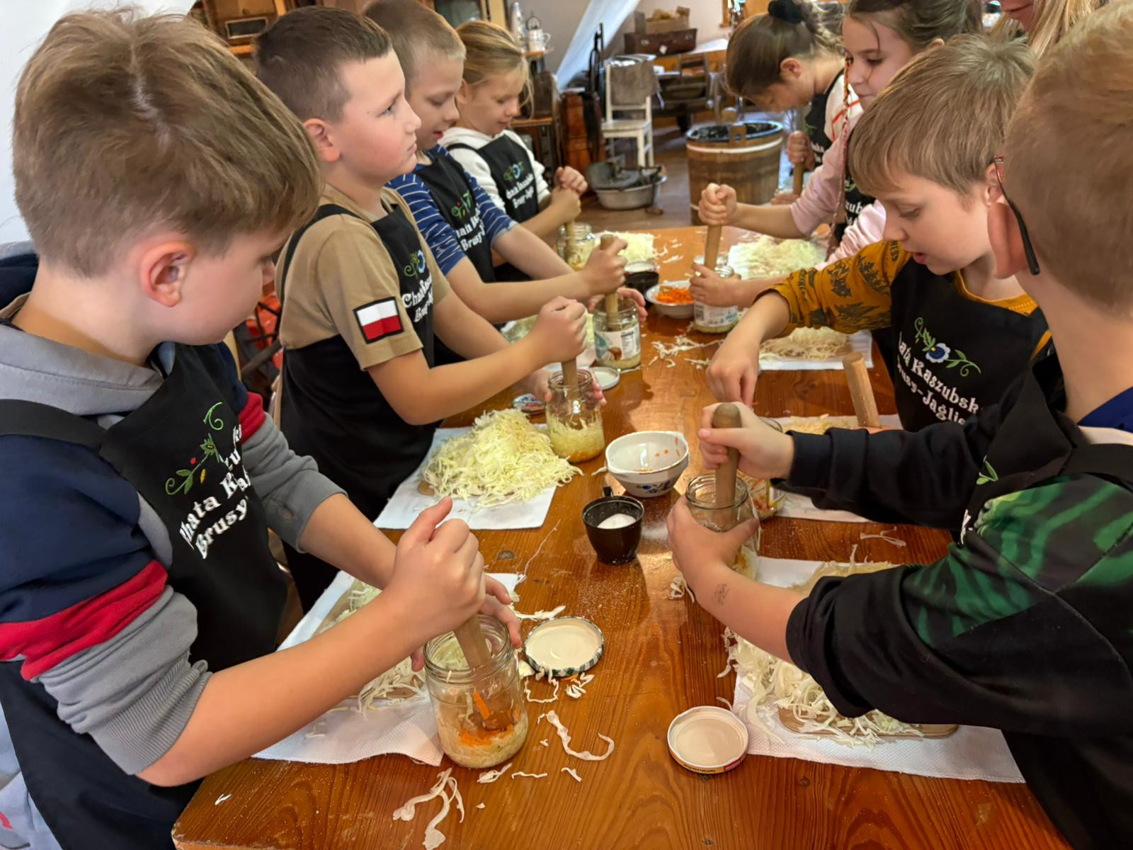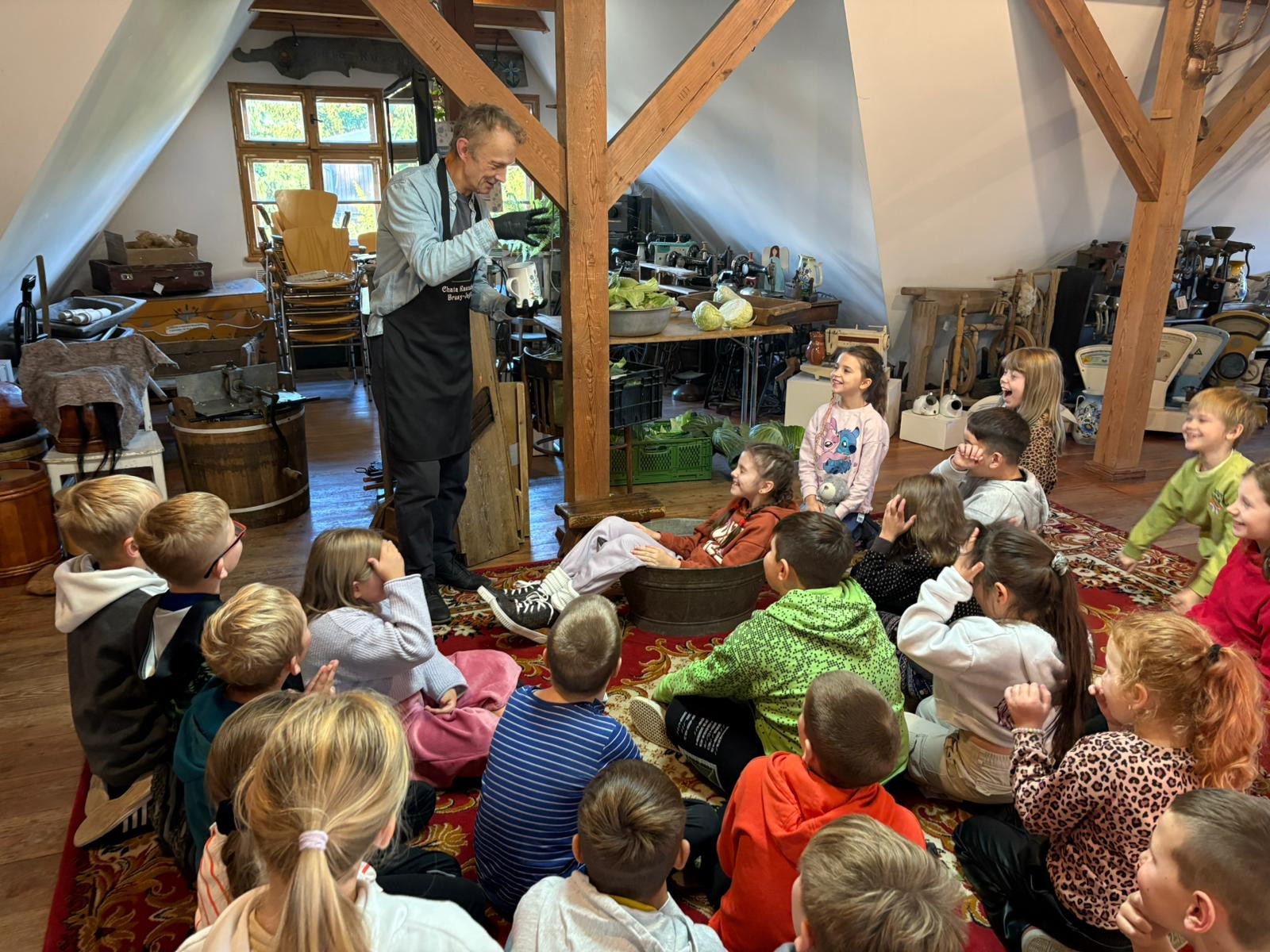 Podczas zajęć uczestnicy poznali tradycje związane z kiszeniem kapusty – jednym z najważniejszych jesiennych zwyczajów na Kaszubach. Dzieci mogły zobaczyć, jak dawniej przygotowywano kapustę na zimę, a także samodzielnie włączyć się w proces jej szatkowania i ugniatania.