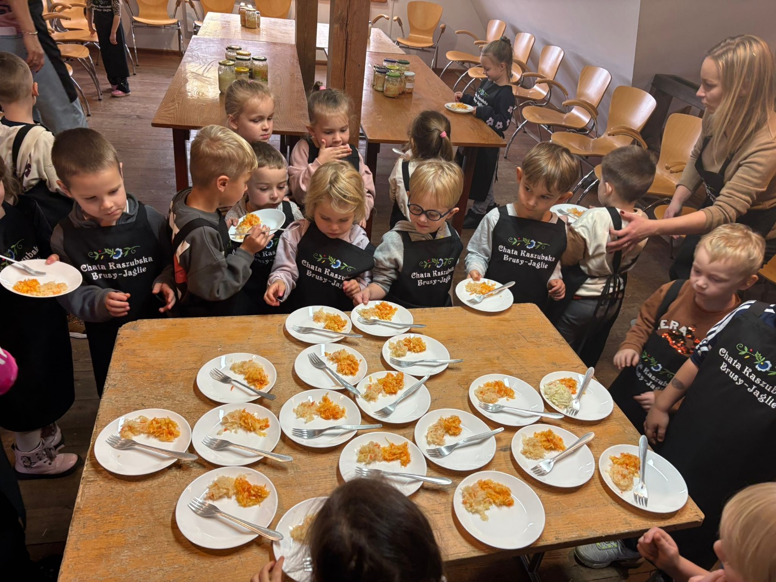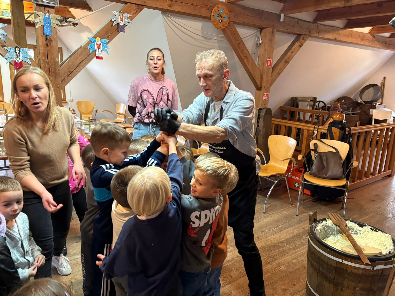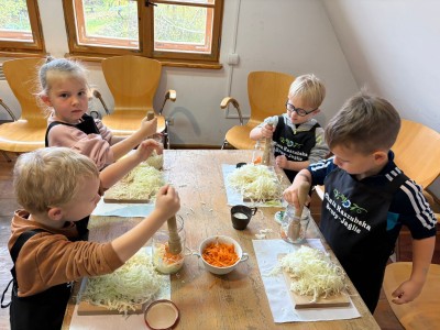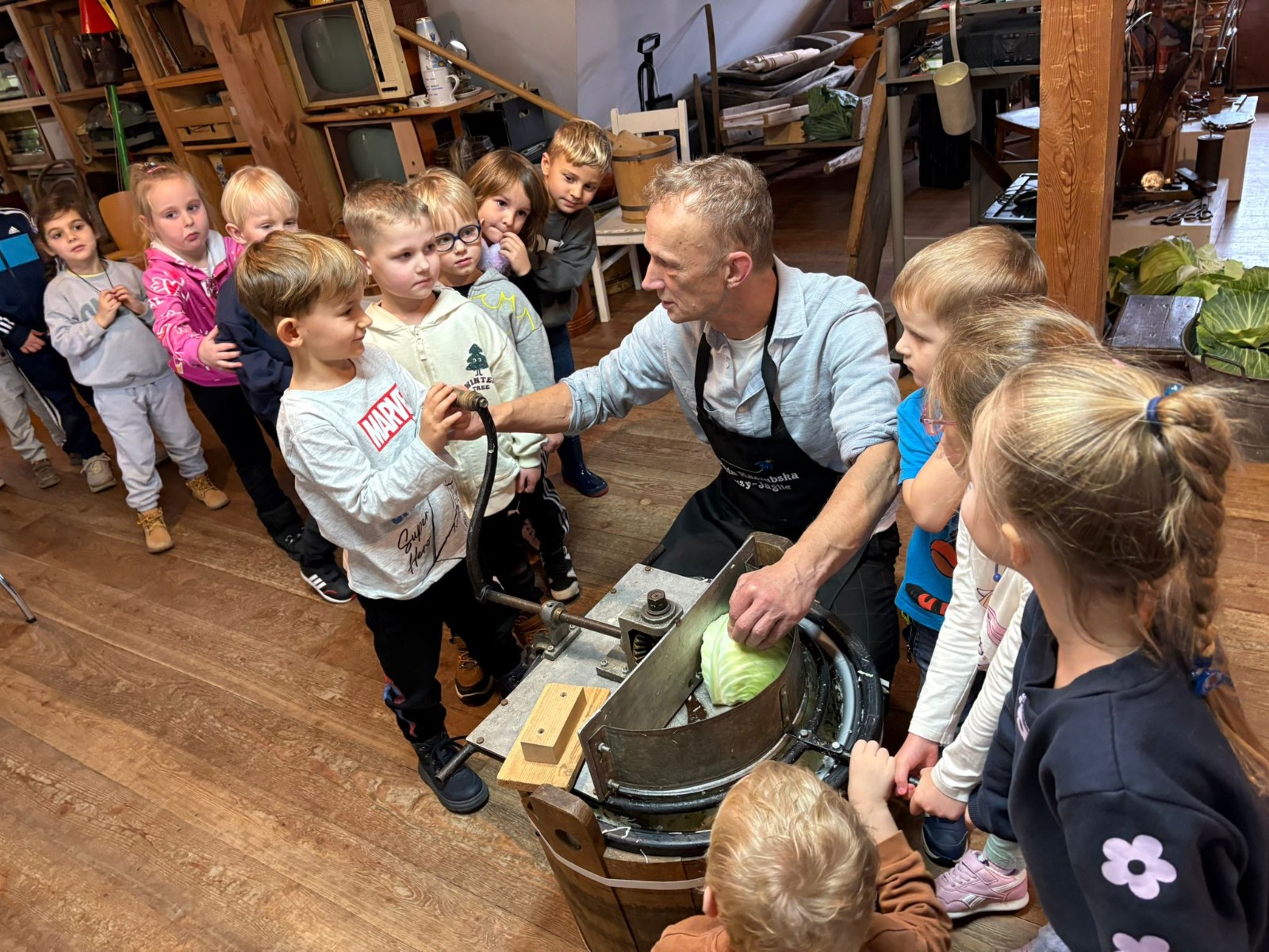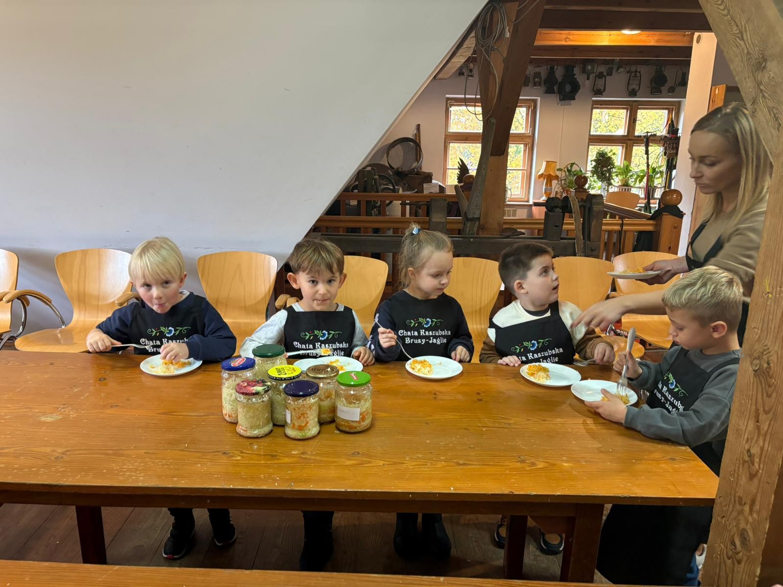 Podczas zajęć przedszkolaki poznały tradycje związane z kiszeniem kapusty – jednym z najbardziej znanych jesiennych zwyczajów na Kaszubach. Dzieci dowiedziały się, jak dawniej przygotowywano kapustę na zimę, zobaczyły tradycyjne narzędzia używane do jej szatkowania, a następnie same mogły spróbować swoich sił w ugniataniu i przyprawianiu kapusty.