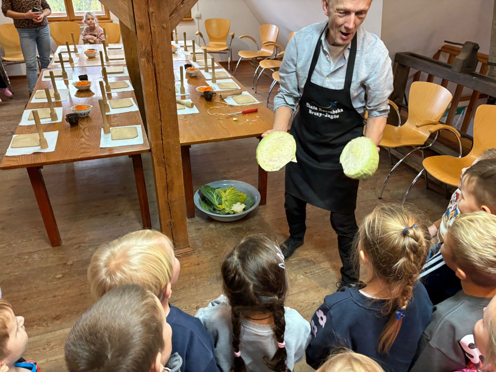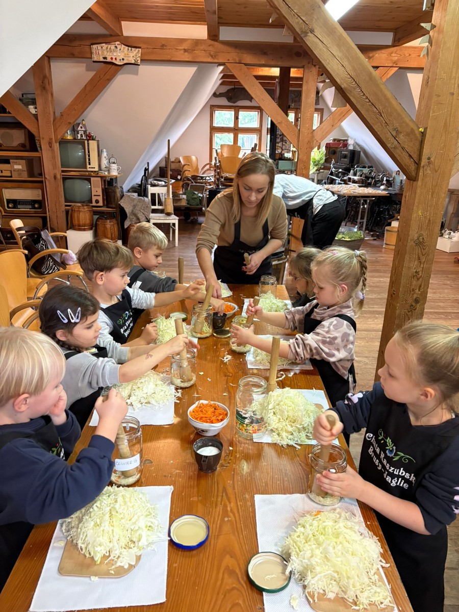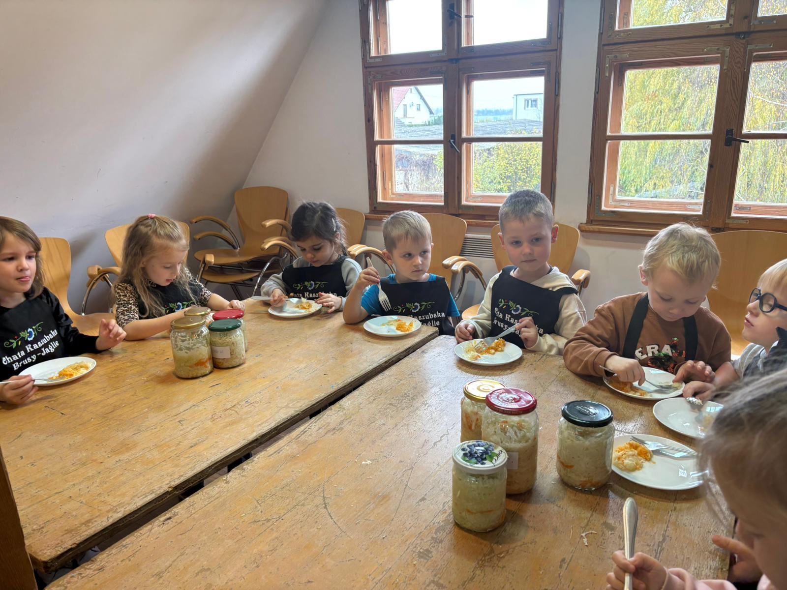Podczas zajęć przedszkolaki poznały tradycje związane z kiszeniem kapusty – jednym z najbardziej znanych jesiennych zwyczajów na Kaszubach. Dzieci dowiedziały się, jak dawniej przygotowywano kapustę na zimę, zobaczyły tradycyjne narzędzia używane do jej szatkowania, a następnie same mogły spróbować swoich sił w ugniataniu i przyprawianiu kapusty.