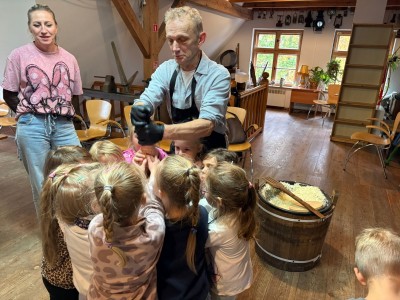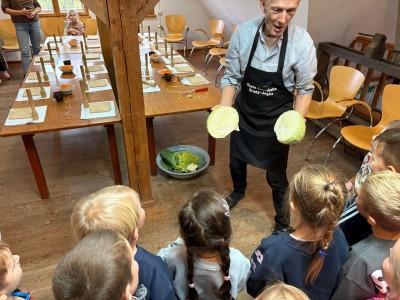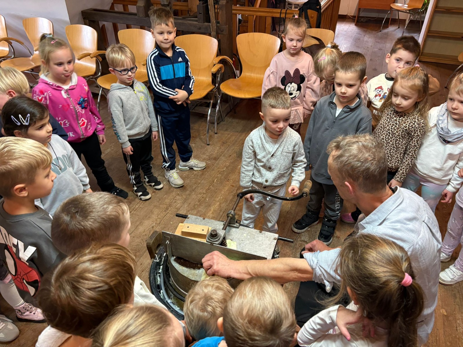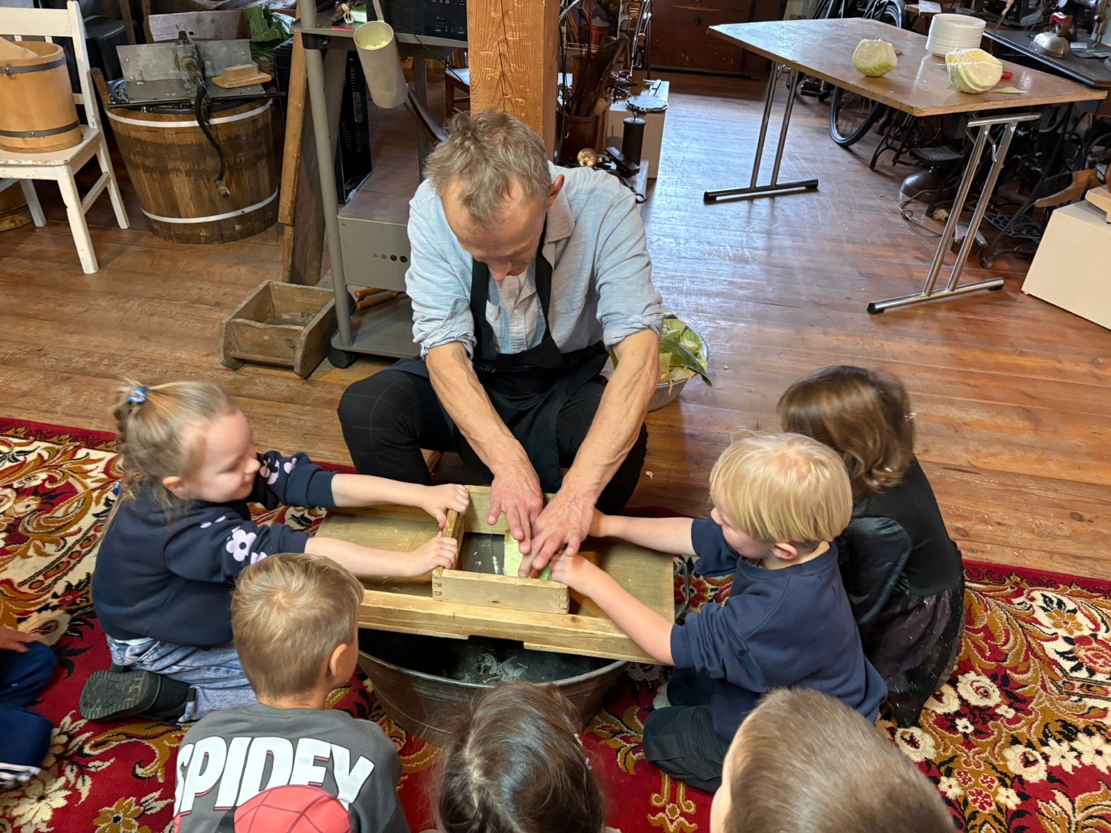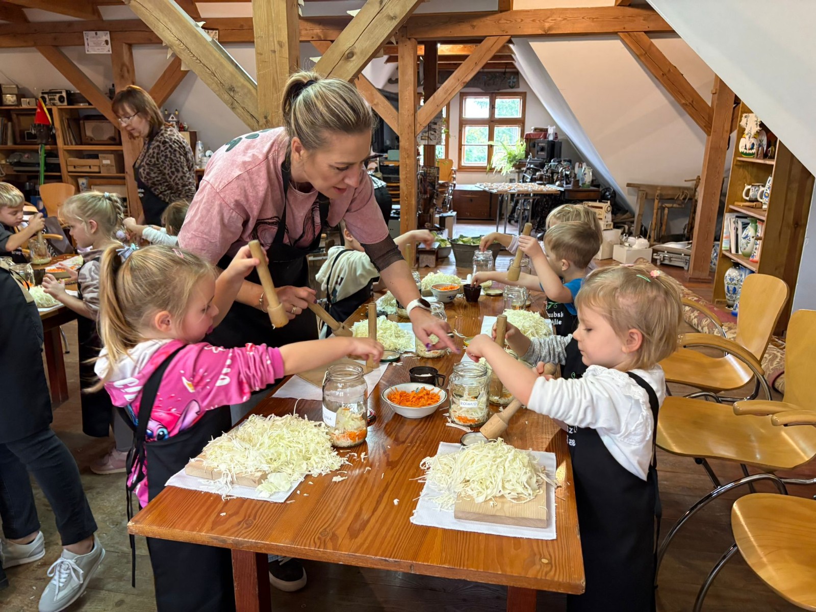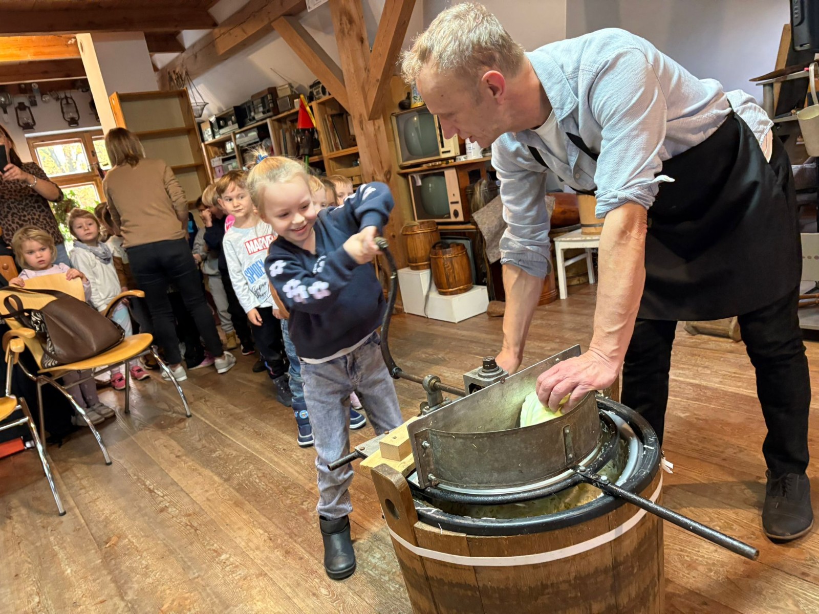 Podczas zajęć przedszkolaki poznały tradycje związane z kiszeniem kapusty – jednym z najbardziej znanych jesiennych zwyczajów na Kaszubach. Dzieci dowiedziały się, jak dawniej przygotowywano kapustę na zimę, zobaczyły tradycyjne narzędzia używane do jej szatkowania, a następnie same mogły spróbować swoich sił w ugniataniu i przyprawianiu kapusty.
