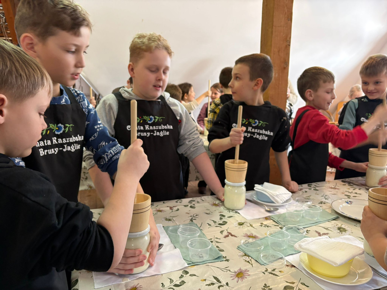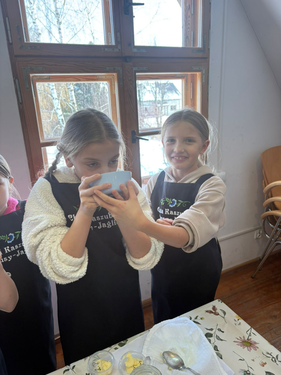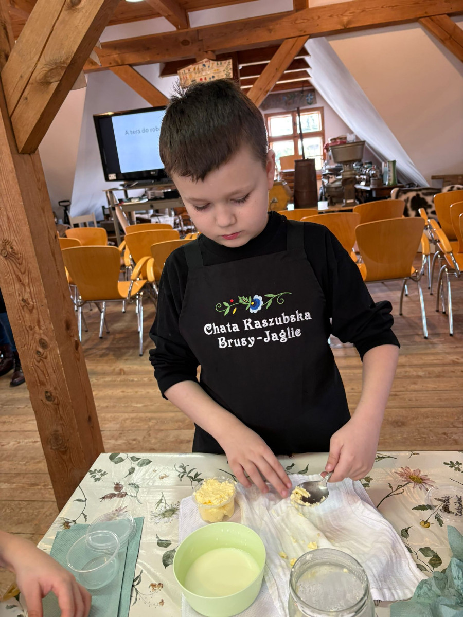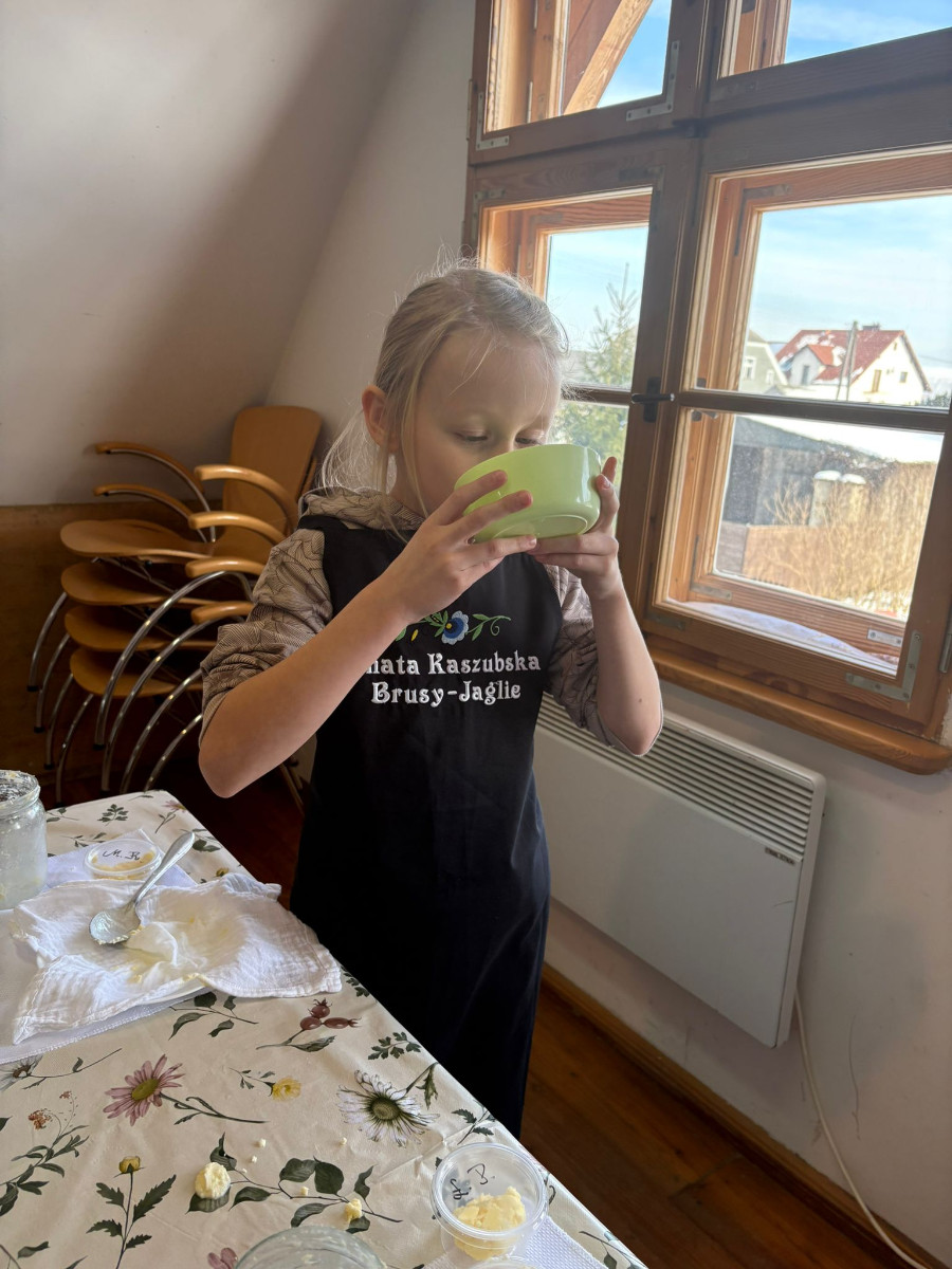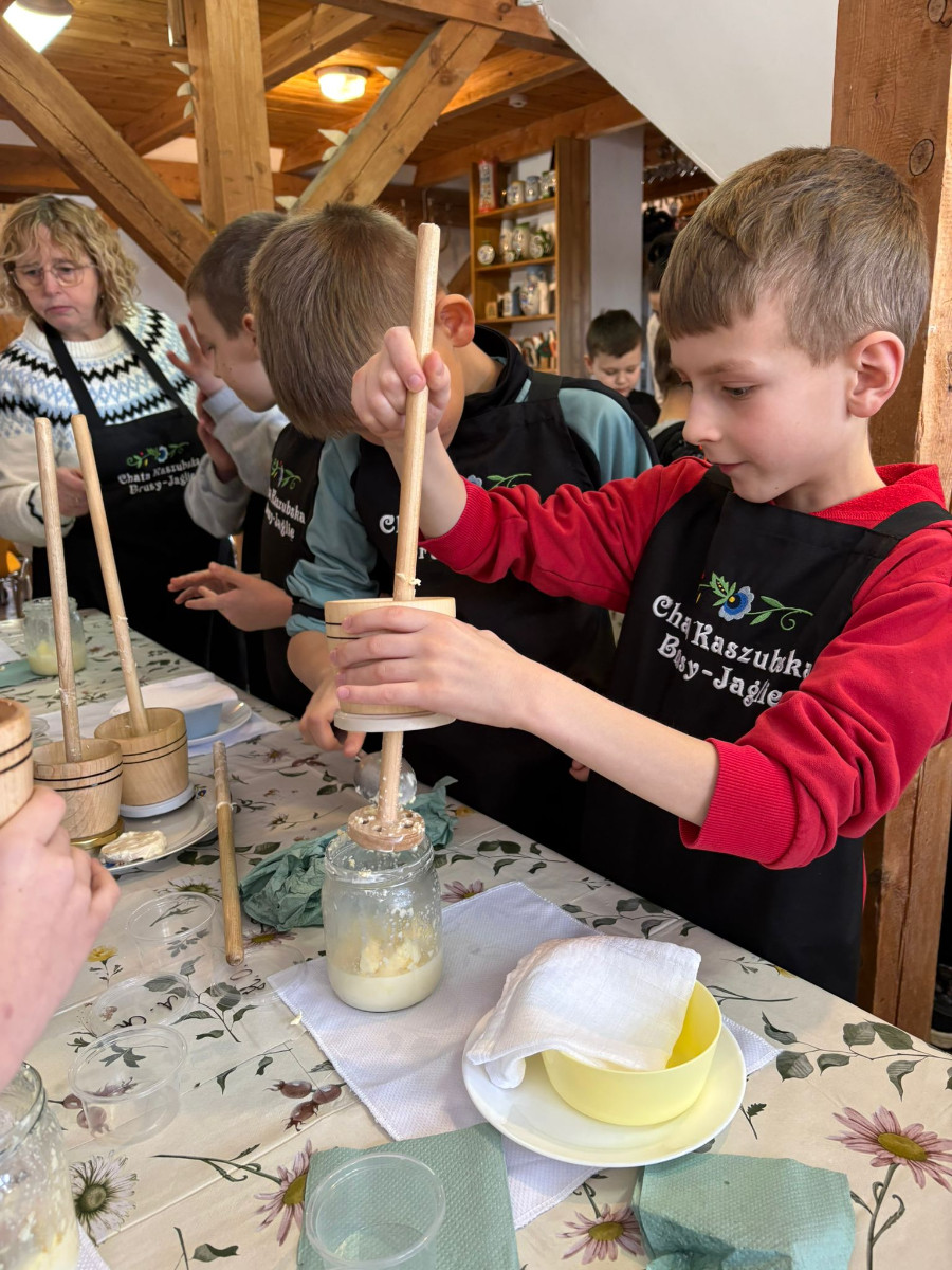 20 lutego 2026r. uczniowie klasy II b ze Szkoły Podstawowej nr 1 w Brusach wzięli udział w warsztatach regionalnych „Kaszubskie Maślenie”. Podczas zajęć dzieci poznały tradycyjny sposób wyrabiania masła – od ubijania śmietany aż po powstanie gotowego produktu.
