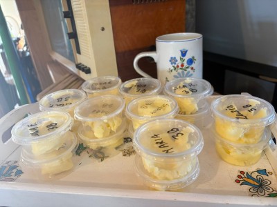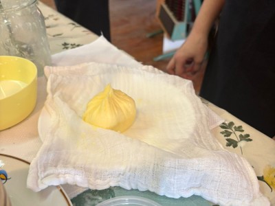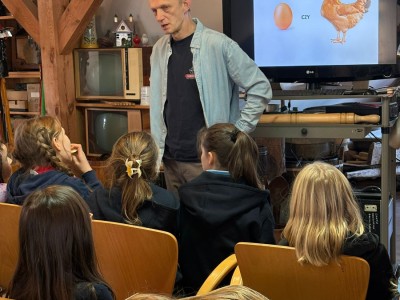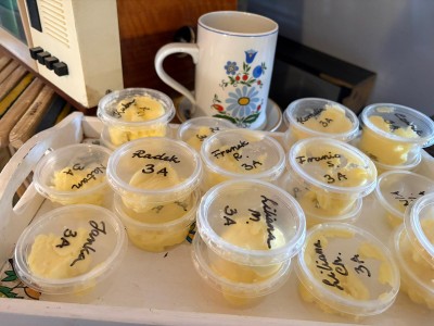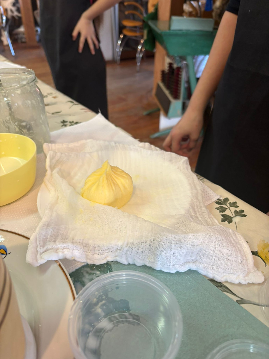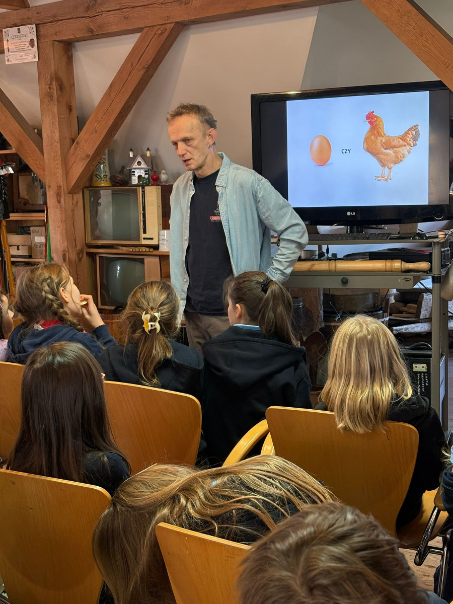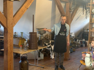 Podczas spotkania dzieci poznały dawny sposób wyrabiania masła – od ubijania śmietany aż po uzyskanie gotowego produktu. Uczniowie z dużym zaangażowaniem uczestniczyli w zajęciach, ucząc się poprzez działanie i wspólną zabawę.