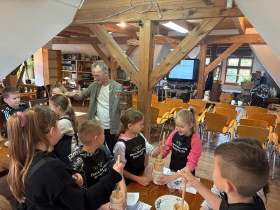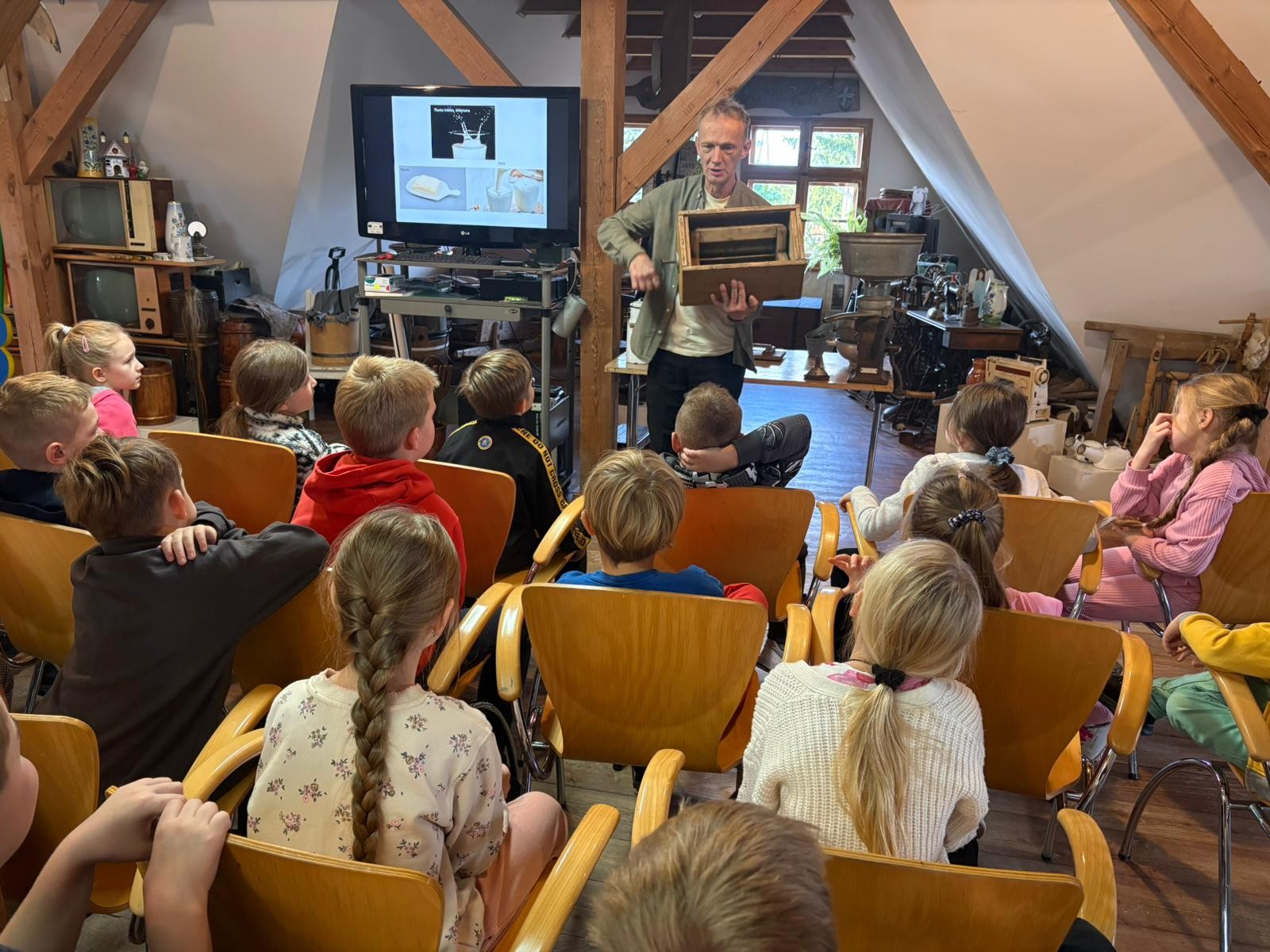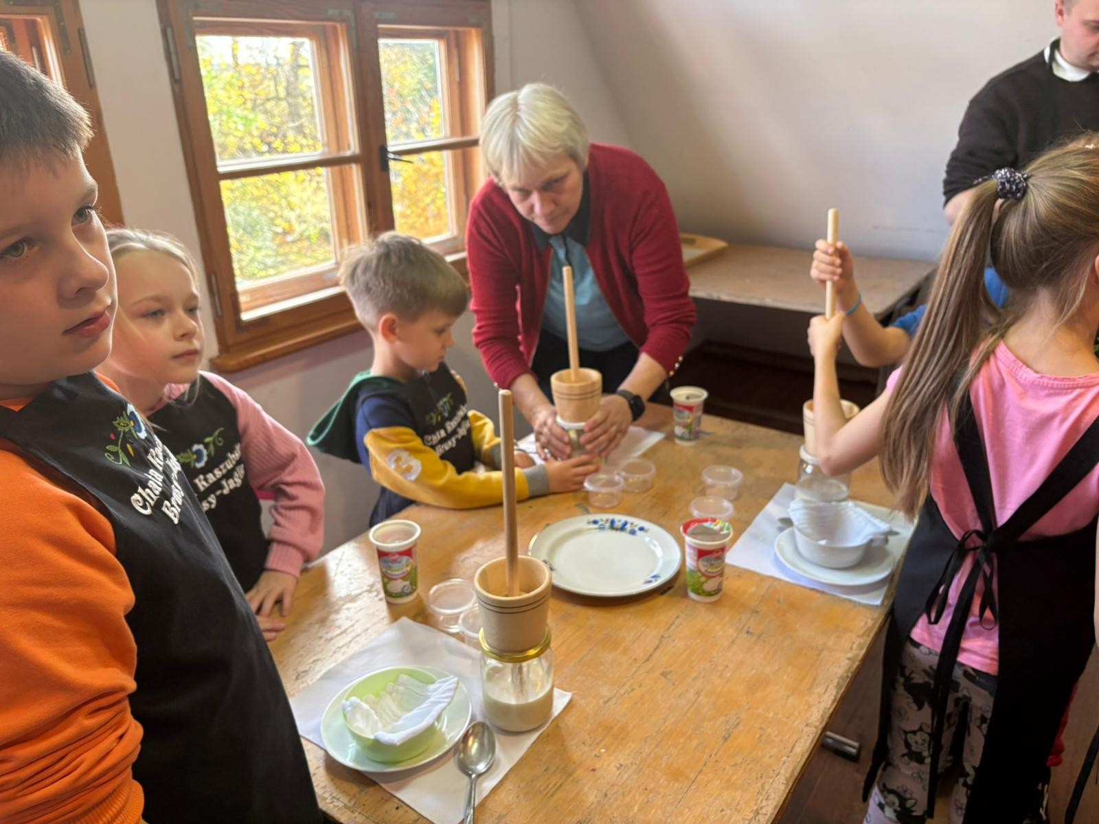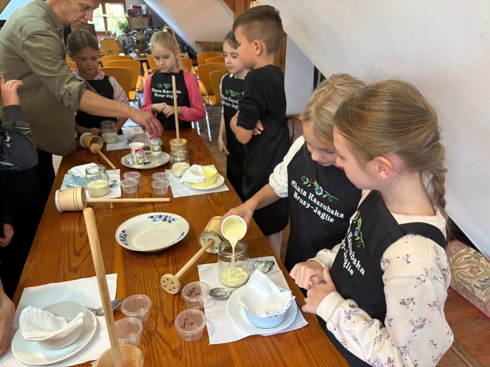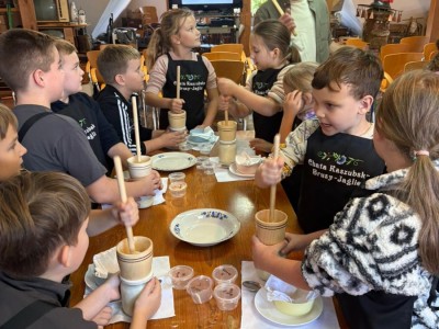 Podczas zajęć dzieci poznały tradycyjny sposób wyrabiania masła – od ubijania śmietany aż po powstanie gotowego produktu. Uczniowie z dużym zaangażowaniem uczestniczyli w każdym etapie pracy, a własnoręcznie przygotowane masło zabrali do domu.