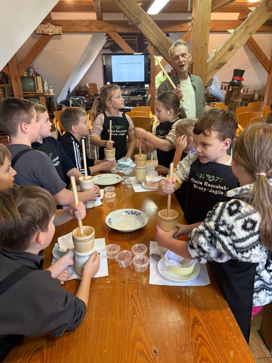 31 października 2025 roku uczniowie klasy 2a ze Szkoły Podstawowej nr 1 w Brusach wzięli udział w warsztatach regionalnych „Kaszubskie Maślenie”, które odbyły się w Chacie Kaszubskiej w Brusach Jagliach.