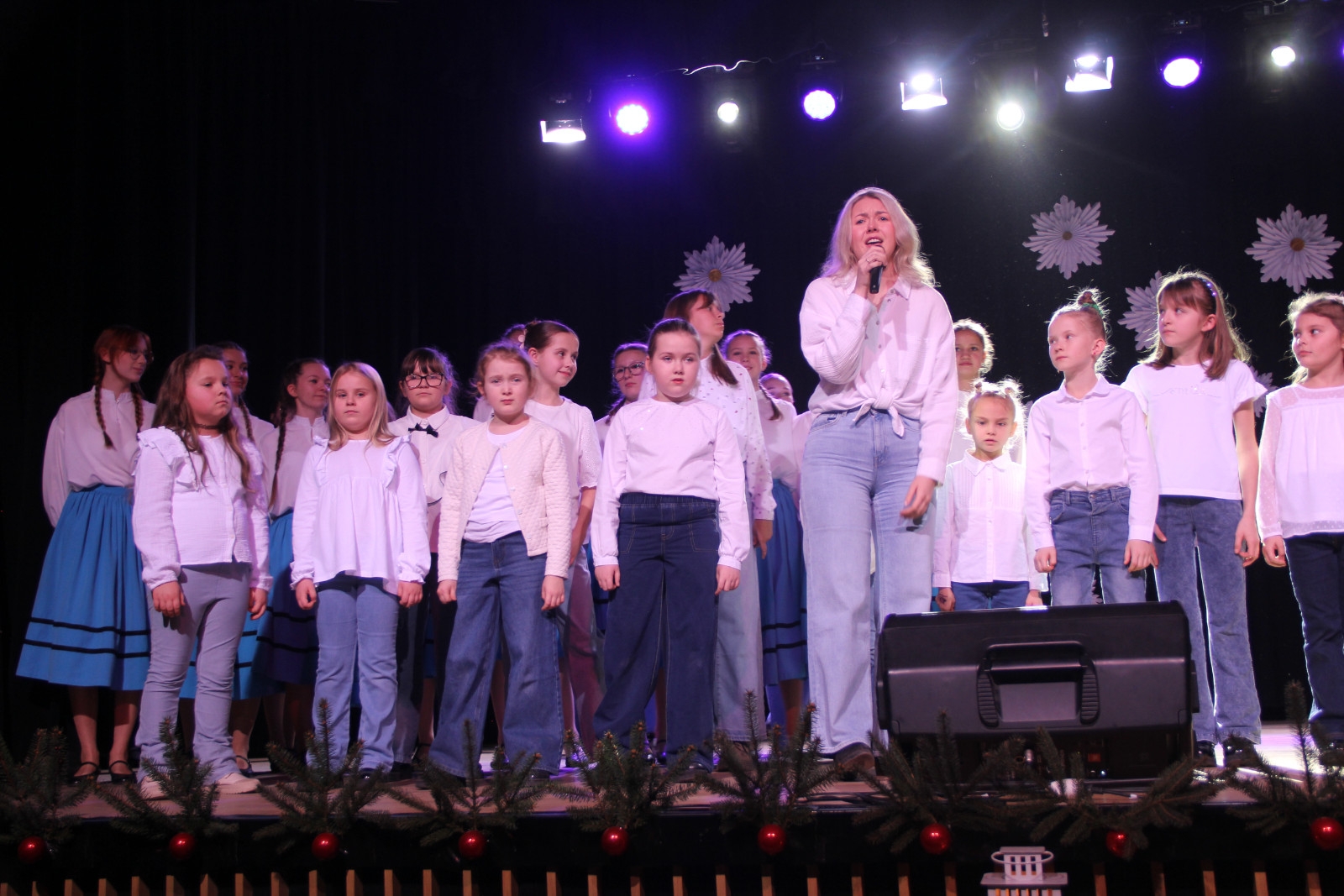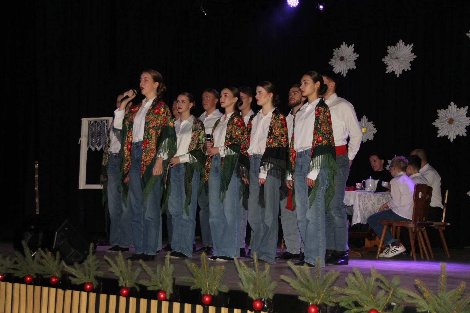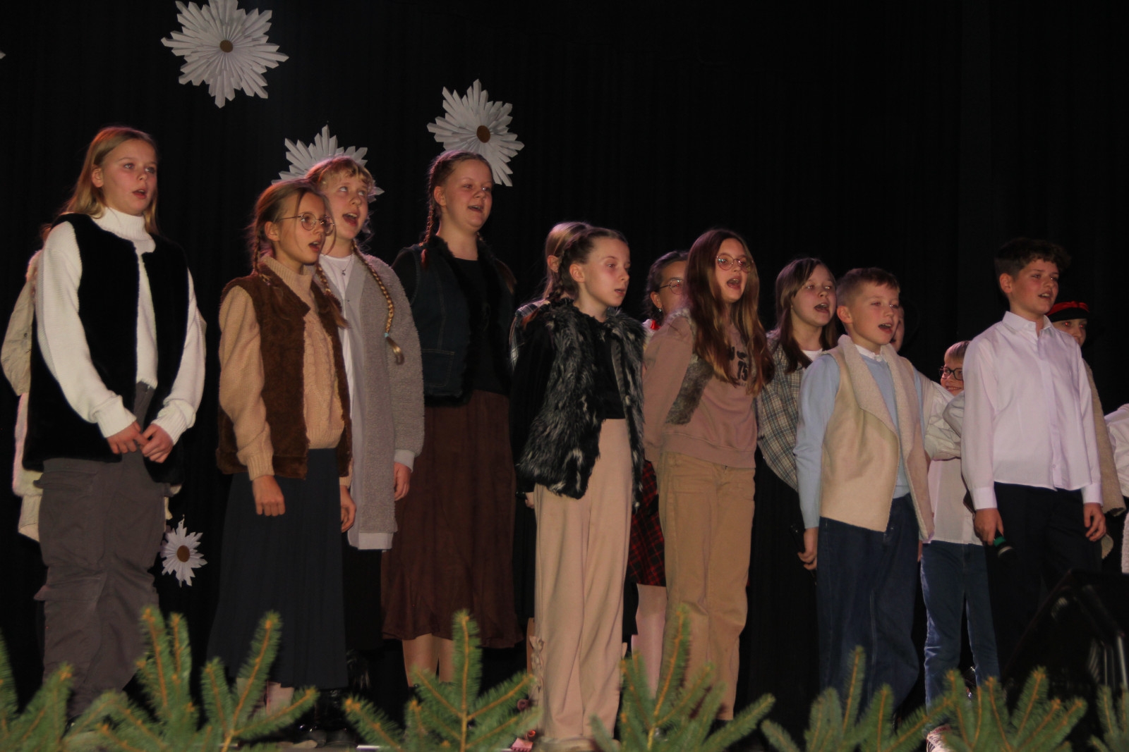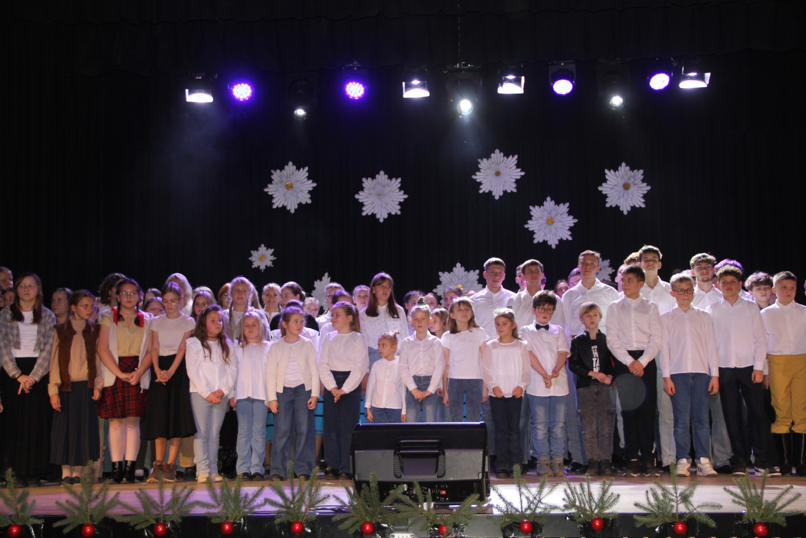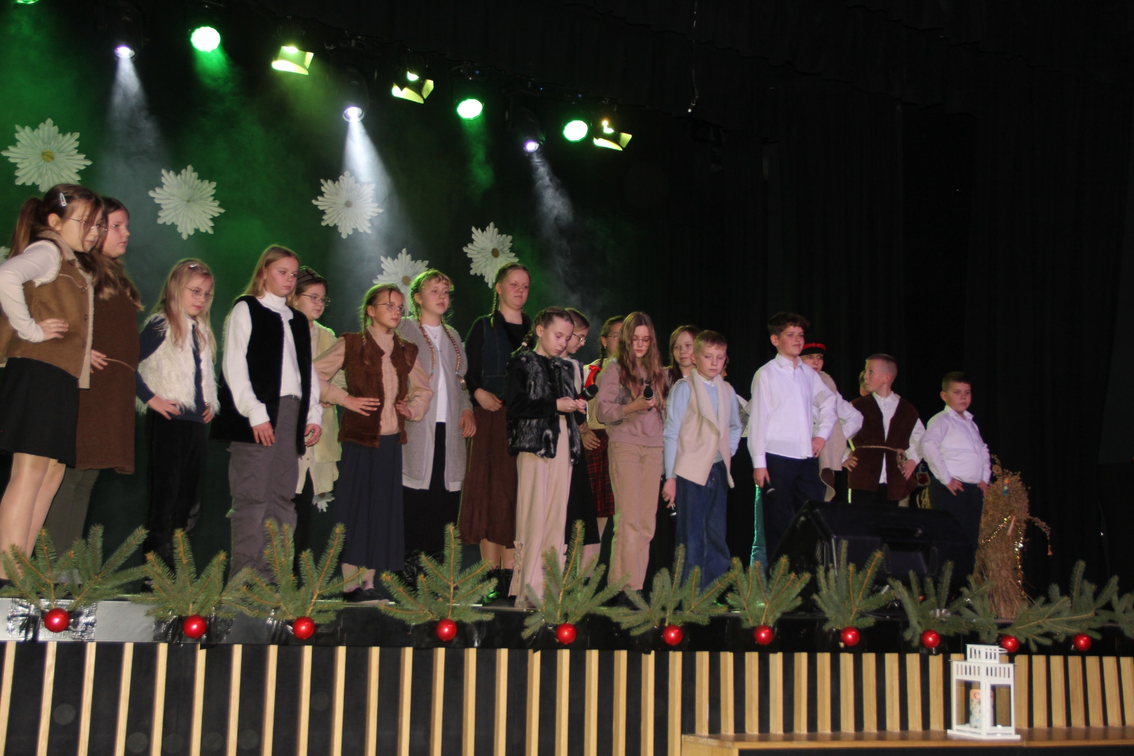 Scenariusz prowadził publiczność przez kolejne etapy tradycyjnego Adwentu – od andrzejek, poprzez roraty i mikołajki, aż po Wigilię, wspólne kolędowanie i pasterkę. Koncert wzbogacały scenki obyczajowe inspirowane dawnymi zwyczajami, pełne ciepła i humoru dialogi narratorów oraz wspomnienia tradycji przekazywanych z pokolenia na pokolenie. Integralną częścią były liczne utwory muzyczne i kolędy, które podkreślały kaszubskie dziedzictwo kulturowe oraz rodzinny charakter świąt. Całość tworzyła spójna opowieść o radości wspólnego przeżywania, bliskości i wzajemnej życzliwości a finał koncertu niósł uniwersalne przesłanie o miłości, wspólnocie i nadziei – wartościach, które w sposób szczególny ujawniają się w czasie Bożego Narodzenia i łączą wszystkich, niezależnie od wieku. Była to doskonała okazja, by na chwilę zwolnić tempo, spotkać się w gronie bliskich i wspólnie poczuć prawdziwego ducha nadchodzących świąt.