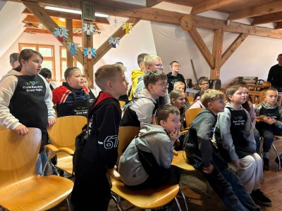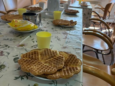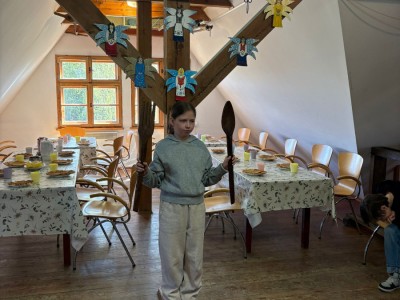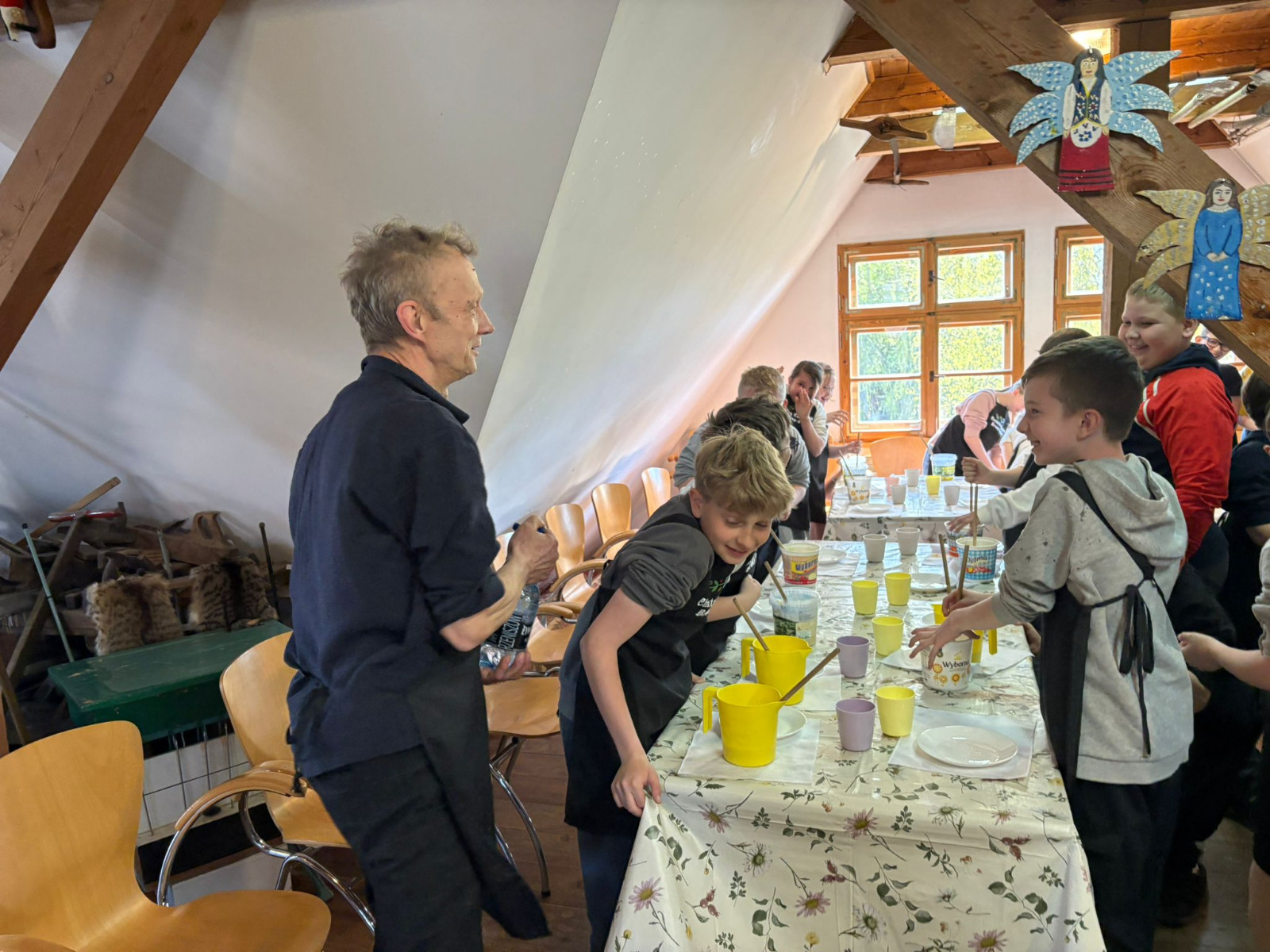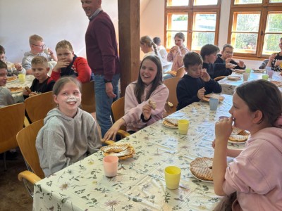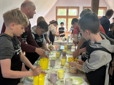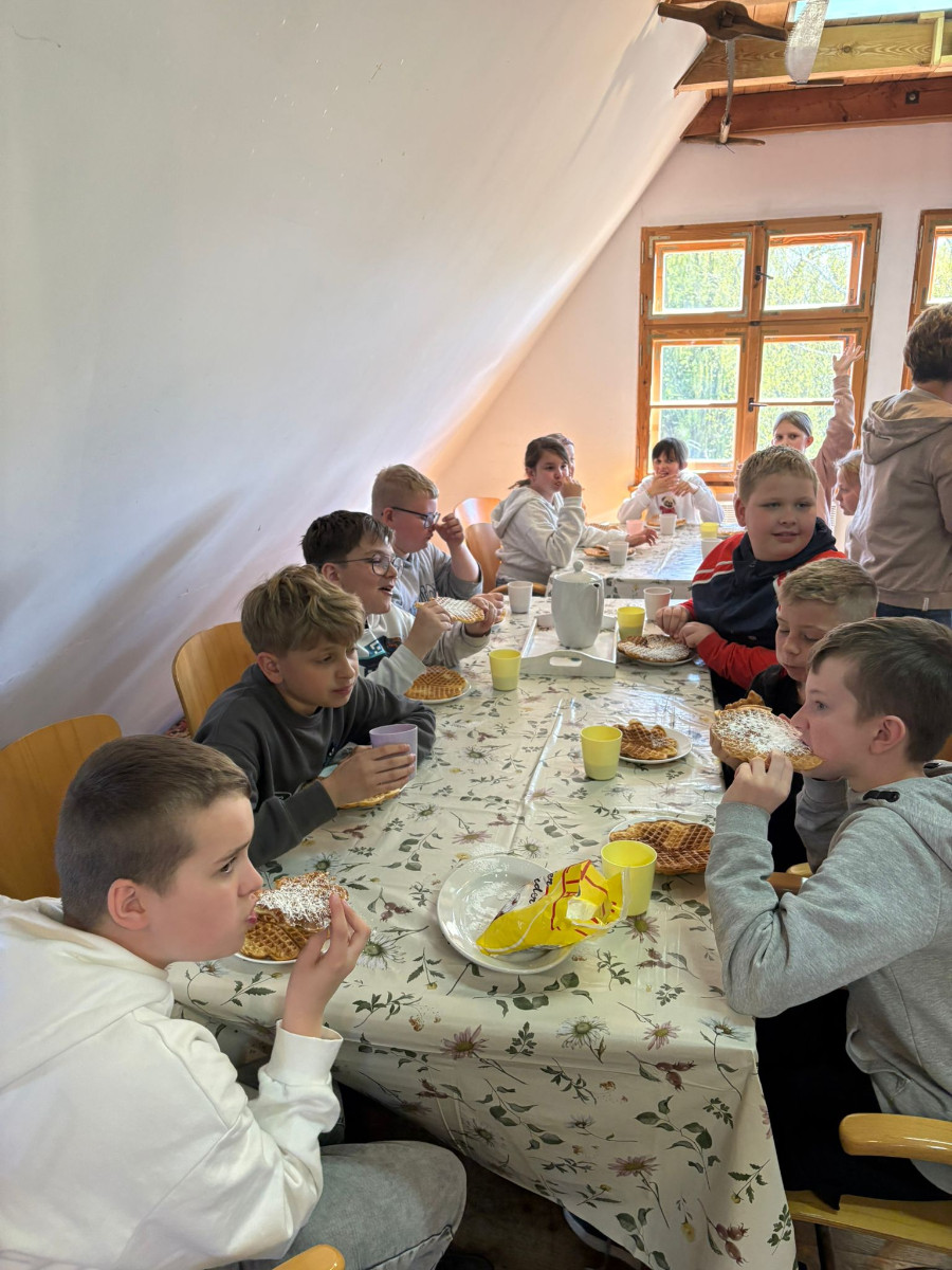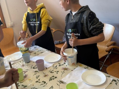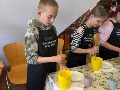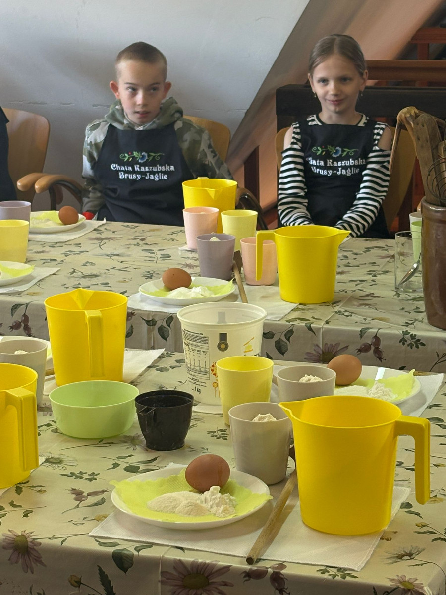 Podczas zajęć dzieci miały okazję poznać dawne zwyczaje kaszubskie oraz tradycyjne metody przygotowywania wafli nad ogniem. Z dużym zaangażowaniem brały udział w pokazie, a następnie samodzielnie próbowały swoich sił w wypieku. Warsztaty były interesującą lekcją regionalnej kultury i pozwoliły uczestnikom poczuć klimat dawnych czasów.
