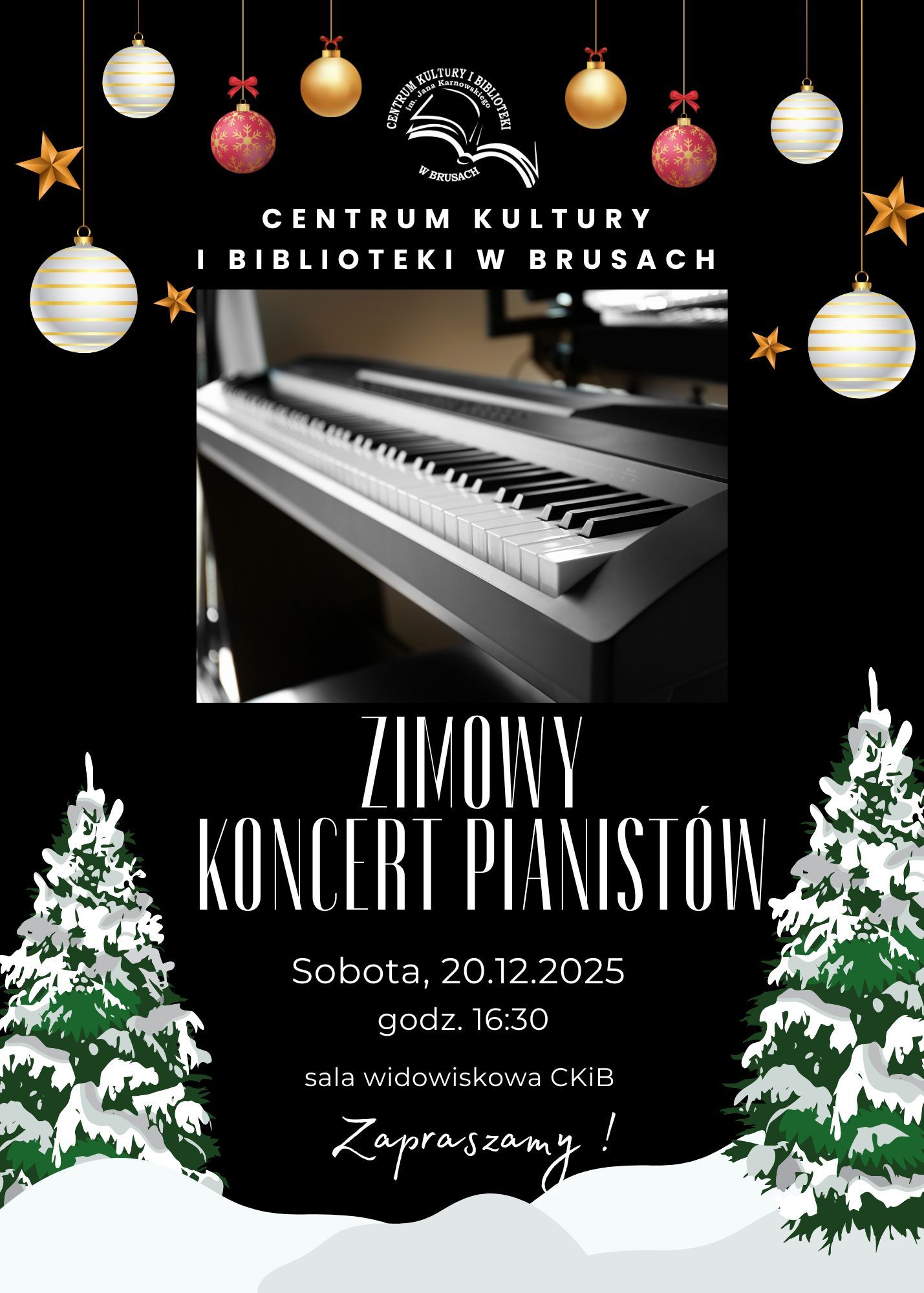 Centrum Kultury i Biblioteki im. Jana Karnowskiego w Brusach serdecznie zaprasza na Zimowy Koncert Pianistów, który odbędzie się 20 grudnia o godzinie 16:30 w sali widowiskowej CKiB.