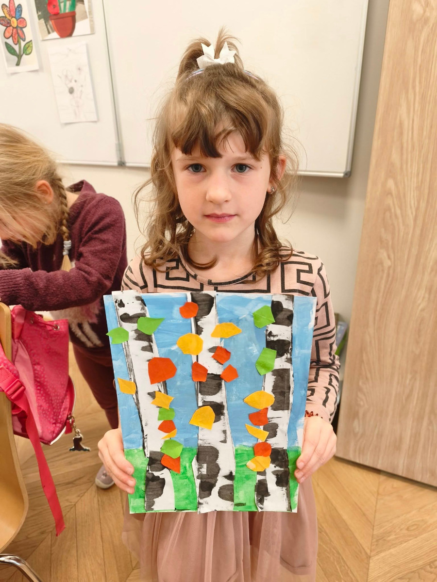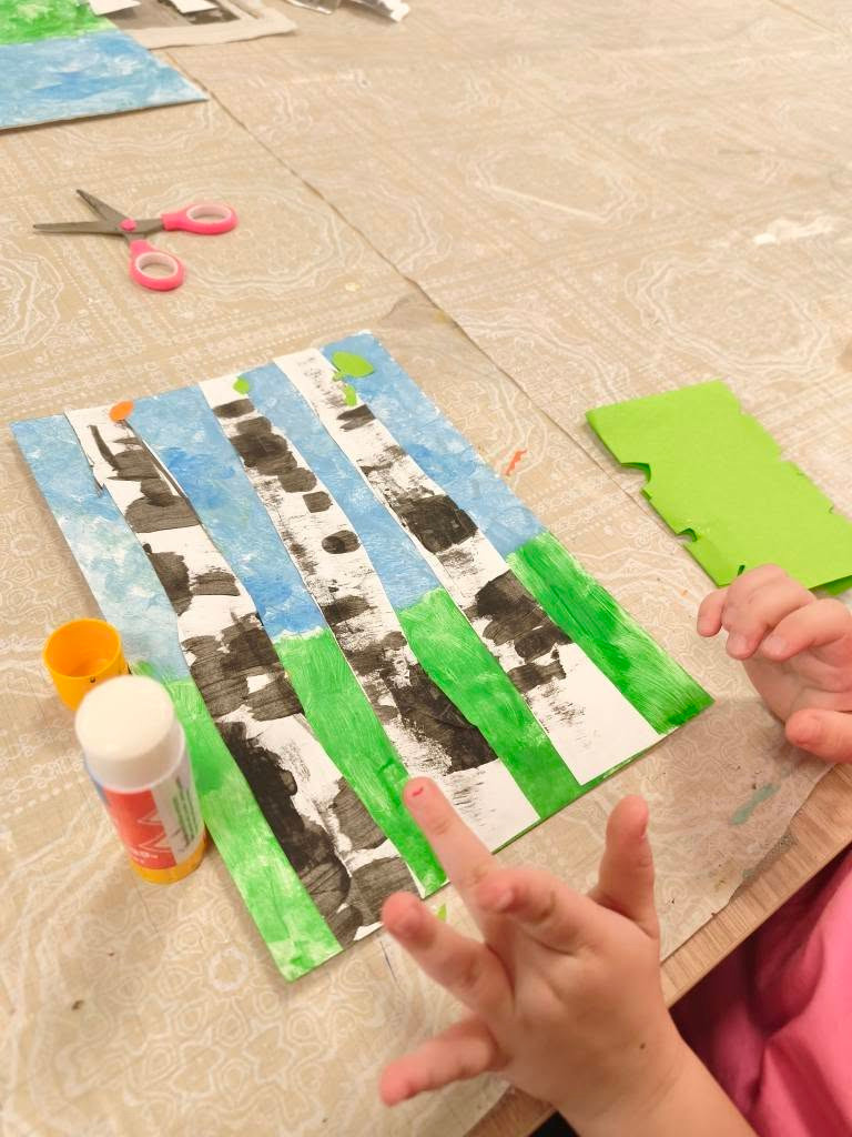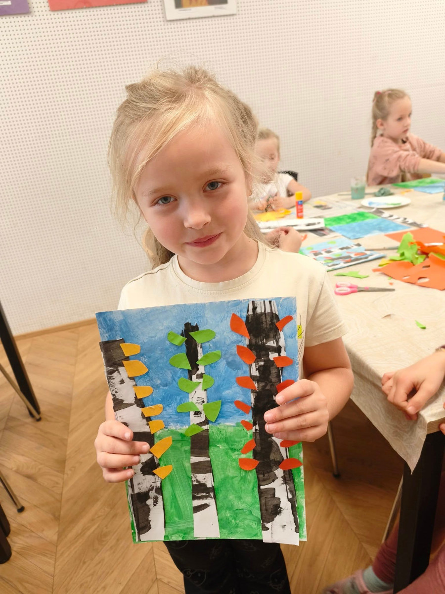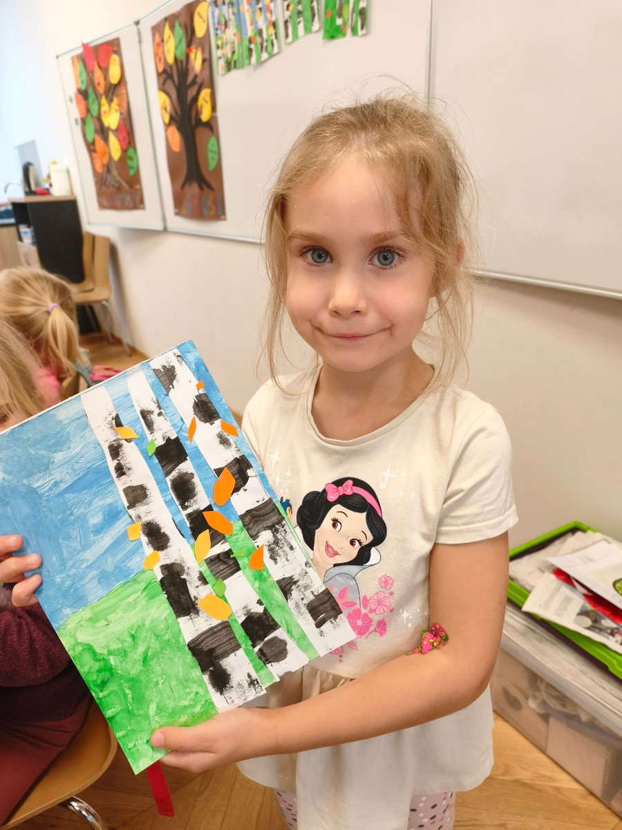 Pierwszym krokiem ich pracy było pomalowanie kartki na niebiesko i zielono, tak aby powstało tło przedstawiające niebo i trawę. Gdy kartka schła, dzieci zabrały się za przygotowanie pni drzew – na białej kartce robiły kleksy z czarnej farby, a następnie rozcierały je krawędzią tekturki, tworząc ciekawe faktury przypominające korę. Gotowe pnie wycinały i przyklejały na wcześniej przygotowane tło.
