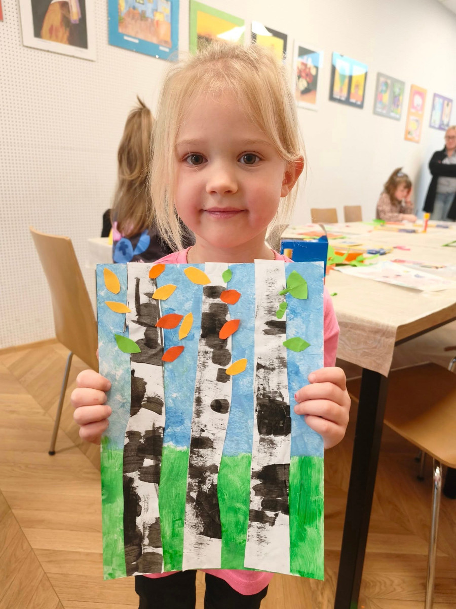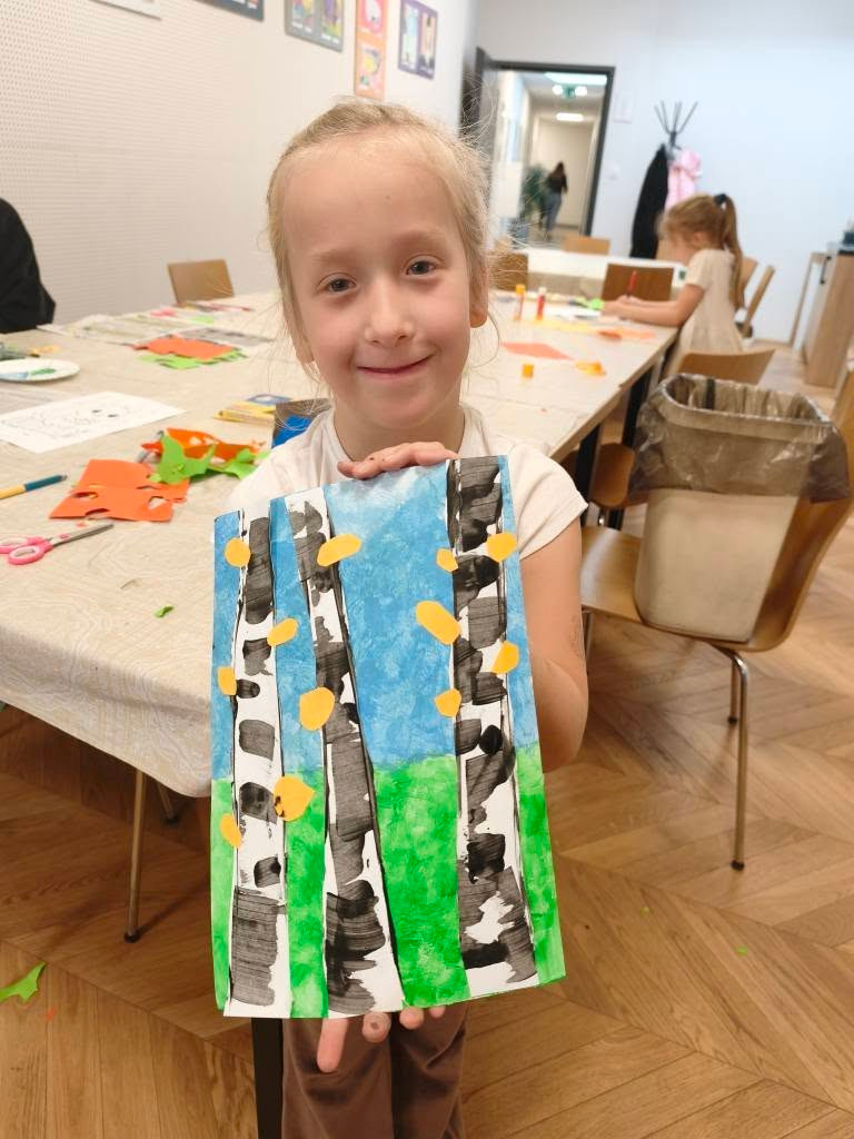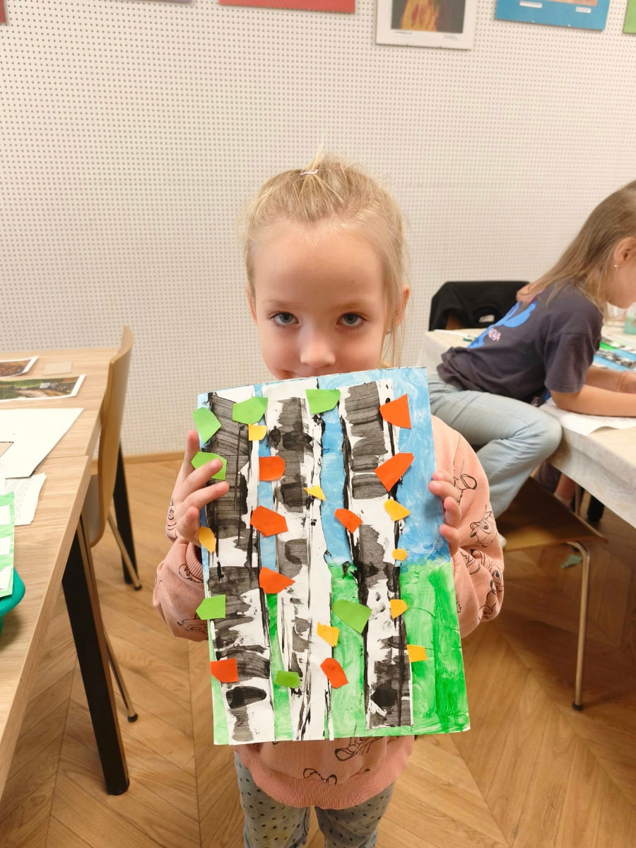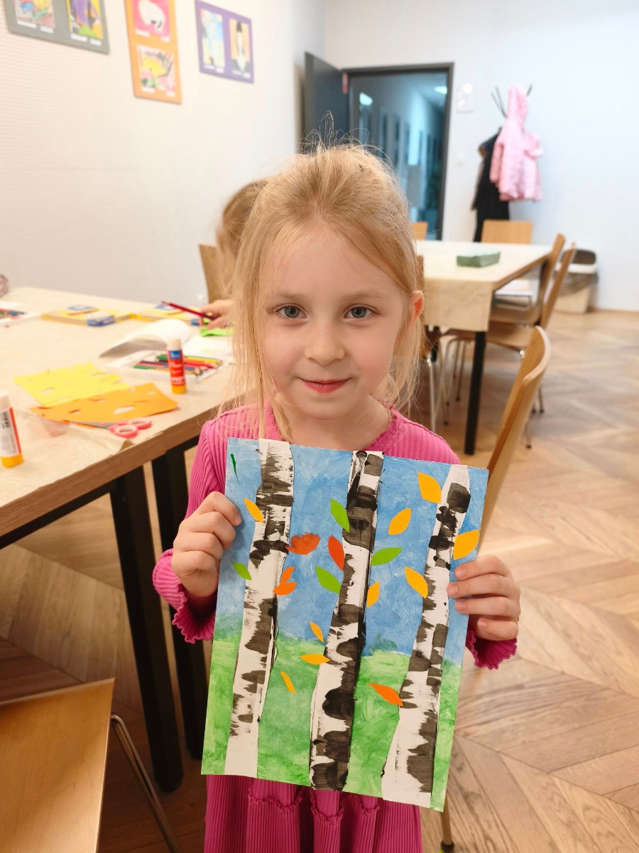 Pierwszym krokiem ich pracy było pomalowanie kartki na niebiesko i zielono, tak aby powstało tło przedstawiające niebo i trawę. Gdy kartka schła, dzieci zabrały się za przygotowanie pni drzew – na białej kartce robiły kleksy z czarnej farby, a następnie rozcierały je krawędzią tekturki, tworząc ciekawe faktury przypominające korę. Gotowe pnie wycinały i przyklejały na wcześniej przygotowane tło.