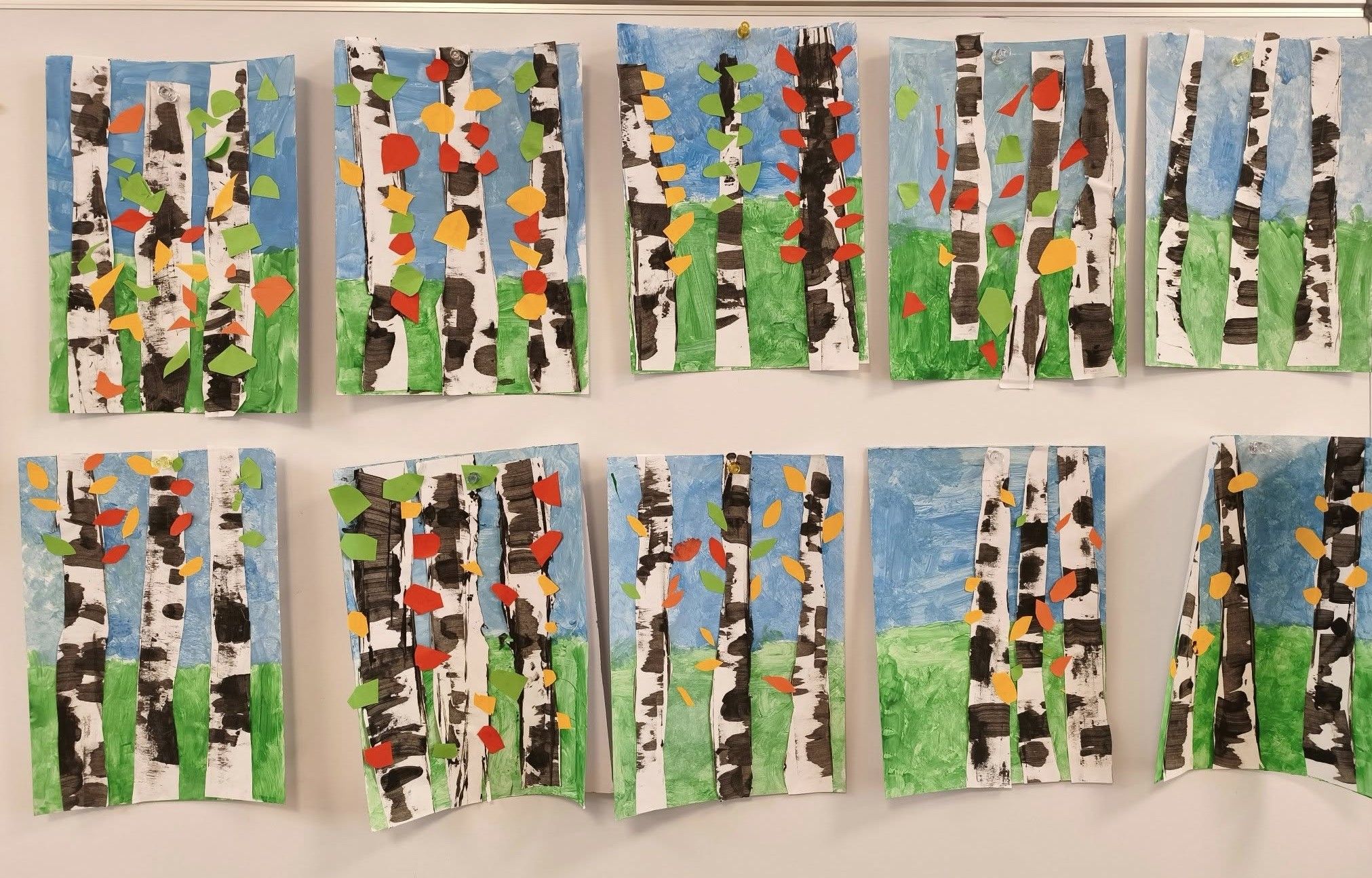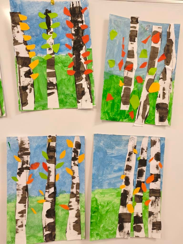 Ostatnim etapem było doklejenie jesiennych listków – w ciepłych, intensywnych barwach żółci, pomarańczy i czerwieni. Dzięki temu prace nabrały życia i oddały urok jesiennego krajobrazu.