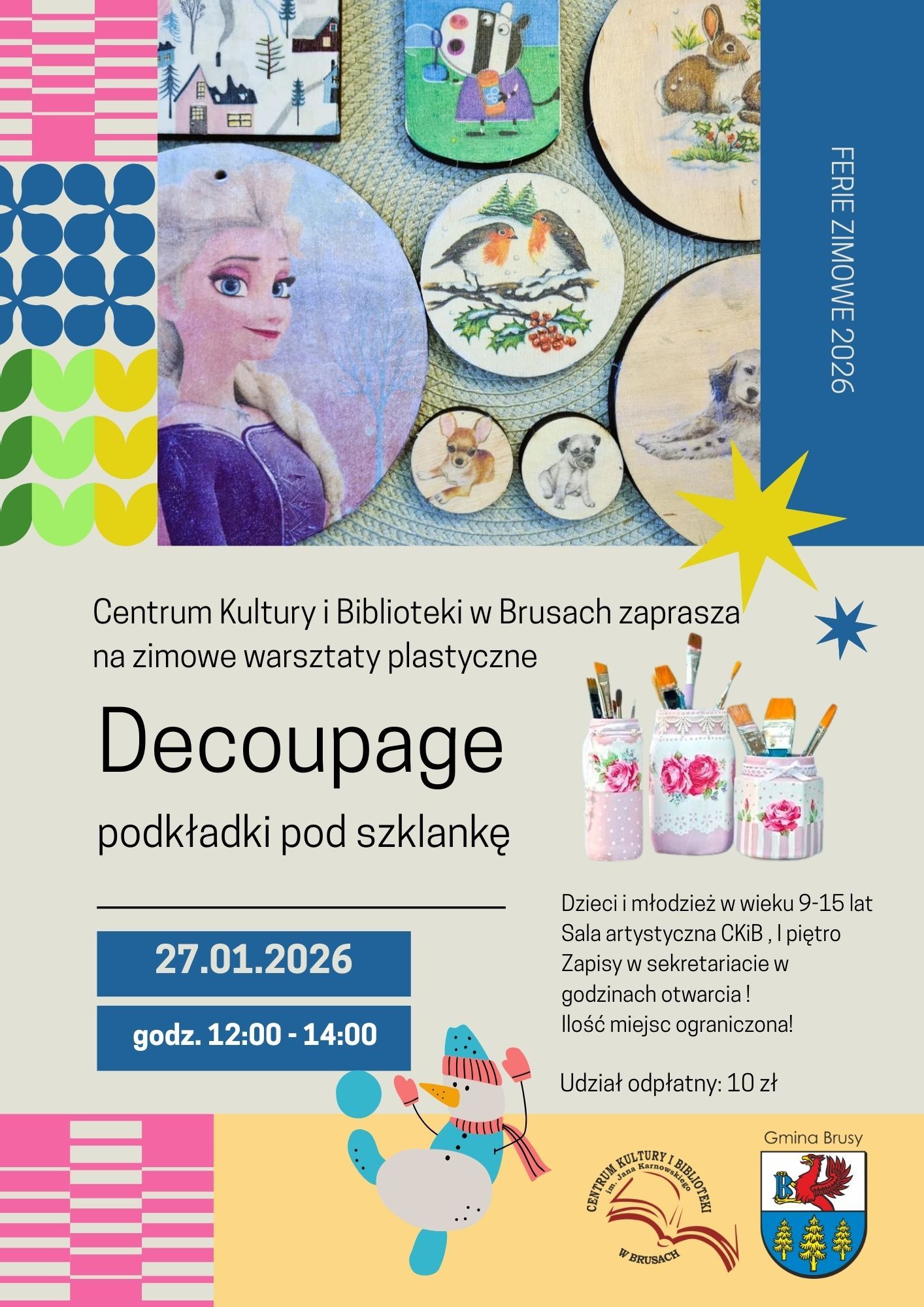 Centrum Kultury i Biblioteki w Brusach zaprasza dzieci i młodzież w wieku 9–15 lat na kreatywne zajęcia plastyczne, podczas których uczestnicy wykonają własnoręczne podkładki pod szklankę metodą decoupage. Zajęcia odbędą się w czasie ferii zimowych i będą doskonałą okazją do rozwijania wyobraźni, zdolności manualnych oraz poznania ciekawej techniki plastycznej.