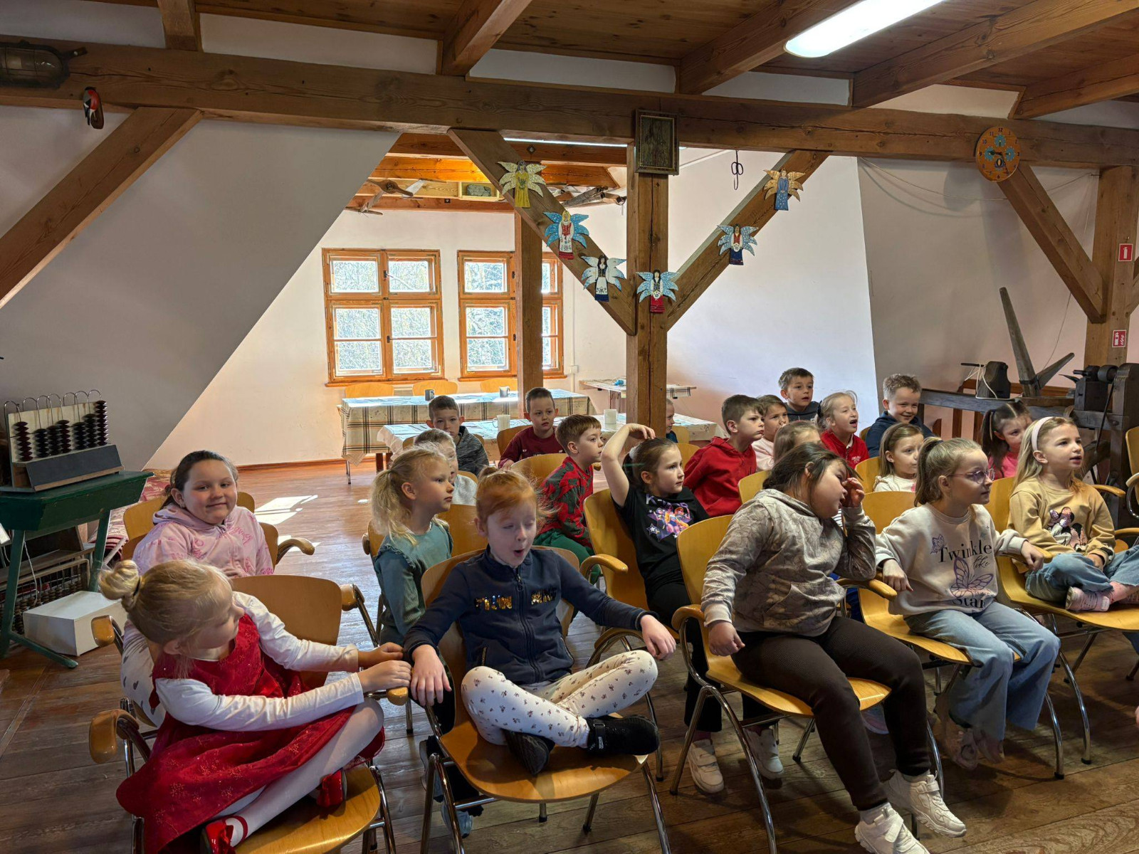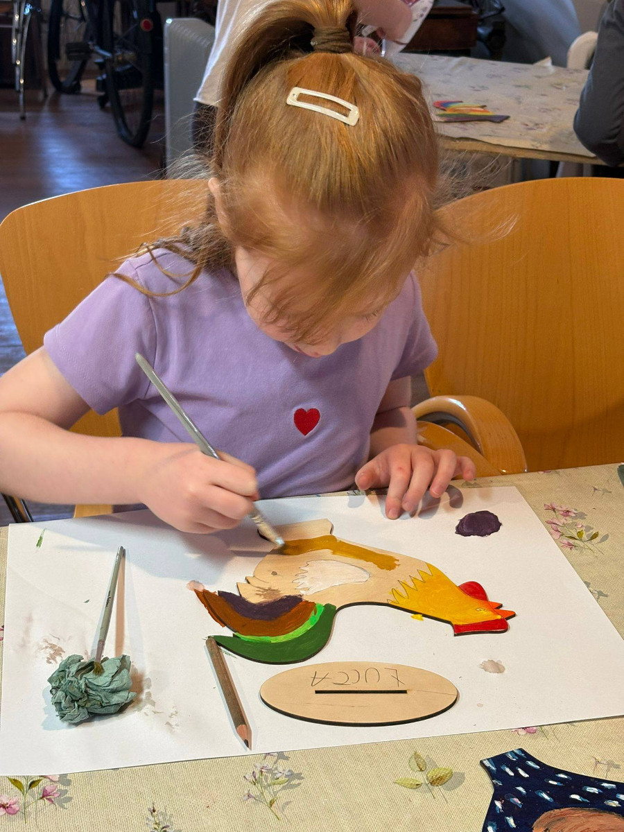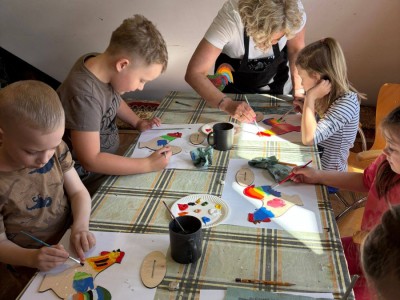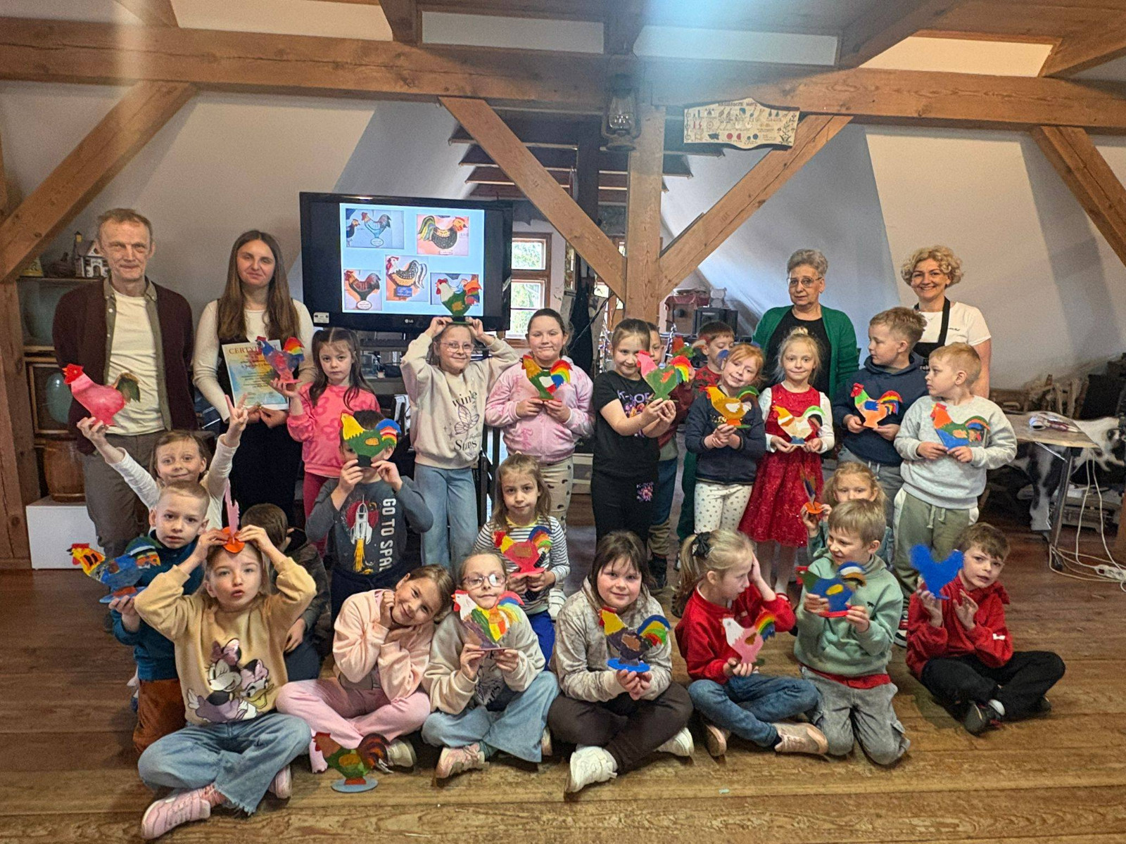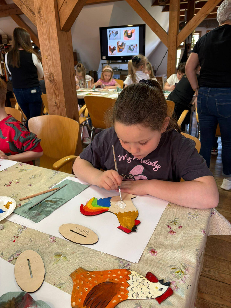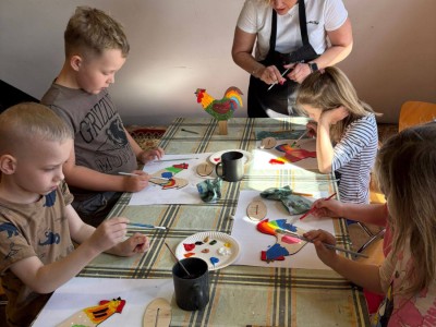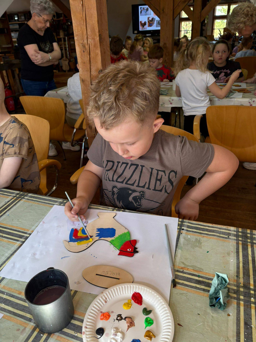 W trakcie zajęć dzieci usłyszały o znaczeniu koguta w regionalnej symbolice oraz poznały charakterystyczne motywy zdobnicze. Następnie przystąpiły do części praktycznej, podczas której samodzielnie malowały drewniane koguty farbami akrylowymi. Powstałe prace zachwycały kolorami i pomysłowością.