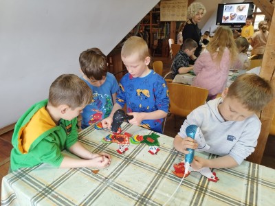 Warsztaty rozpoczęły się od krótkiej rozmowy na temat koguta – jego wyglądu, zwyczajów oraz roli, jaką odgrywa w wiejskim gospodarstwie i tradycji ludowej. Następnie dzieci z zapałem przystąpiły do części plastycznej, w której samodzielnie ozdabiały drewniane koguciki, używając kolorowych farb akrylowych.